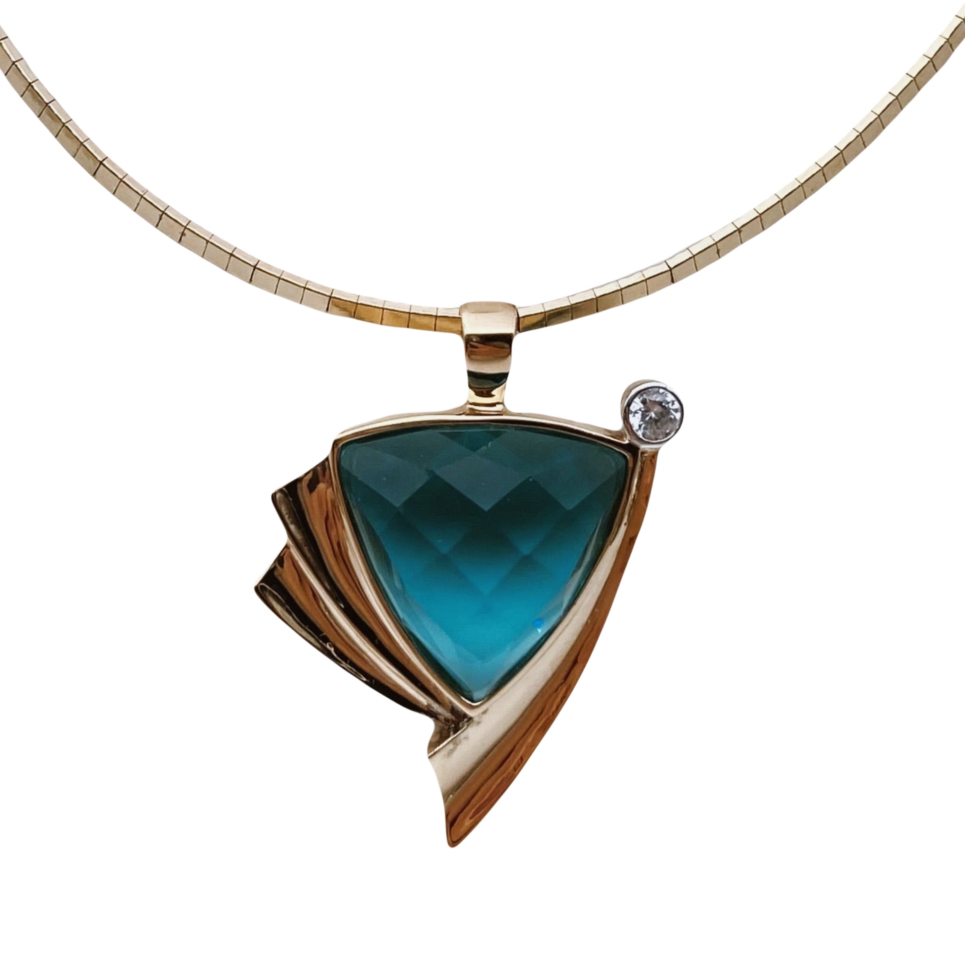 Šis vėrinys – elegantiškas, modernistinio stiliaus pakabuko ir grandinėlės komplektas iš 925 prabos sidabro. Trikampio formos briaunuotas žydras kvarcas / kvarco stiklas, krašte – skaidrus kristalas. Art deco įkvėptas dizainas, dinamiškų formų, asimetriškas. Grandinėlė pagaminta iš 925 prabos sidabro, pažymėta 925 ITALY, plokščia „box snake“ stiliaus grandinėlė – tipiška aukštos kokybės itališkai gamybai. Pakabukas, pagamintas Kinijoje, iš 925 prabos sidabro.
