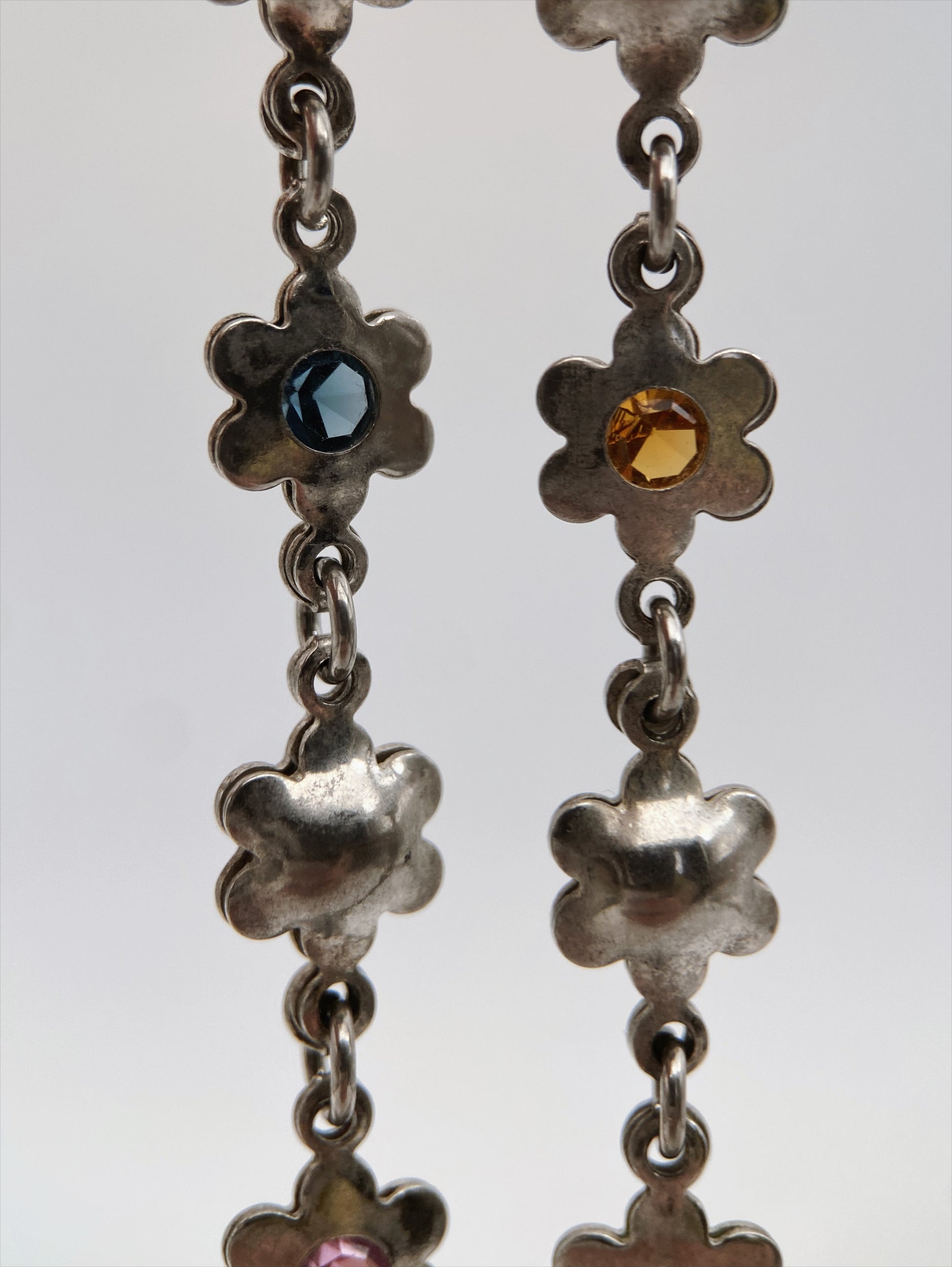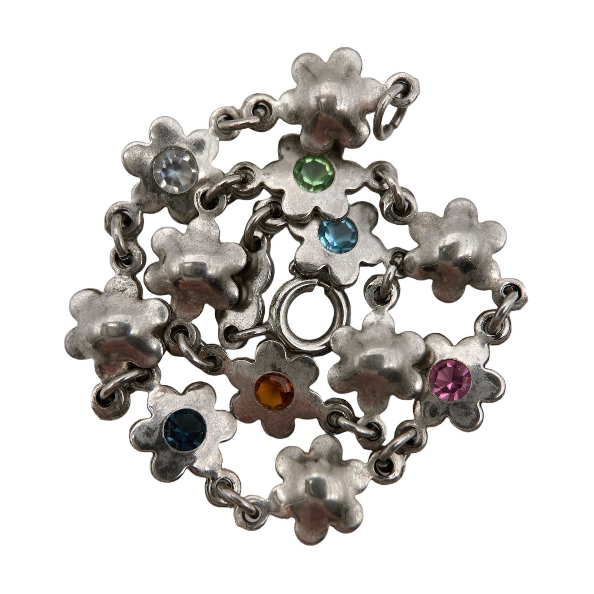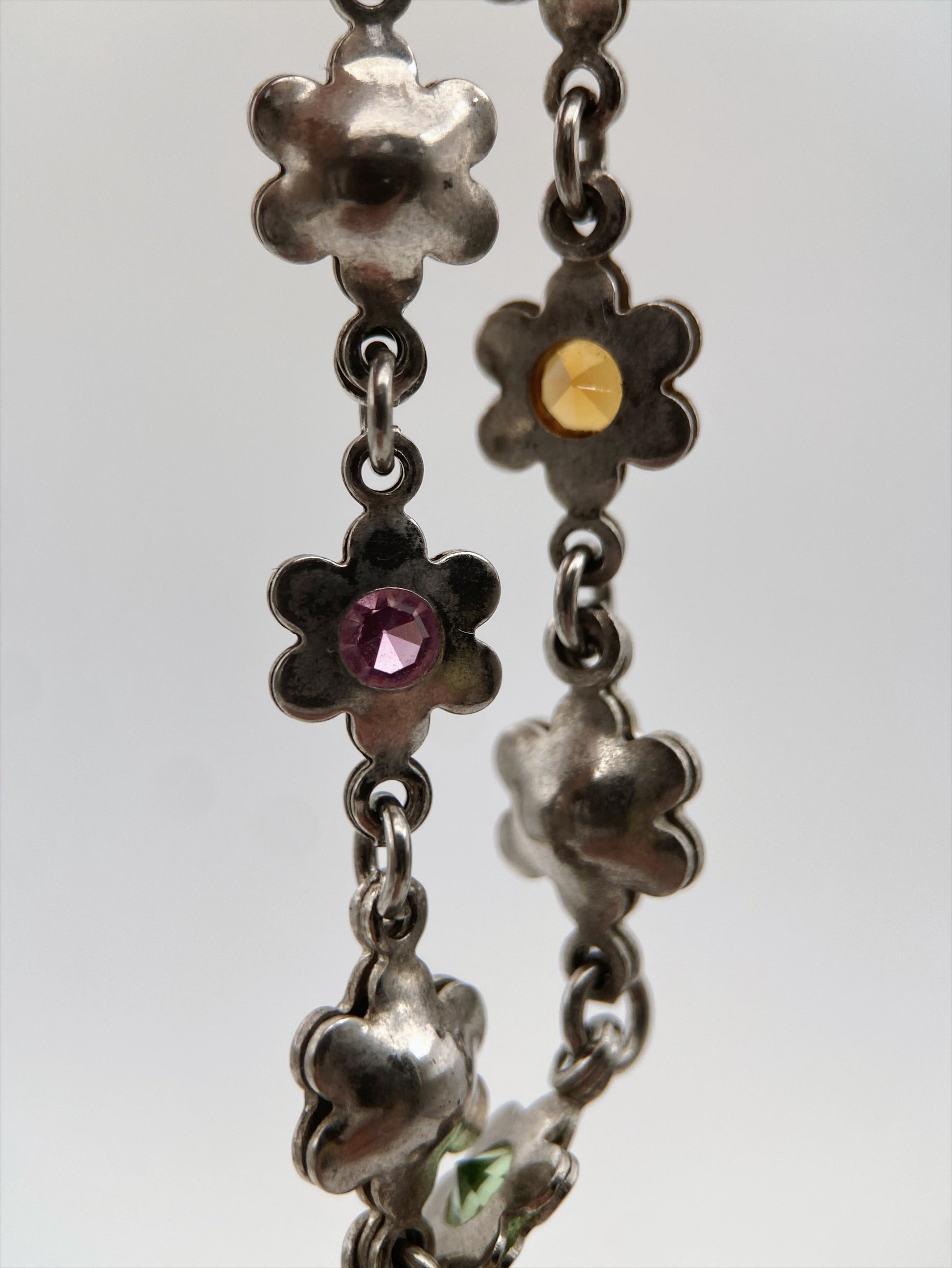 Vintažinė 925 prabos sidabrinė apyrankė, sudaryta iš gėlytės formos narelių, dekoruotų spalvotais kristalais. Klasikinis, žaismingas dizainas, būdingas XX a. pabaigos sidabriniams papuošalams. Prekės kodas: RF085