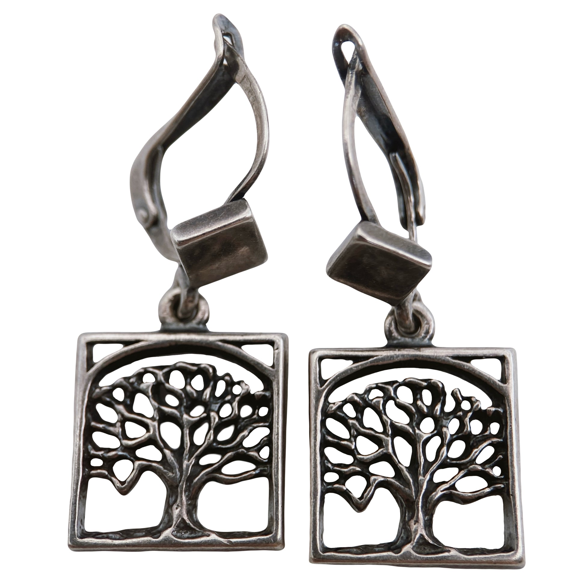 Elegantiški rankų darbo auskarai, pagaminti iš sidabro. Kabančios kvadratinės formos plokštelės dekoruotos išraižytu „Gyvybės medžio“ motyvu, simbolizuojančiu stiprybę, dvasinį augimą ir ryšį tarp žemės ir dangaus. Sidabro paviršius turi natūralią patiną, suteikiančią papuošalui išraiškingumo ir senovinio žavesio.