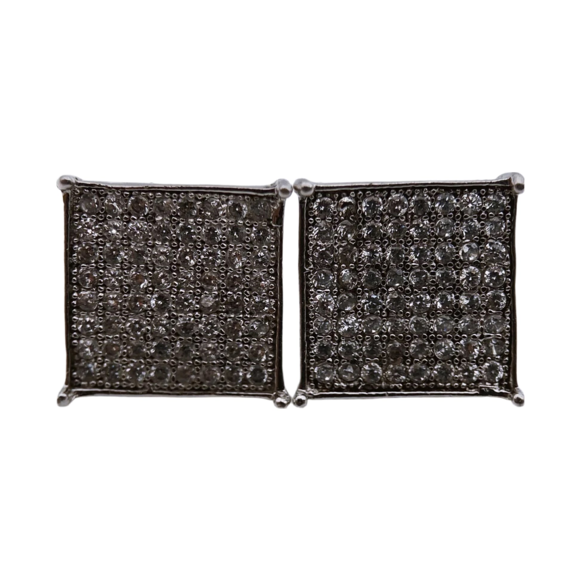 Šie kvadratiniai sidabro auskarai yra tankiai inkrustuoti mažais skaidriais akmenukais – cirkoniais.