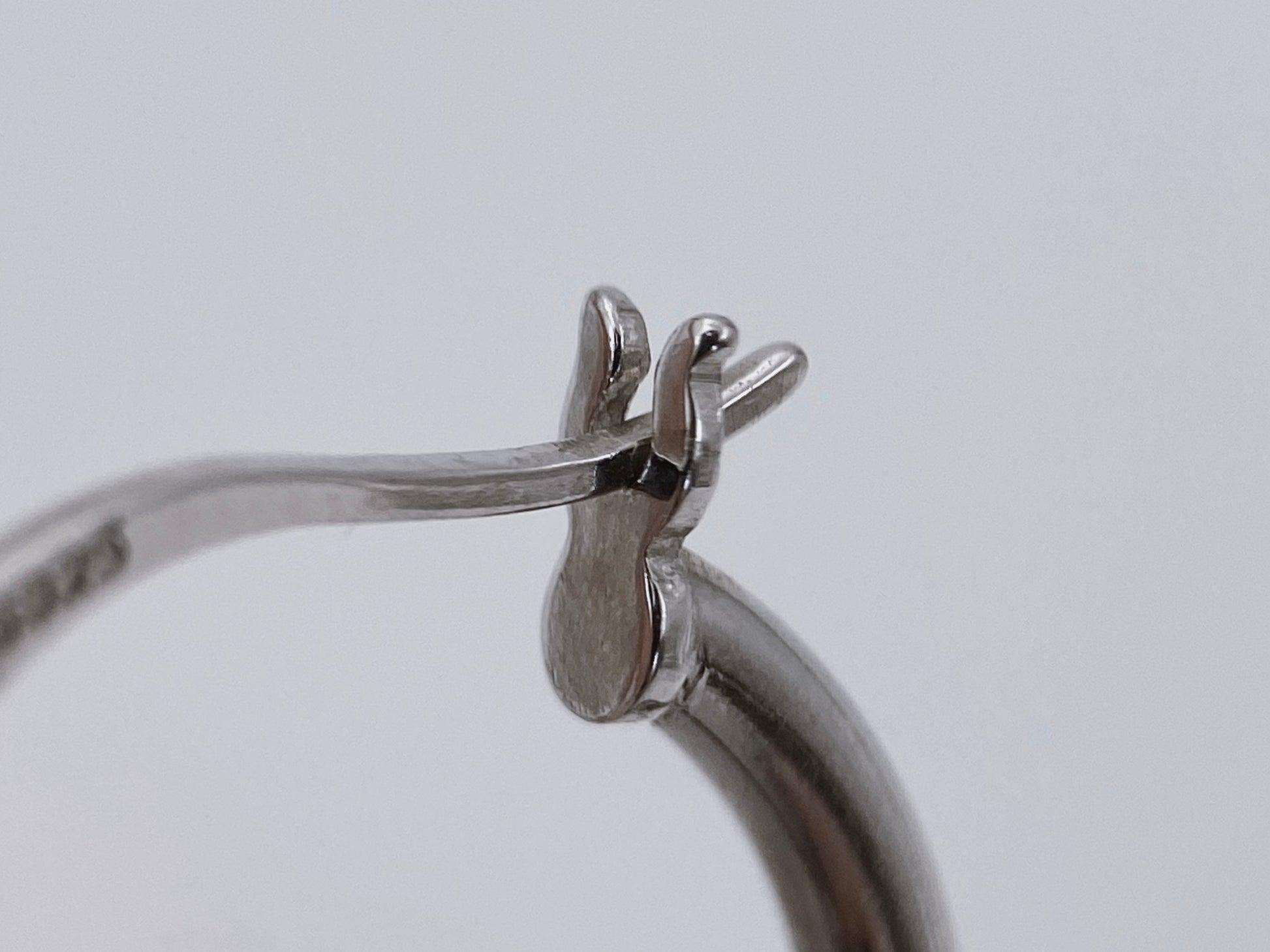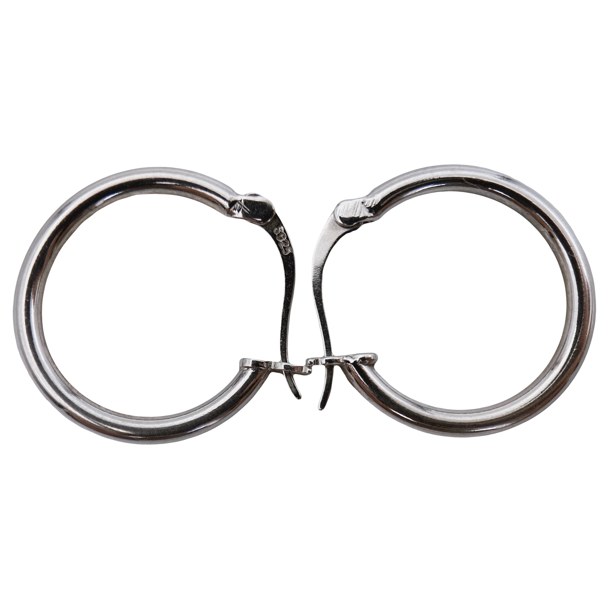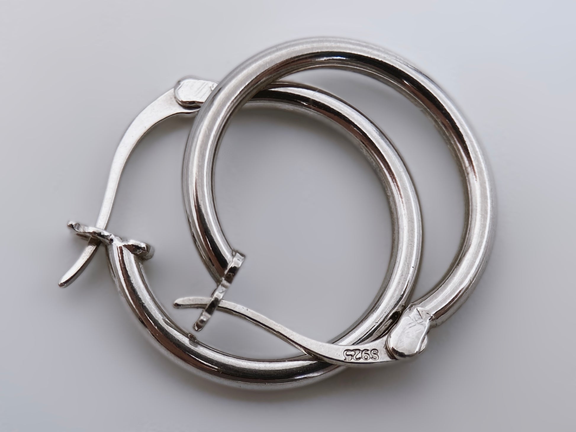 Minimalistinio dizaino žiediniai auskarai, pagaminti iš 925 prabos sidabro. Tvirtinimas – užsegimas su spyna (hinged latch back), užtikrinantis patogų nešiojimą.