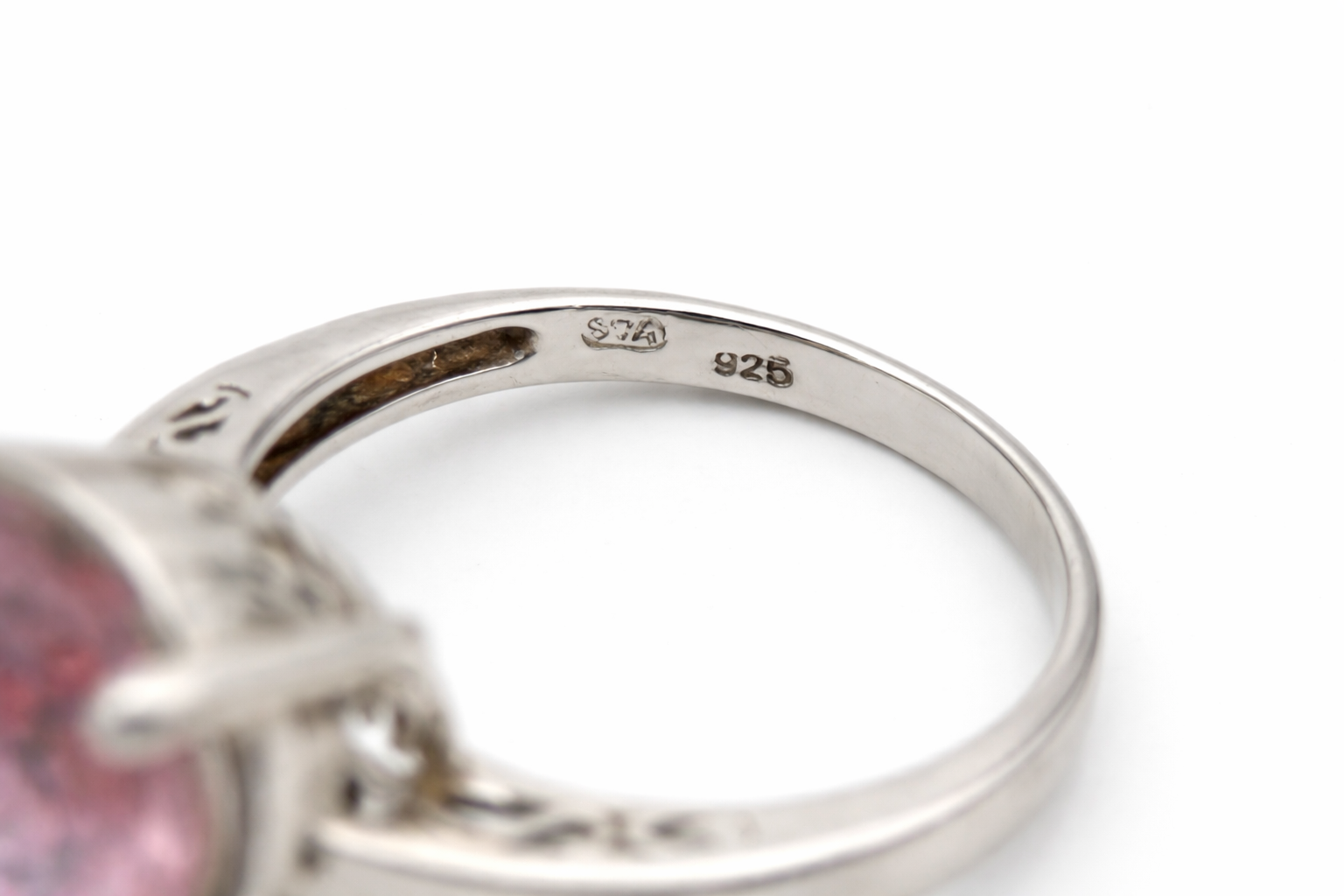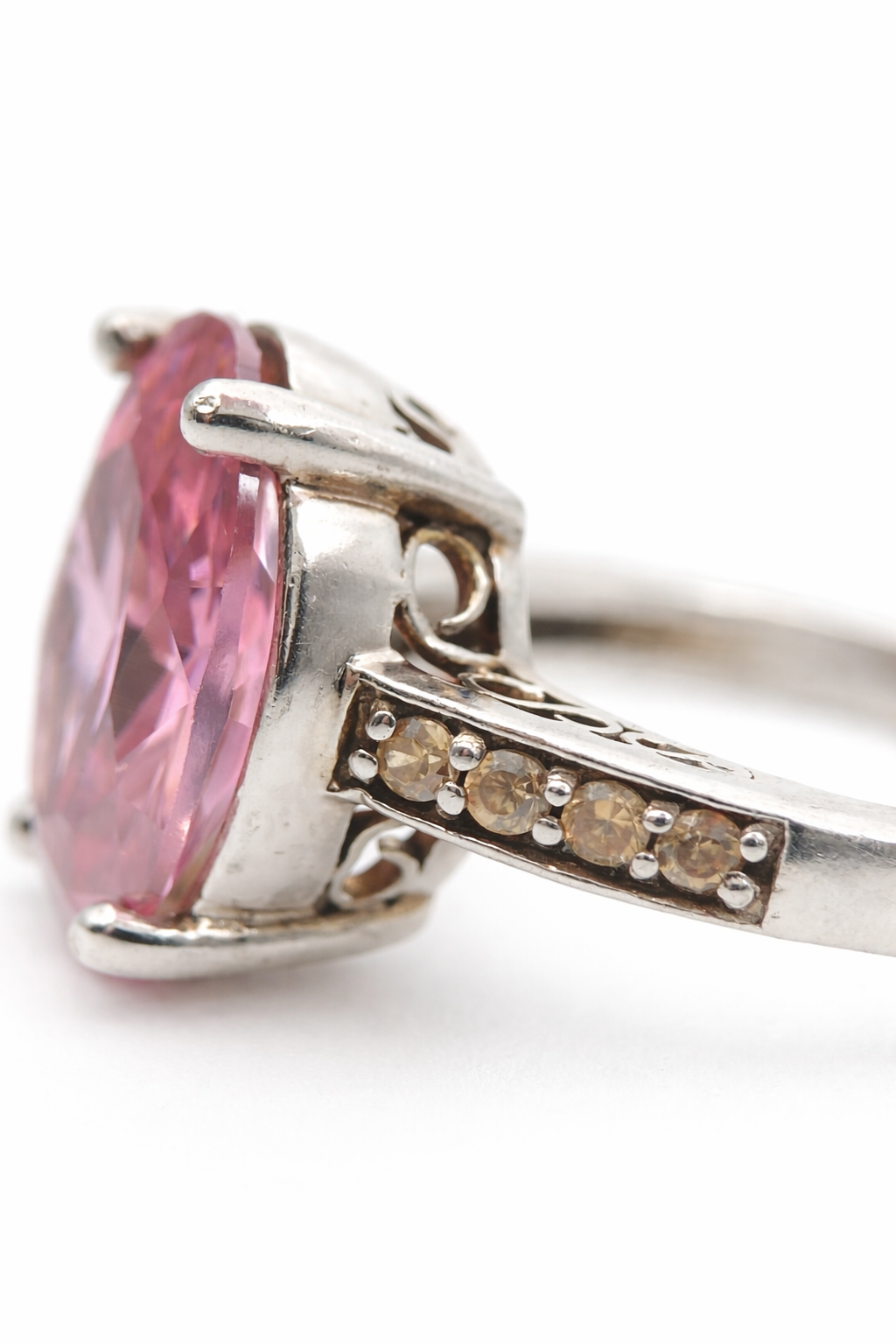 Elegantiškas sidabrinis žiedas su dideliu ovalo formos rožiniu spineliu, įstatytu į keturių nagelių laikiklį. Žiedo šonai dekoruoti cirkoniais, suteikiančiais papildomo spindesio ir subtilios prabangos įspūdį. Švarus, klasikinis dizainas leidžia akmeniui išlikti pagrindiniu akcentu, todėl žiedas atrodo išraiškingai ir moderniai.