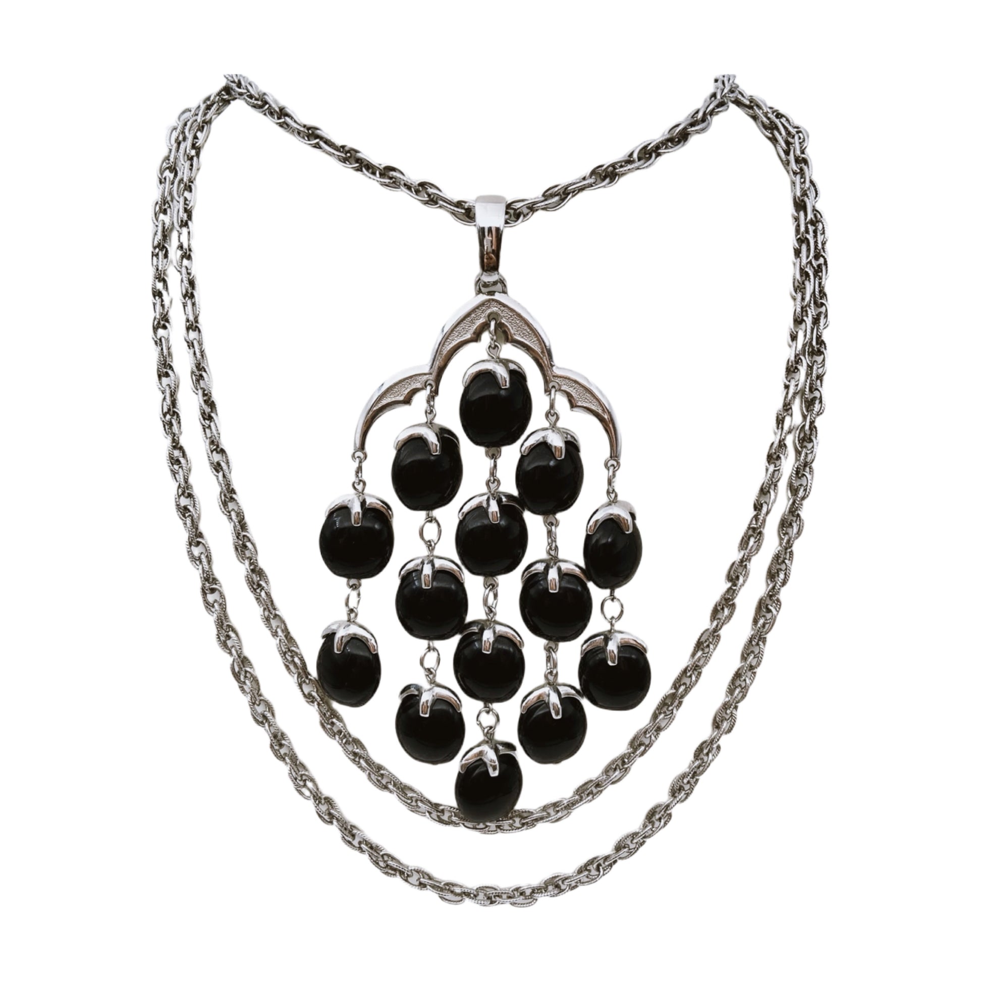 Šis „Trifari“ vėrinys su juodais kabančiais elementais ir įspūdinga grandine yra tikras retro „statement“ kūrinys. Ženklinimas su karūna virš „TRIFARI©“ reiškia, kad tai dar Crown Trifari – vienas vertingiausių šios firmos etapų. “Trifari“ garsėjo labai aukštos kokybės padengimu – vadinamuoju Trifanium (speciali jų patentuota apdaila, dažniausiai aukso spalvos, bet ir sidabro atmainų būta). Juodi kabantys elementai beveik neabejotinai yra termoplastikas (pvz., lucitas) – jie imituoja oniksą ar stiklo lašelius, bet yra lengvesni ir ilgaamžiškesni.