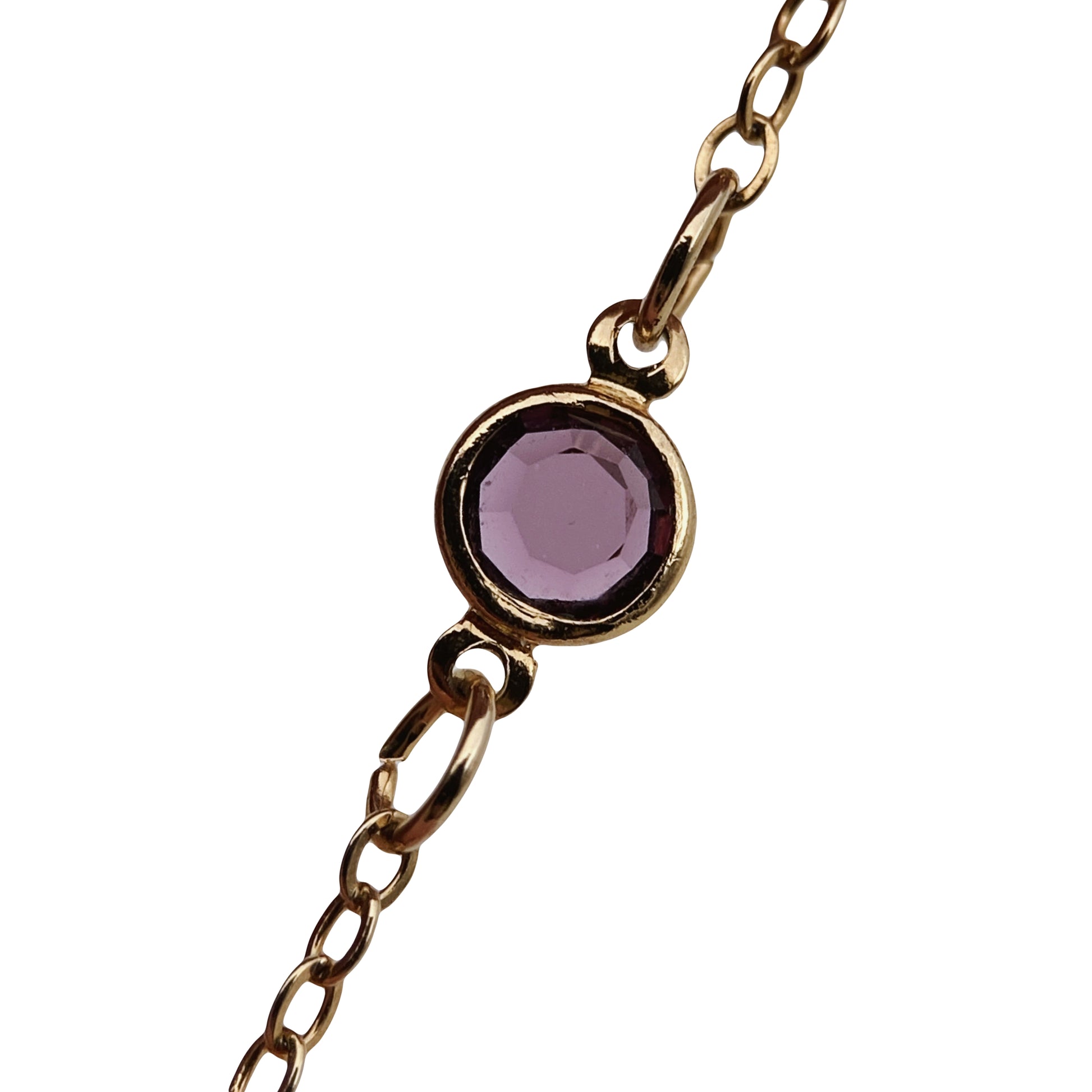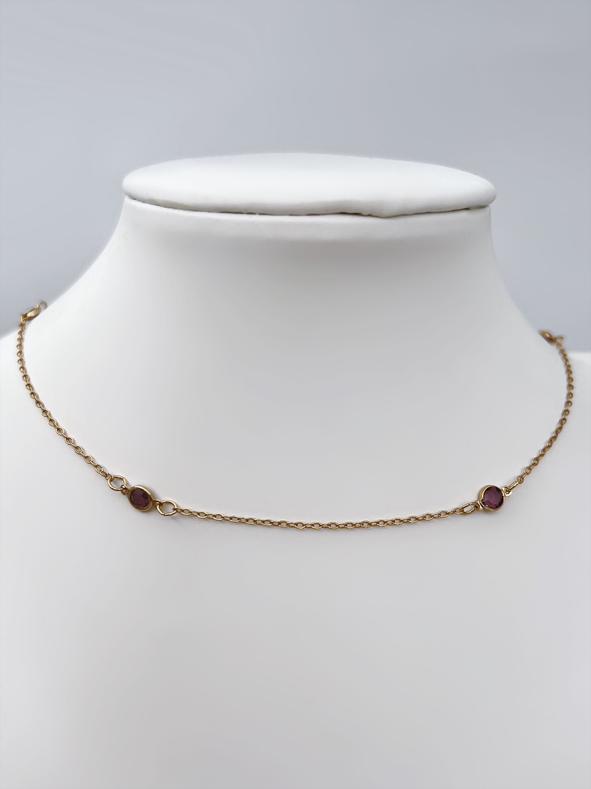 Subtilus grandinėlės tipo vėrinys su įlietais raudonais stiklo ar pusbrangiais akmenukais. Toks „station“ tipo minimalistinis dizainas su mažais akmenimis grandinėlėje buvo labai madingas pokario Amerikoje.