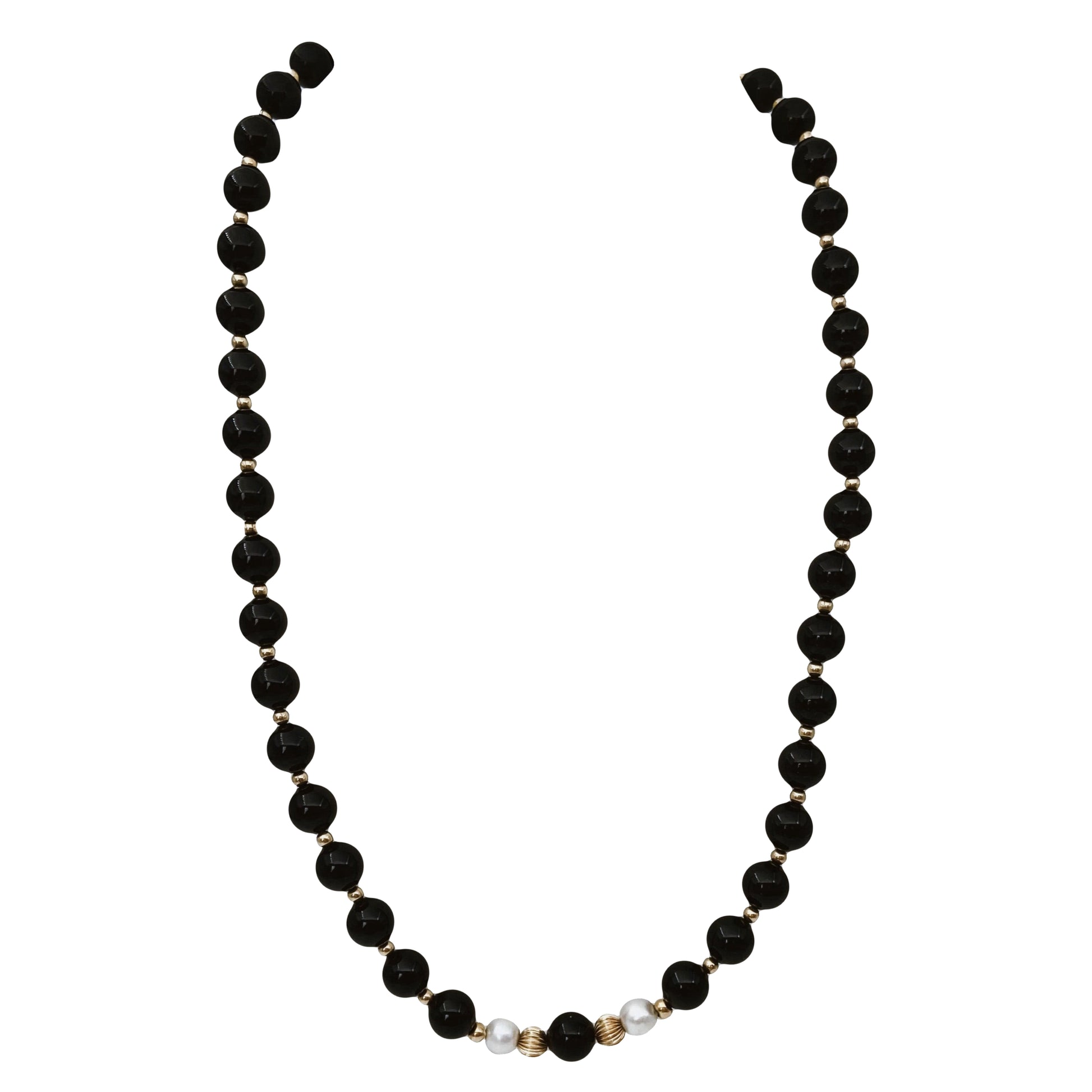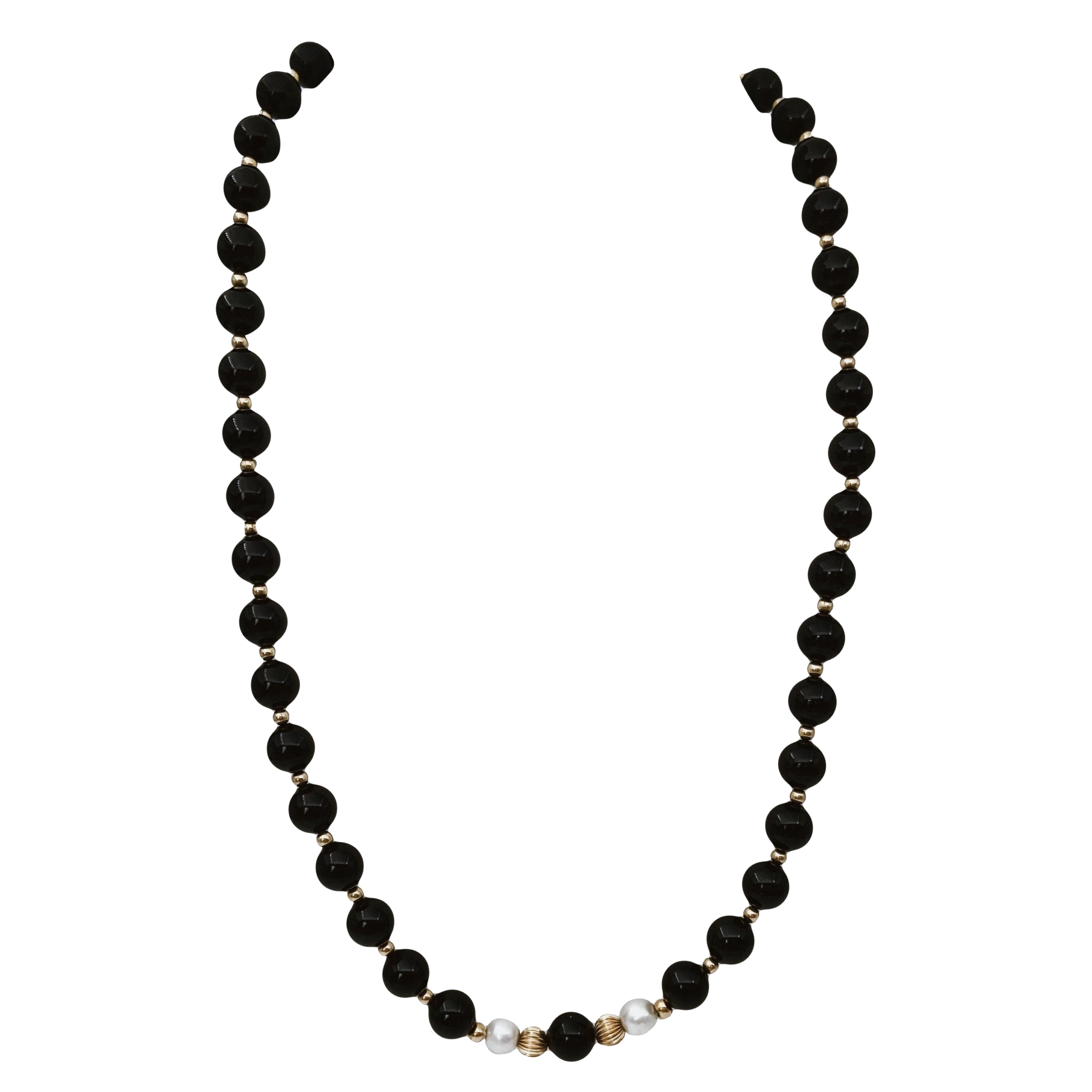 Klasikinis dizainas su pabrėžtu simetriškumu, švariomis linijomis, derinamas juodos ir aukso spalvų kontrastas. Šis elegantiškas kaklo papuošalas išsiskiria sodria juodų onikso karoliukų spalva, subtiliai kontrastuojančia su natūraliais baltais perlais. Ornamentinės detalės pagamintos iš 14 karatų aukso, kaip patvirtina žymėjimas ant originalaus užsegimo.