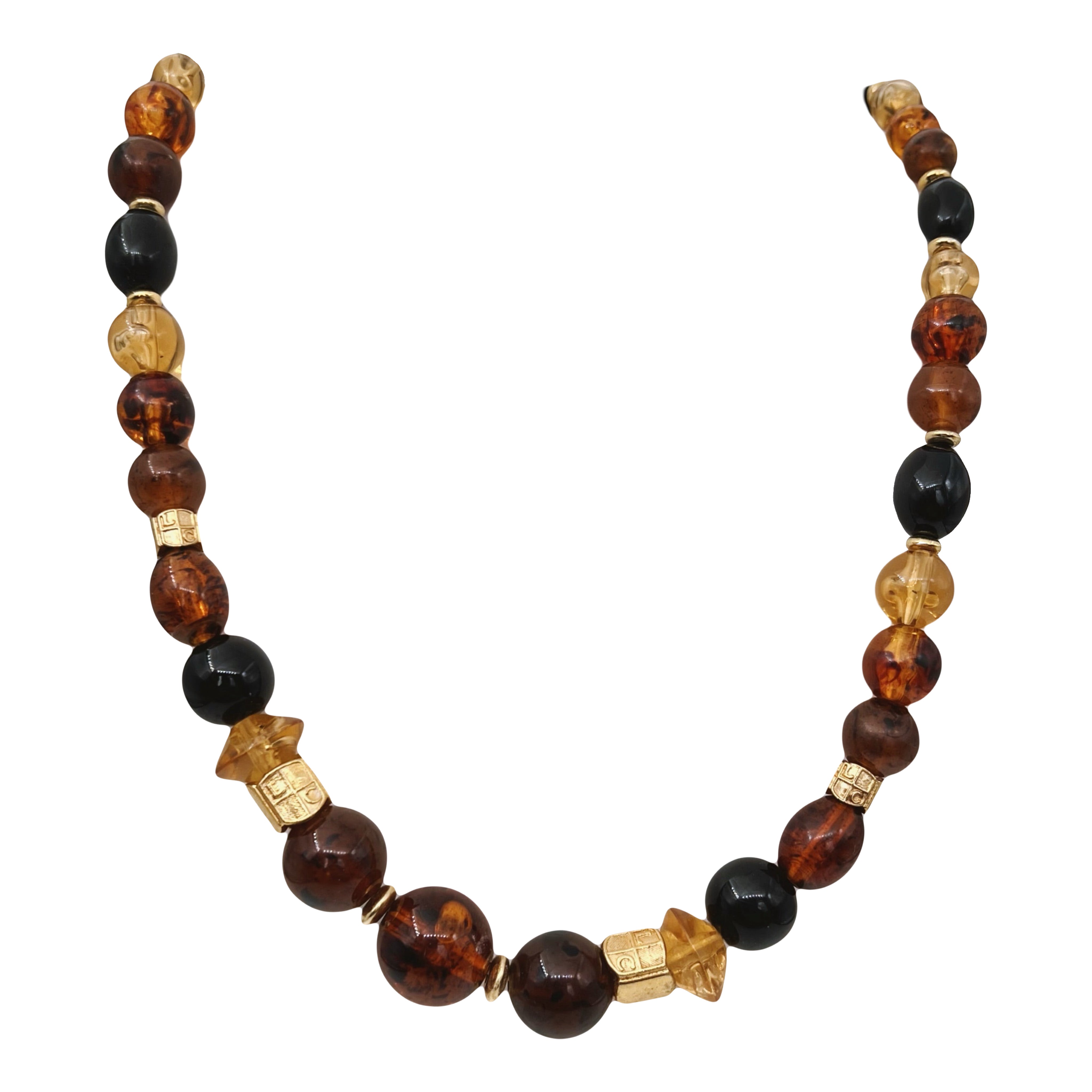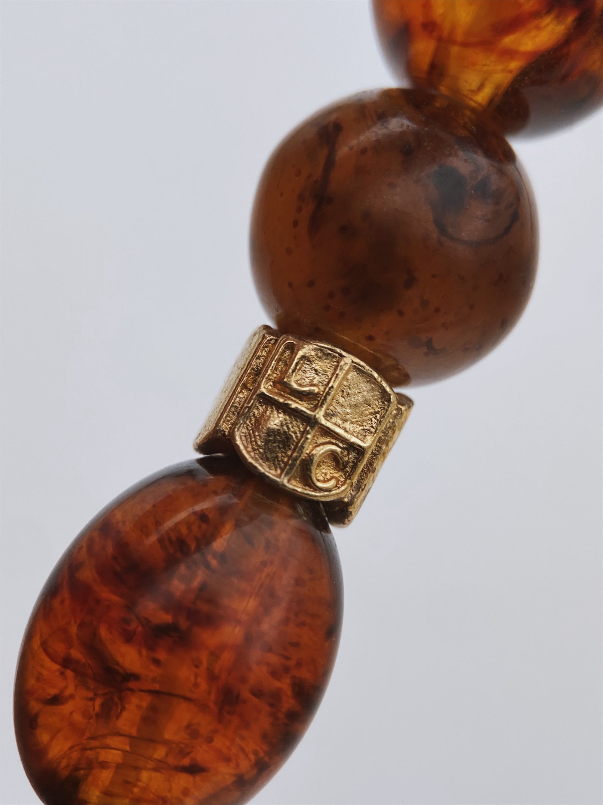 Šis vėrinys yra iš Liz Claiborne (LC) kolekcijos – pagal stilių, spalvas ir ypač auksaspalvius geometrinius karoliukus su reljefiniais raštais, kurie yra dažnas šio prekės ženklo ženklas. Aukso spalvos geometriniai intarpai – dažnai naudojami LC papuošaluose (su simboliniu ženklu ar raštu). “Liz Claiborne” vėrinys turi žymėjimą LC ant metalinių detalių (labai subtiliai) – tai patvirtina autentiškumą.