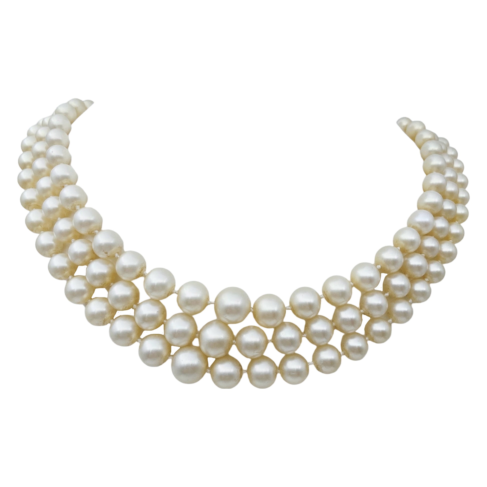 Klasikinis trijų eilių vėrinys iš perlo imitacijos karoliukų su dekoratyviniu, ovaliu užsegimu, puoštas dideliu centriniu perlo tipo elementu aukso spalvos rėmelyje. Karoliukai suverti ant siūlo su mazgeliais tarp jų – būdingas aukštesnės kokybės bižuterijos bruožas. Dėl kokybiško užsegimo, šis vėrinys yra vertinamas kaip kolekcinis vintažo papuošalas.