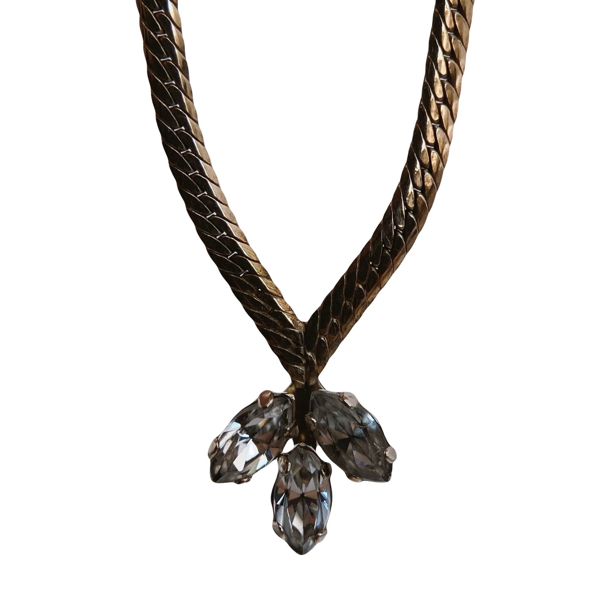 „Krementz“ vėrinys su aiškiai graviruotu ženklinimu ant užsegimo. Ši amerikiečių kompanija buvo žinoma dėl aukštos kokybės papuošalų, ypač XX a. viduryje, gaminusių iš aukso užpildo (gold filled), dažnai su subtiliais ir elegantiškais dizainais. Tai klasikinis, subtilus vėrinys su V formos kabuku ir trijų kristalų/skaidrių akmenų dekoracija. Grandinėlė – „snake“ tipo, kas buvo labai populiaru XX a. viduryje. „Krementz“ papuošalai yra vertinami kolekcininkų, tačiau kainos priklauso nuo medžiagos, dizaino ir būklės.