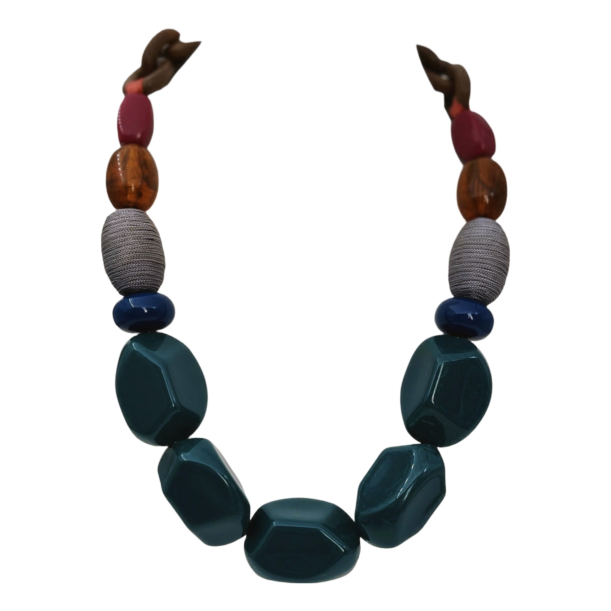 Masyvus, modernus „statement“ stiliaus vėrinys, sudarytas iš įvairių medžiagų – didelės formos dervos (akrilo) karolių, medinių jungčių, gintaro atspalvio akrilo elementų, tekstile apvyniotų karolių ir ryškių spalvų (žalsvai mėlynos, rudos, rožinės, gintarinės) akcentų. Užsegimas – auksinės spalvos metalinis karabinas, su angelo silueto pakabuku (be logotipo), būdingu šiuolaikinei britų mados bižuterijai.