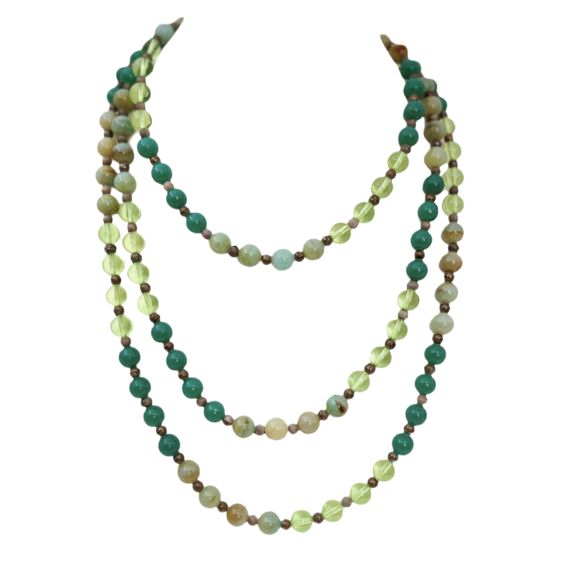 Išskirtinio grožio vintažinis ilgas vėrinys, sudarytas iš įvairaus atspalvio žalsvų, gelsvai pilkšvų ir skaidriai citrininių karoliukų. Paviršius šiltas liesti, švelniai blizgus, o karoliukų spalvos nevienodos — tai būdingas bruožas ankstyvajam plastiko tipui – katalinui (bakelito šeimai). Šildant ar trinant juntamas subtilus senovinis muilo ar vaško kvapas, patvirtinantis autentišką medžiagą. Vėrinys užsegamas ažūriniu žalvario spynos tipo užsegimu, kuris laikui bėgant įgavo natūralią patiną. Vėrinio ilgis leidžia jį dėvėti viena ilga grandine arba dviem eilėmis. Tai klasikinis XX a. vidurio mados pavyzdys, derinantis skulptūrišką formą, šiltas tonacijas ir lengvą retro prabangą.