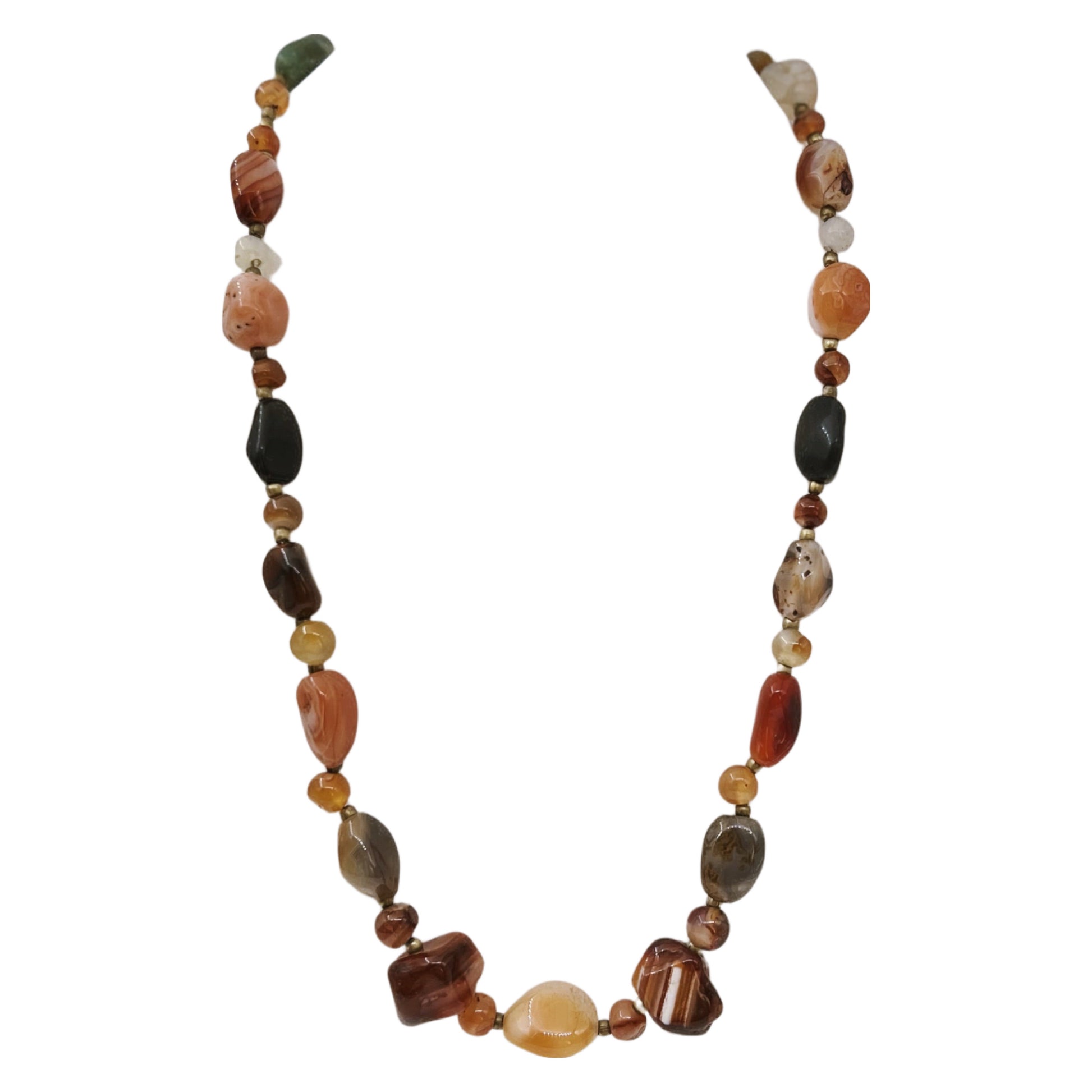 Autentiškas XX a. vidurio vintažinis vėrinys, sudarytas iš įvairių natūralių akmenų – agato, karneolio, aventūrino, onikso ir kvarco. Akmenukai – netolygių formų, su natūraliomis juostelėmis, intarpais ir skaidrumo variacijomis, o žalvario karoliukai suteikia subtilų senovinio šilto tono kontrastą. Šviesiai oranžiniai ir rusvai raudoni karneolio atspalviai susilieja su žalsvais aventūrino akcentais, sukurdami harmoningą gamtos spalvų derinį.