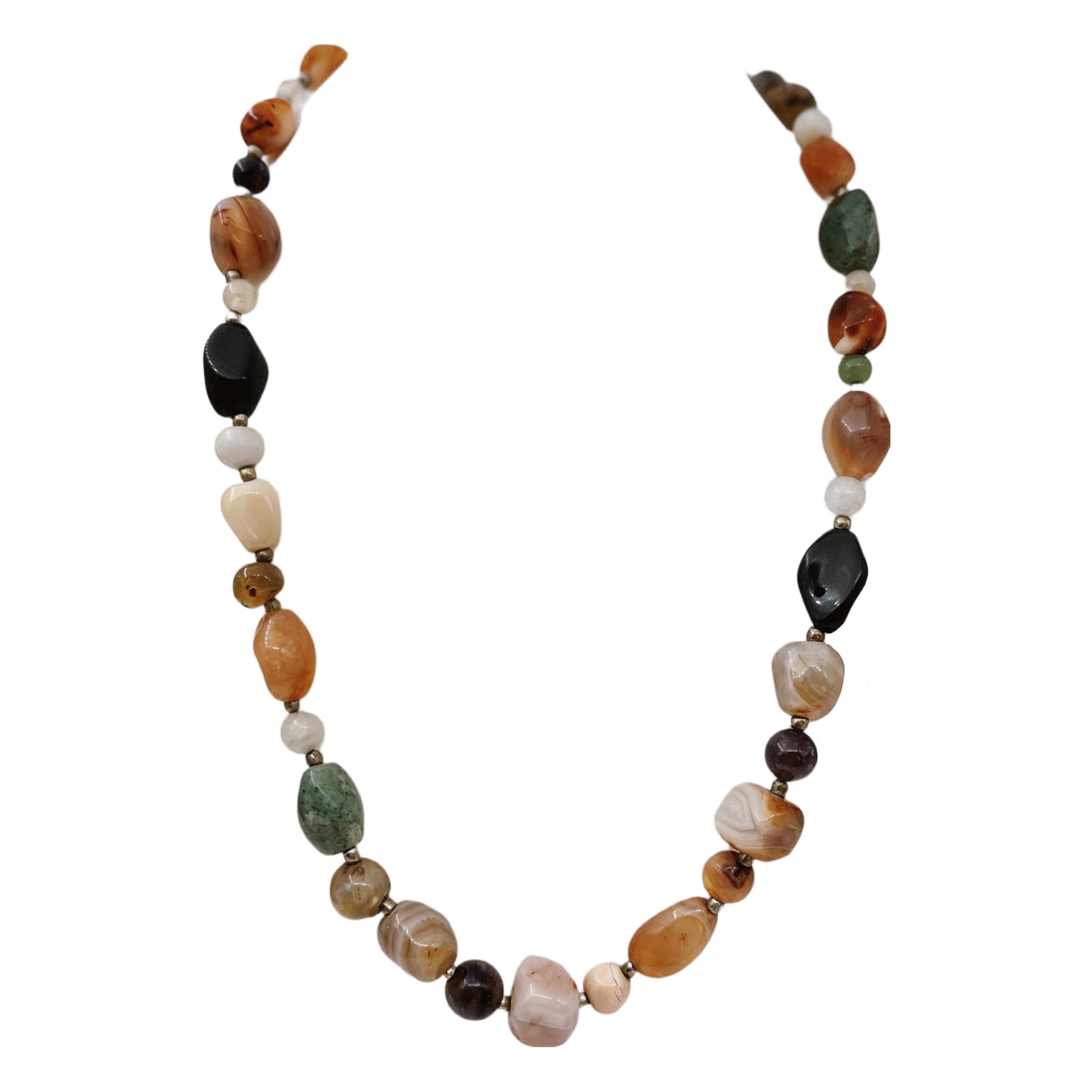 Sudėtis: natūralūs, netolygių formų akmenys (karneolis, agatas, aventūrinas, jaspis, oniksas, kvarcas), žalvaris Būklė: labai gera Išmatavimai: 50 cm Spalva: įvairiaspalvė Žymėjimas: nėra Šalis: Vokietija Laikotarpis: 1950-1970 metai Rinkos vertė: 60-100 EUR