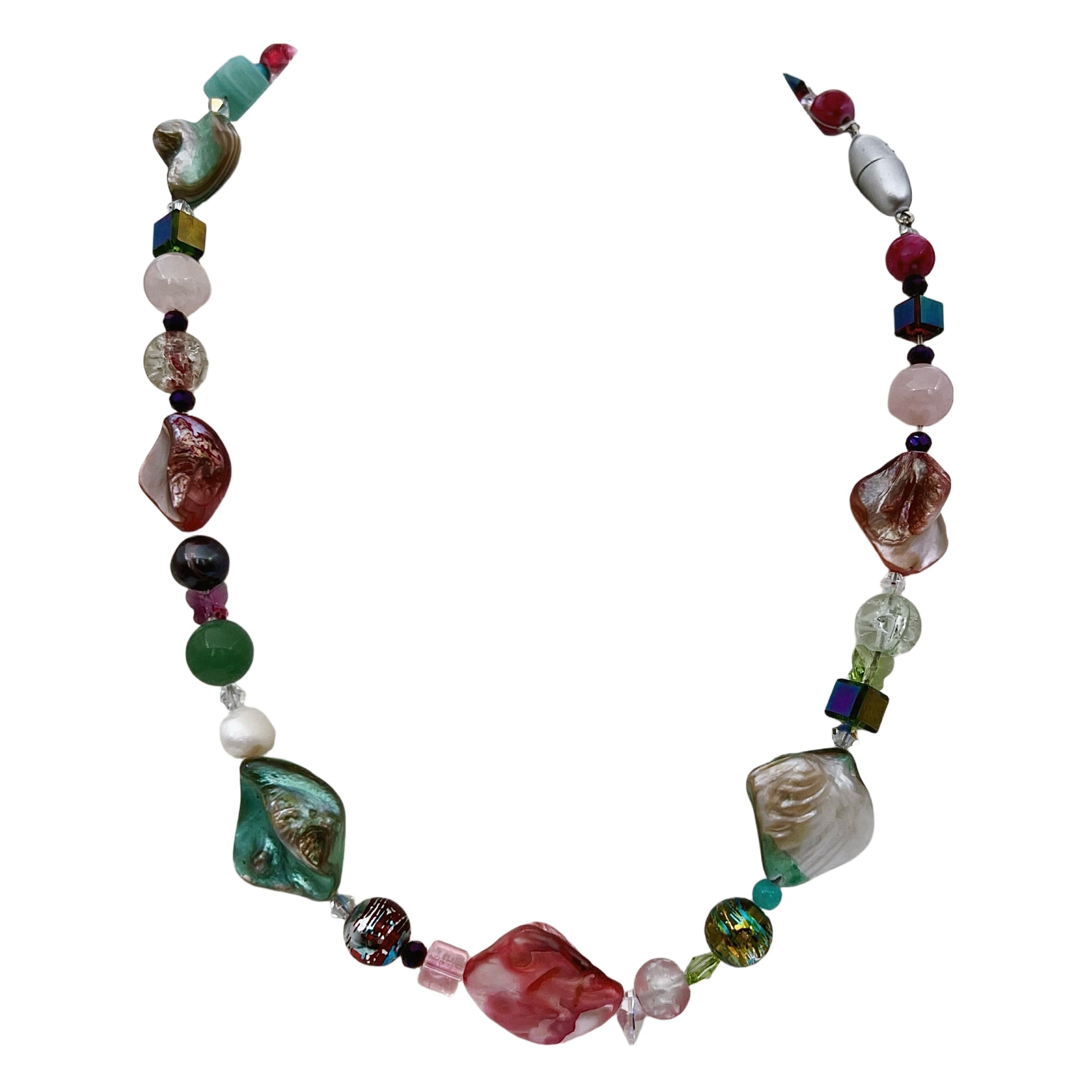 Šis spalvingas vėrinys – tai rankų darbo arba mažosios studijos kūrinys, sukurtas naudojant įvairius spalvotus karoliukus. Žali ir rožiniai masyvūs karoliukai - “dyed shell” (dažyta kriauklė). Stiklo karoliukai su auksinėmis, spalvotomis bei perlamutrinėmis detalėmis, rožinis kvarcas, aventūrinas, kvarco ir akrilo elementai. Dizainas: išraiškingas, asimetriškas – karoliukai įvairių formų, dydžių ir faktūrų. Centriniai perlamutriniai karoliukai primena sulydytą stiklą, o spalvoti dryžuoti karoliukai – tipišką Murano techniką. Magnetinis cilindro formos užsegimas, kuris dažnai naudojamas šiuolaikiniuose, patogiam nešiojimui skirtuose vėriniuose.