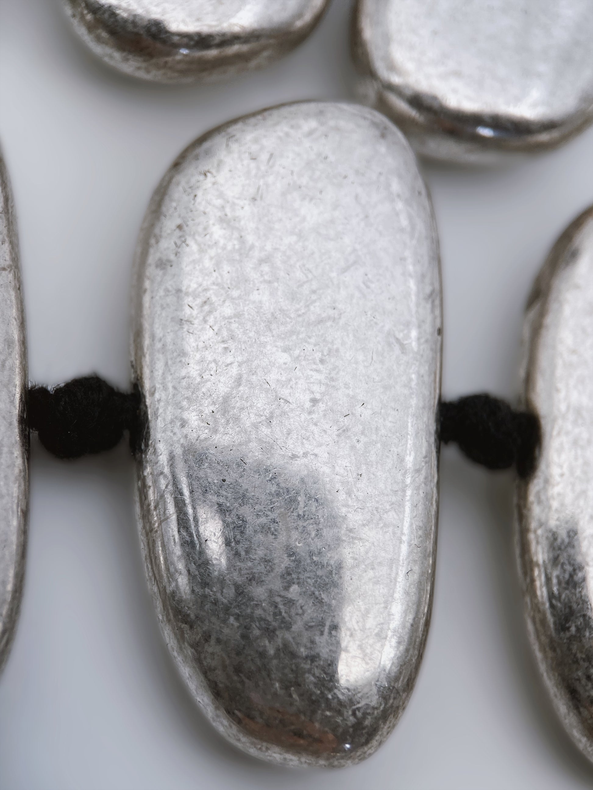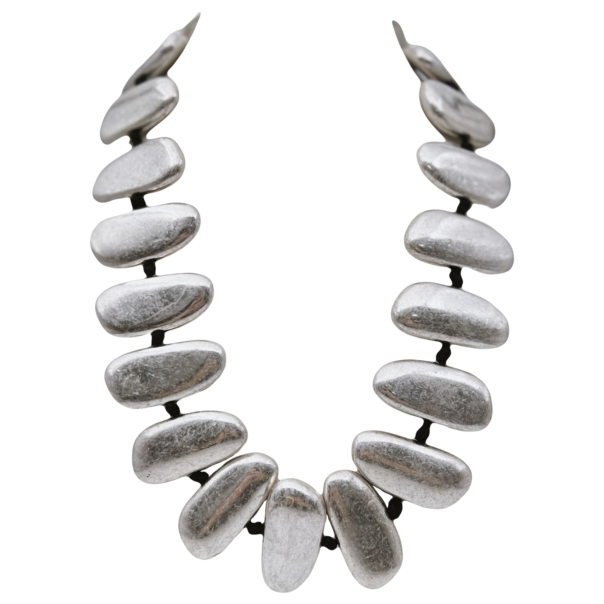 Išskirtinis vintažinis vėrinys, sudarytas iš matinio sidabro spalvos asimetriškų metalinių formų. Kiekvienas segmentas – lyg natūralaus akmens fragmentas, subtiliai poliruotas, tačiau su tekstūriniu paviršiumi. Vėrinys suvertas ant juodos minkštos virvelės – stilingas kontrastas metalui.