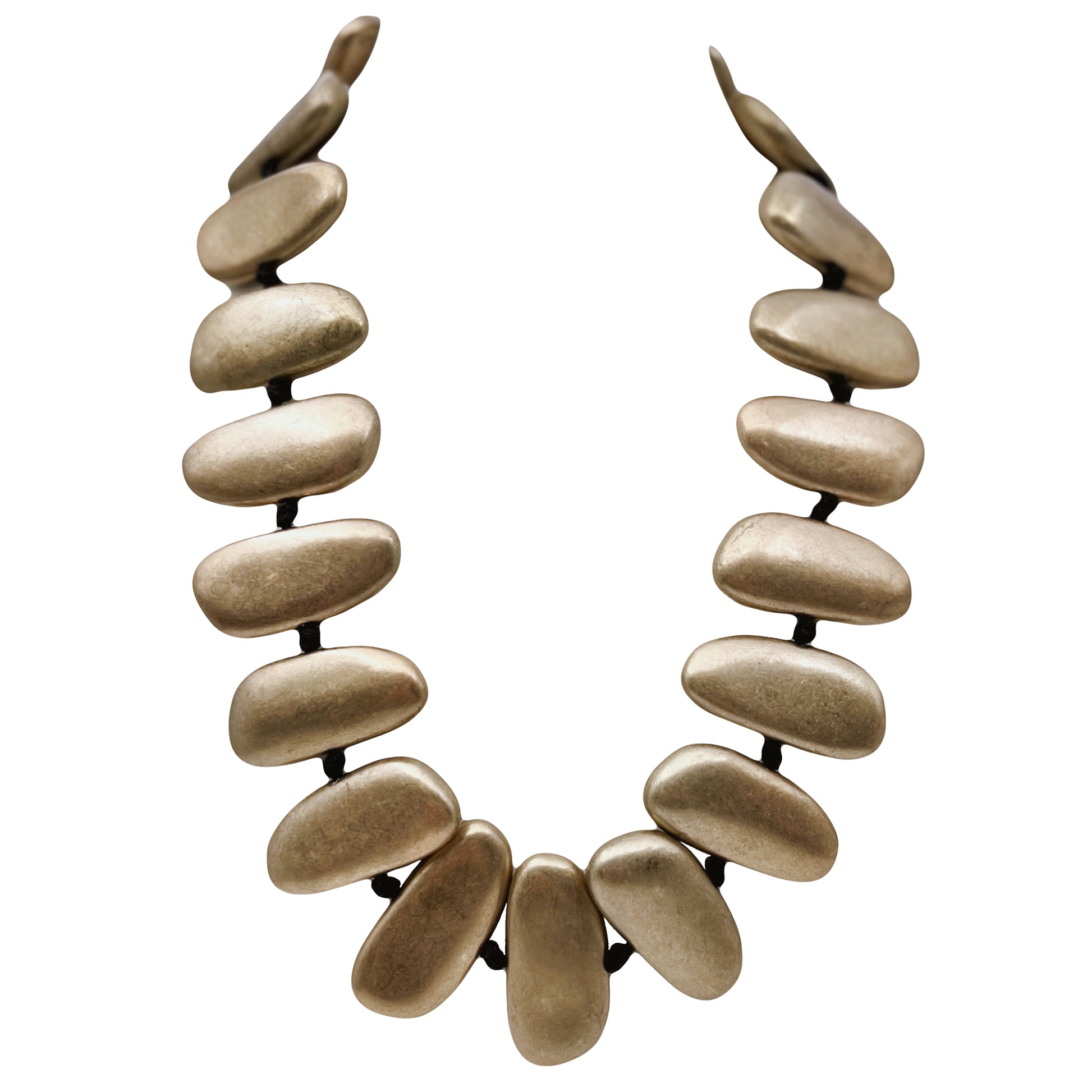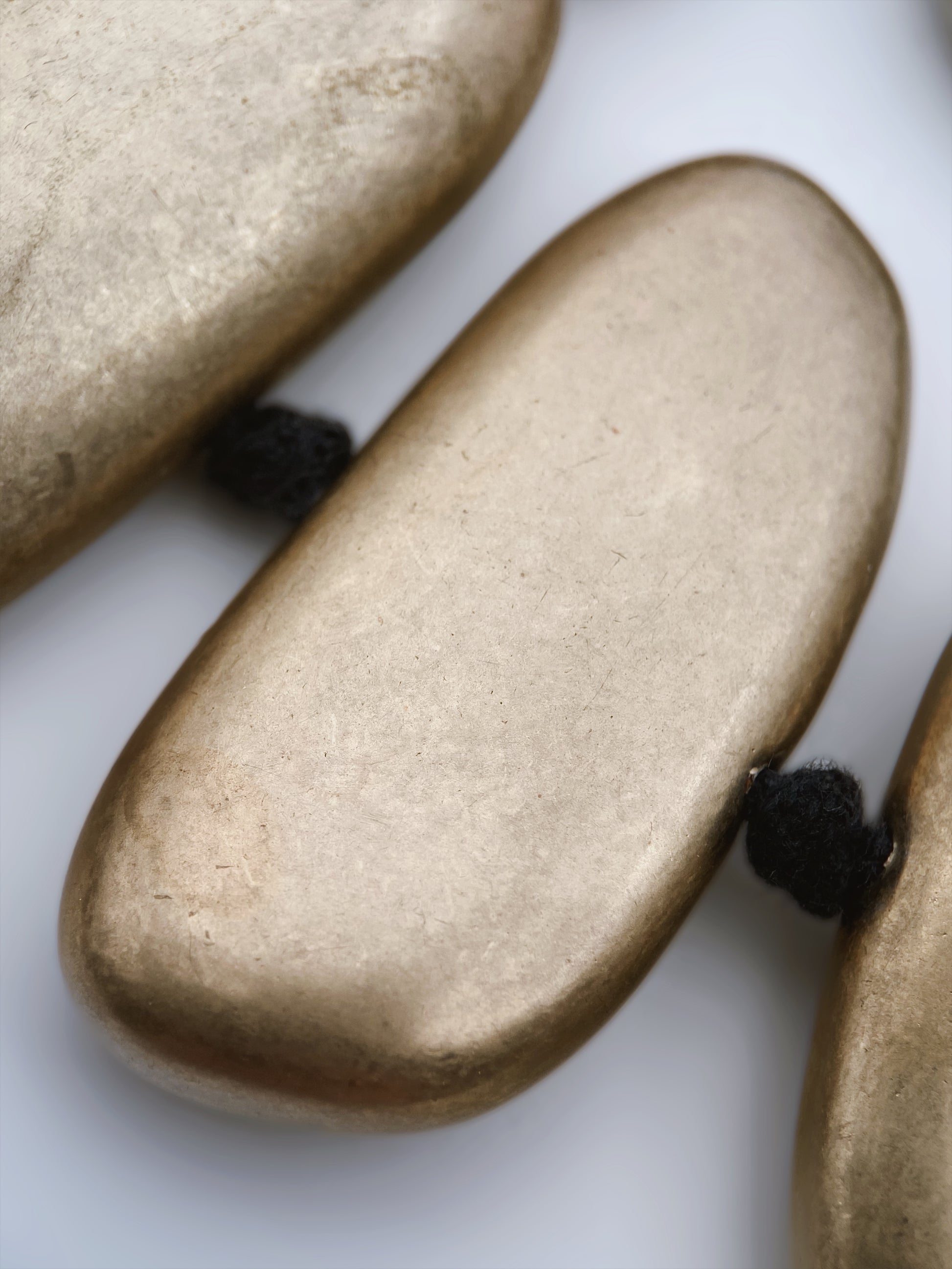 Išskirtinis vintažinis vėrinys, sudarytas iš matinio aukso spalvos asimetriškų metalinių formų. Kiekvienas segmentas – lyg natūralaus akmens fragmentas, subtiliai poliruotas, tačiau išlaikant tekstūrinį paviršių. Vėrinys suvertas ant juodos minkštos virvelės – stilingas kontrastas metalui.