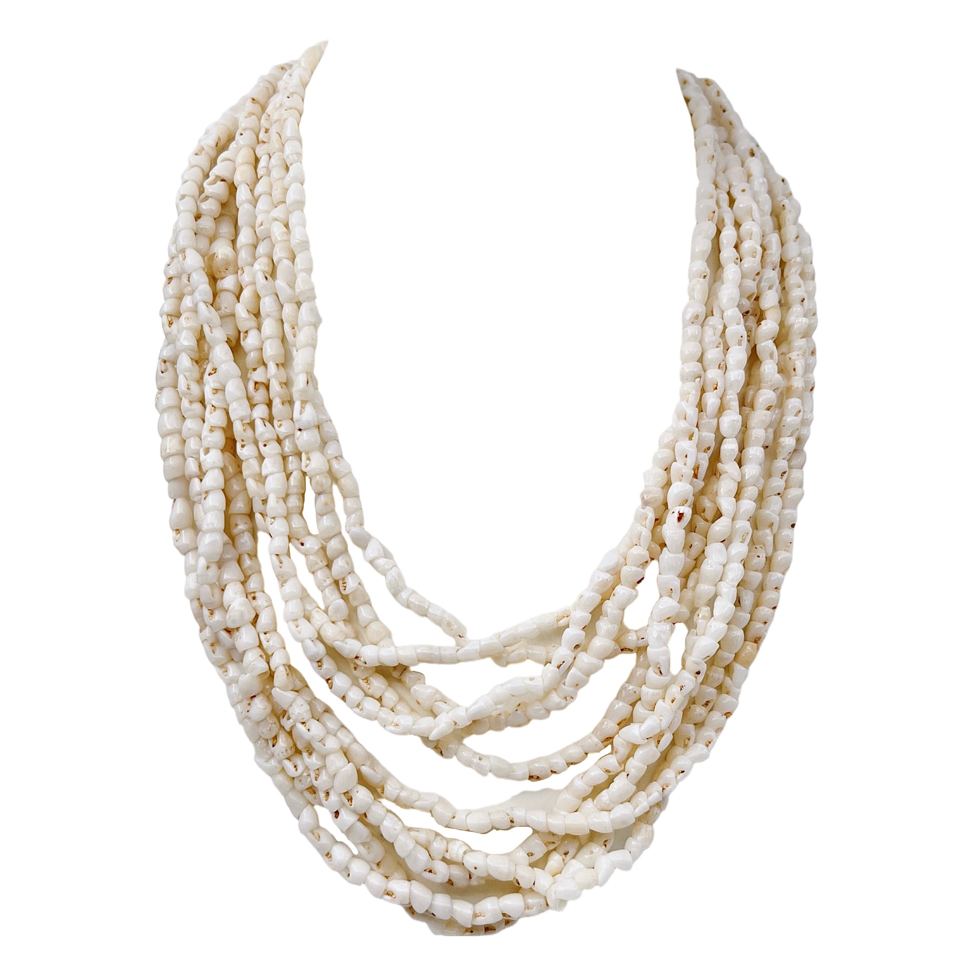 Šis daugiaeilis vėrinys yra pagamintas iš natūralių baltų kriauklių (shell beads) – tikėtina, kad tai Heishi arba „puka“ tipo karoliukai, kurie buvo plačiai naudojami tiek Havajų, tiek Pietų Azijos / Ramiojo vandenyno salų bižuterijoje. Nelygūs, netaisyklingi karoliukai su natūraliais rudos spalvos intarpais – tai autentiškos jūrinės kilmės kriauklės. Didelis centrinis užsegimo „karoliukas“ – greičiausiai “cowrie” ar kita jūrinė kriauklė, dažnai naudojama kaip dekoratyvinis elementas arba kaip užsegimo detalė.