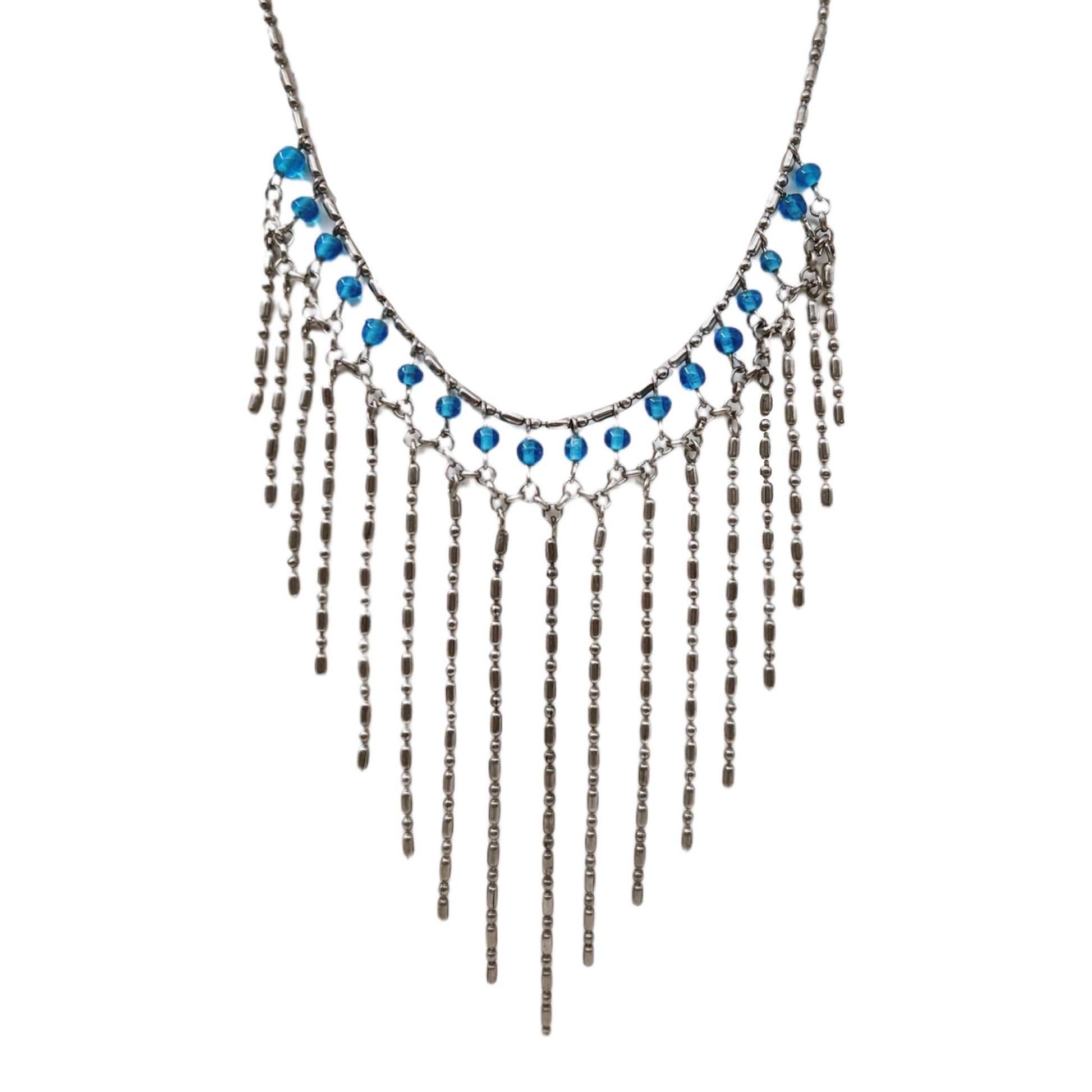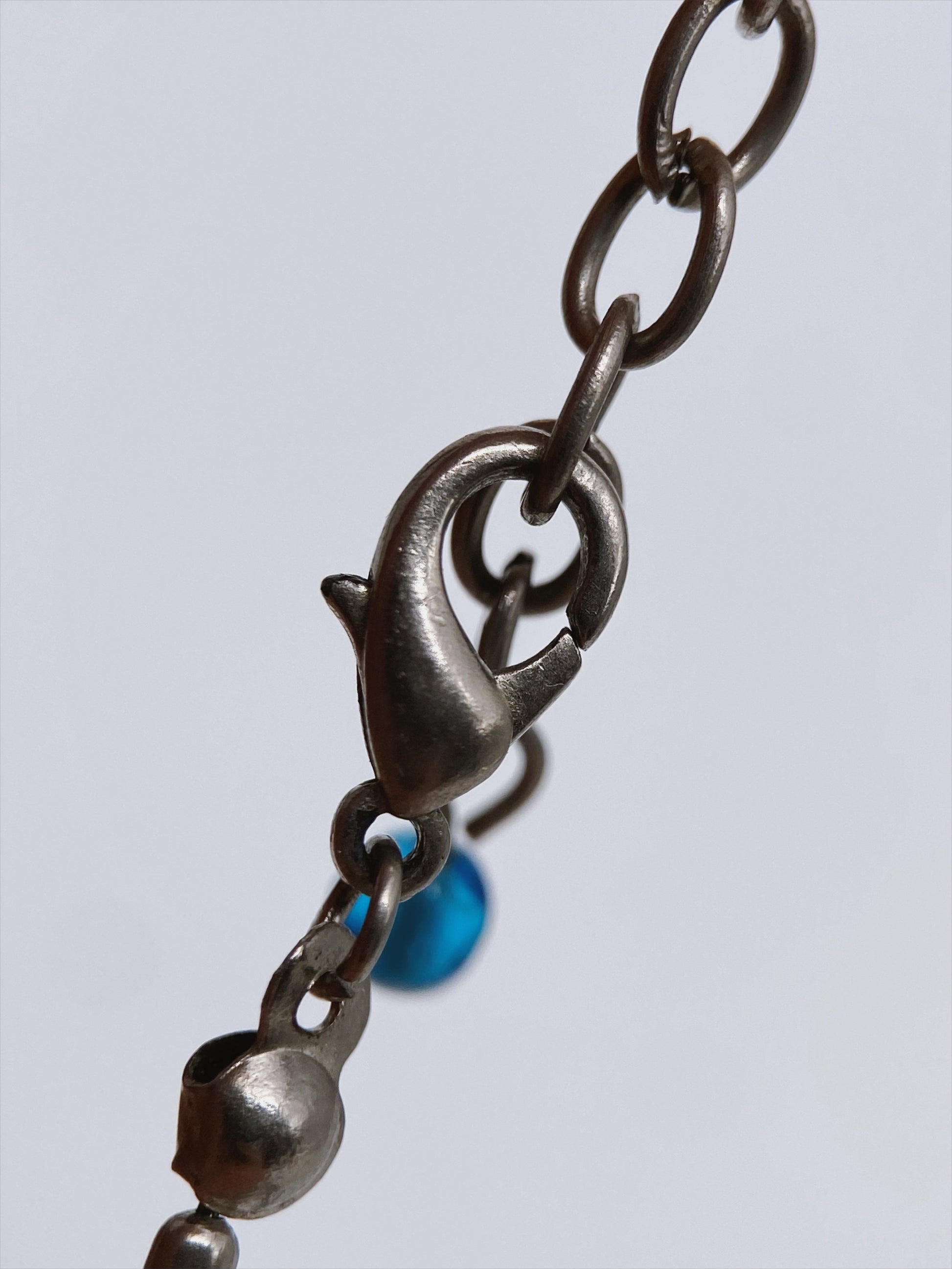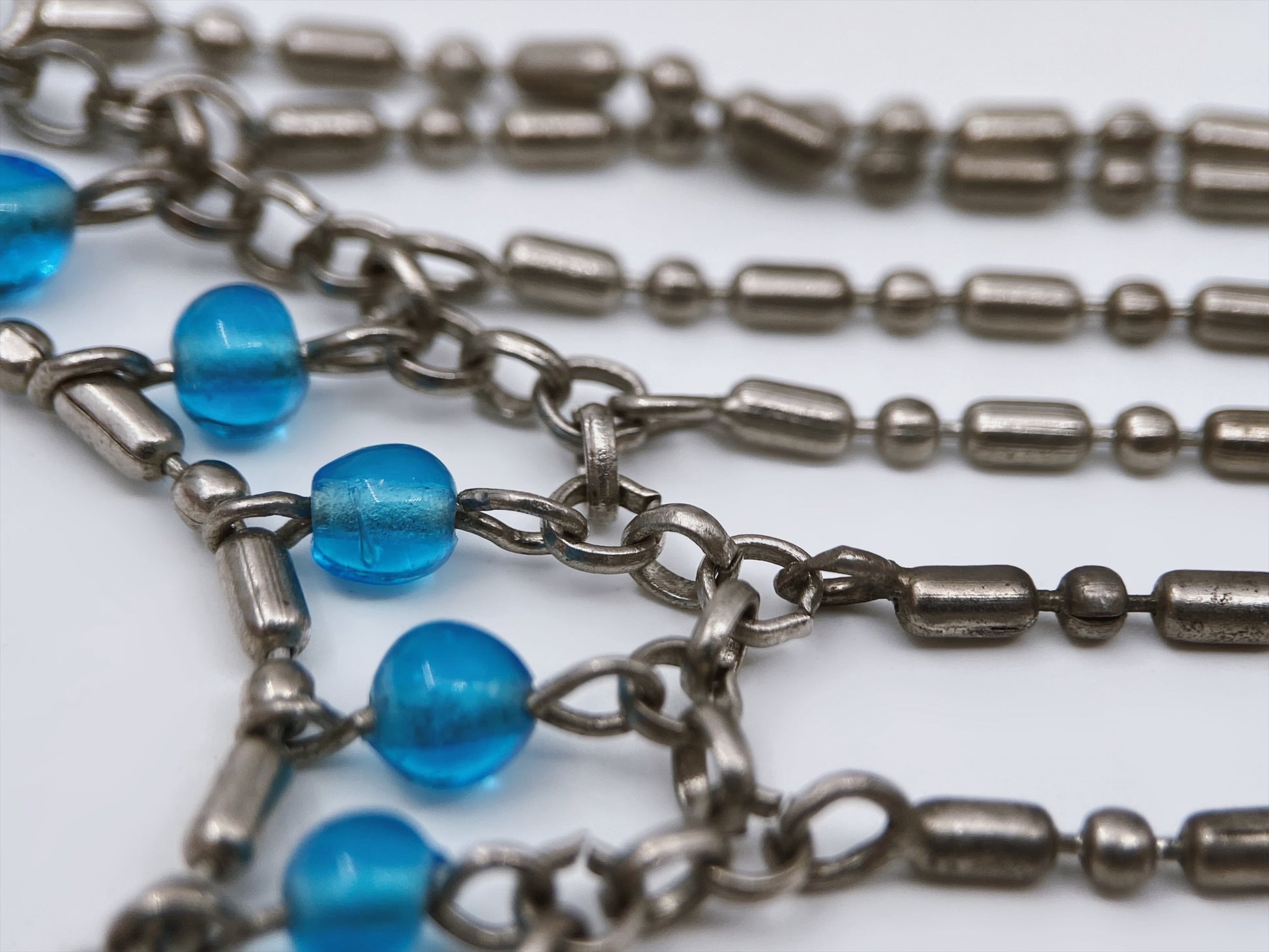 Grandinėlių tipas: „barrel chain“ (statinaitės formos) sujungtos su mažomis kilpomis – plačiai naudotos nuo 1990 m., ypač bižuterijoje, imituojančioje „tribal“ ar „gypsy goth“ stilių. Tamsinto metalo apdaila – madinga buvo 1995–2000 m., ypač alternatyvios mados segmente (pvz., Urban Outfitters, Claire’s, Hot Topic). Mėlyni presuoto stiklo karoliukai, pusiau skaidrūs, suformuoti mašininiu būdu.