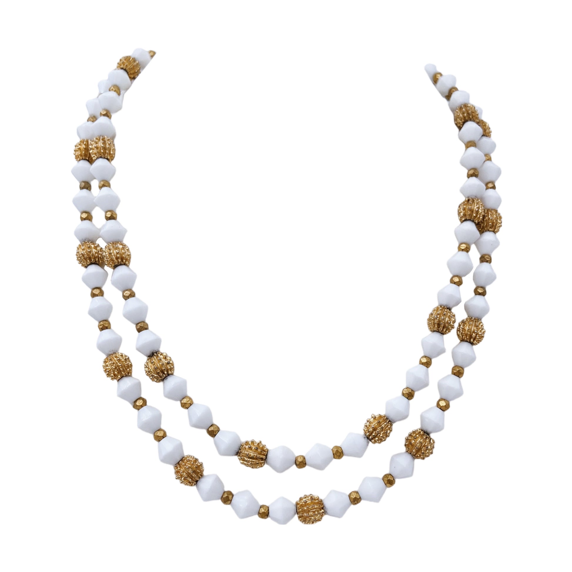 Tai dviejų eilių Trifari vėrinys, greičiausiai iš 70-ųjų laikotarpio, su baltais šešiakampiais lucito karoliukais, paauksuotais faktūriniais „burbulais”, kurie būdingi Trifari dizainui (neretai vadinami „pinecone” ar „popcorn” stiliaus), smulkiais “metallic gold” separatoriais tarp pagrindinių karoliukų ir labai svarbia detale – Trifari logotipo pakabuku šalia užsegimo. Karoliukai, baltos ir aukso spalvos kontrastas bei tekstūriniai karoliukai – tai estetikos bruožai, siejami su „mod“ ir „space age“ įkvėpimu, būdingu vėlyviesiems 1960-iesiems.