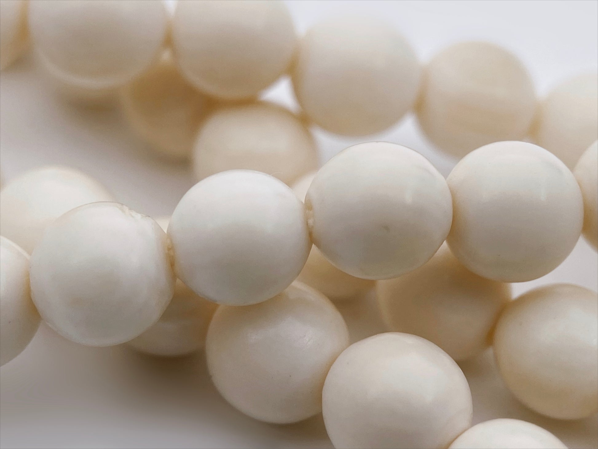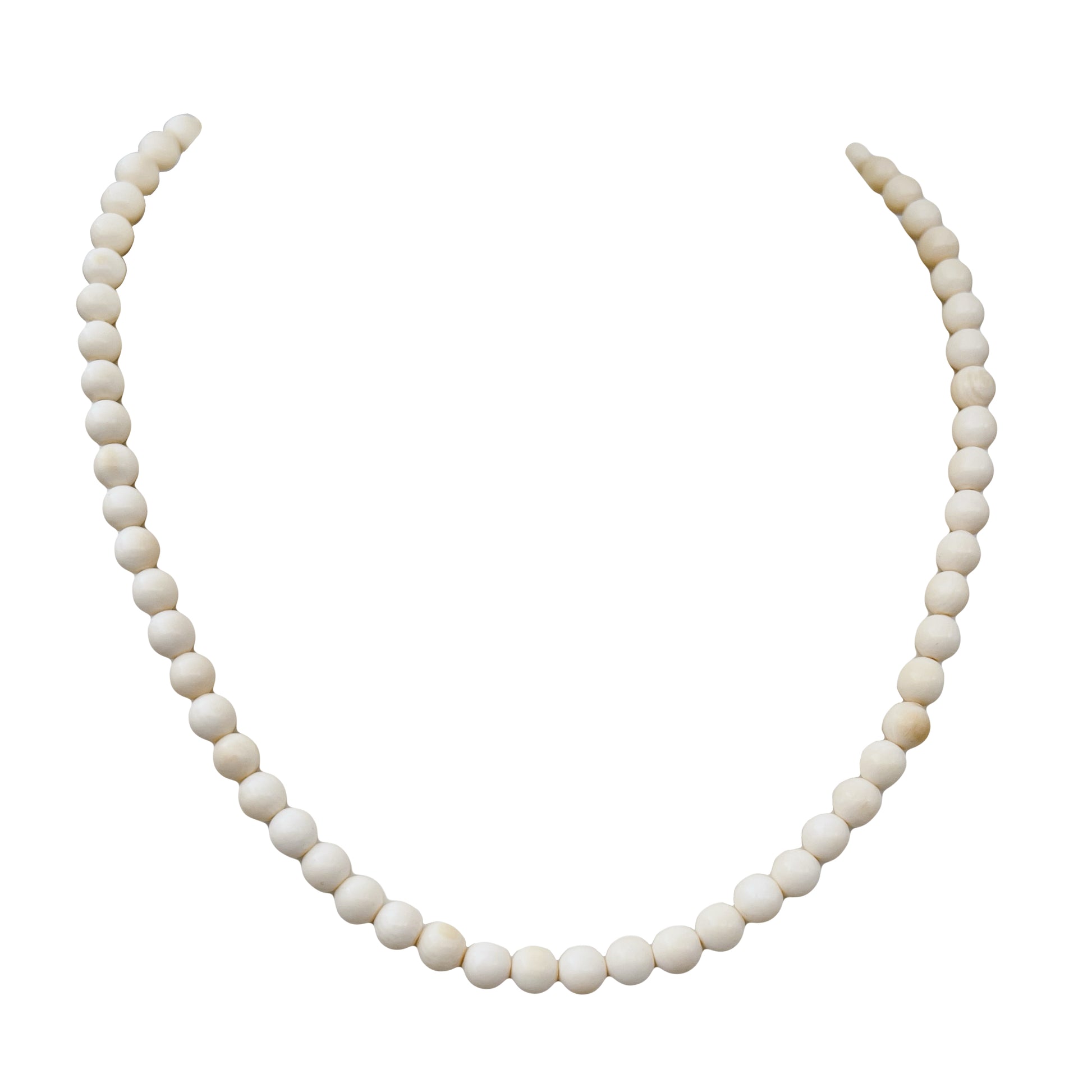 Autentiškas ir elegantiškas vintažo vėrinys, pagamintas iš natūralaus kaulo karoliukų, kruopščiai suvertų rankiniu būdu. Vėrinys pasižymi subtilia dramblio kaulo spalva su švelniais natūralios medžiagos nelygumais, kurie liudija jo organinę kilmę. Papuošalas užsegamas retu cilindriniu (vamzdelio tipo) užsegimu – tai klasikinis senųjų etninių ar kolonijinio laikotarpio papuošalų požymis, dažniausiai naudotas tarpukario laikotarpiu.