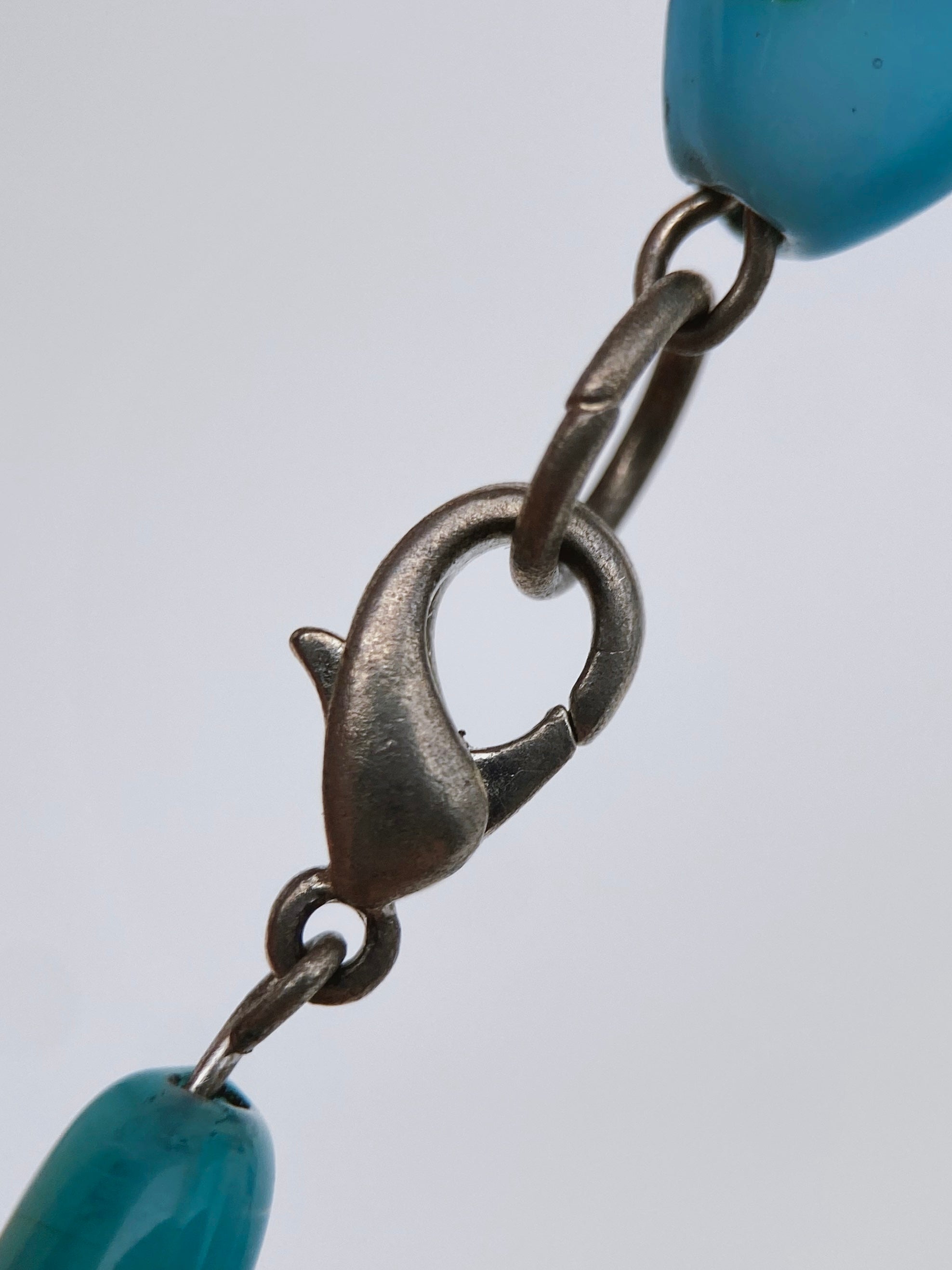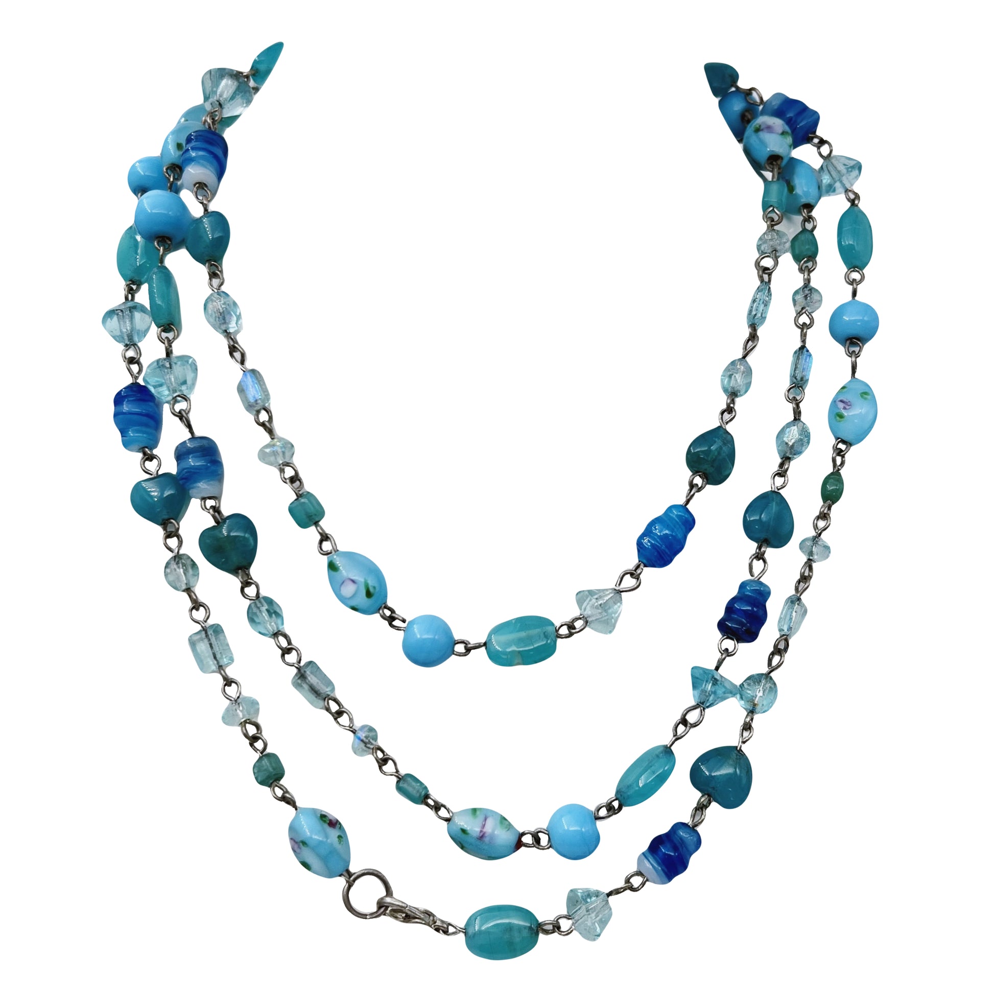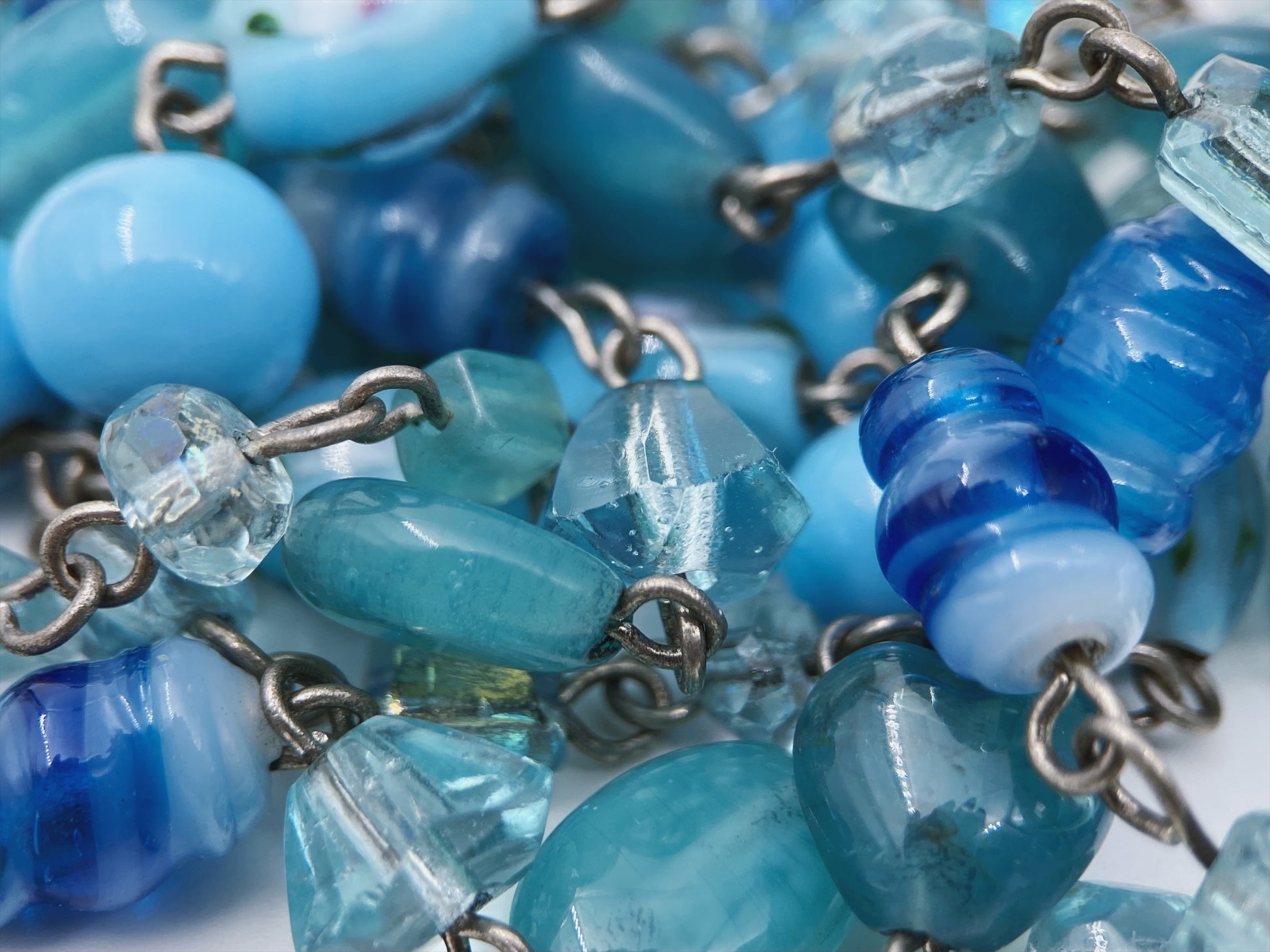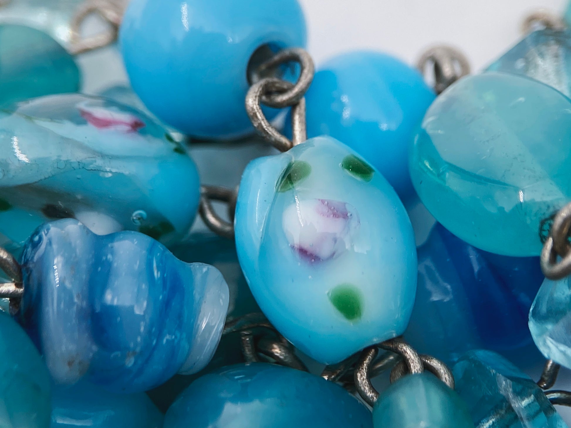 Šis vėrinys yra subtilus trijų eilių papuošalas iš įvairių mėlynų stiklo karoliukų, dekoruotų gėlių motyvais ir kitomis formomis – tai labai būdingas Murano stiliaus arba “lampwork” stiklo karoliukų darbas. Kai kurie su rožių tipo įlydytais gėlių raštais, tai rodo “lampwork” techniką – rankų darbo stiklo karoliukų gamybą. Grandinėlė ir jungtys – oksiduoto metalo, rankomis susuktos kilputės tarp kiekvieno karoliuko, būdingos rankų darbo arba mažosios gamybos vėriniams. Matomos rankų darbo nelygumai, oro burbuliukai, neidentiški dydžiai – tai senesnių, neautomatinių metodų požymiai. Švelni mėlyna, žydra, mėtinė, tamsesnė jūros žalia spalvos su Murano stiliaus karoliukais – labai būdinga 1940–1960 m. Širdelių ir skaidrių formų derinys dažnai naudotas pokariu, kai papuošalai turėjo išreikšti švelnumą, romantiką, rankų darbą.