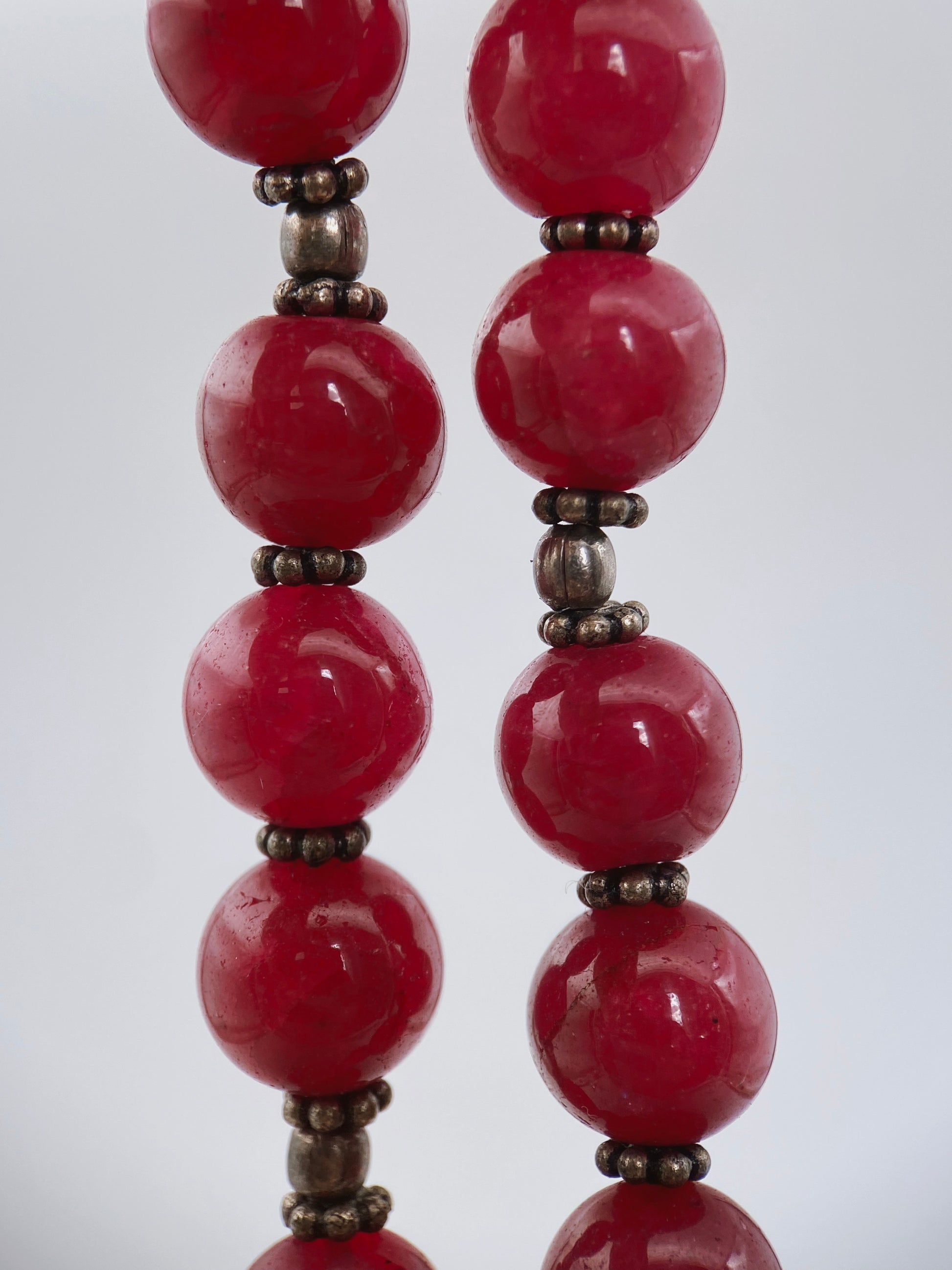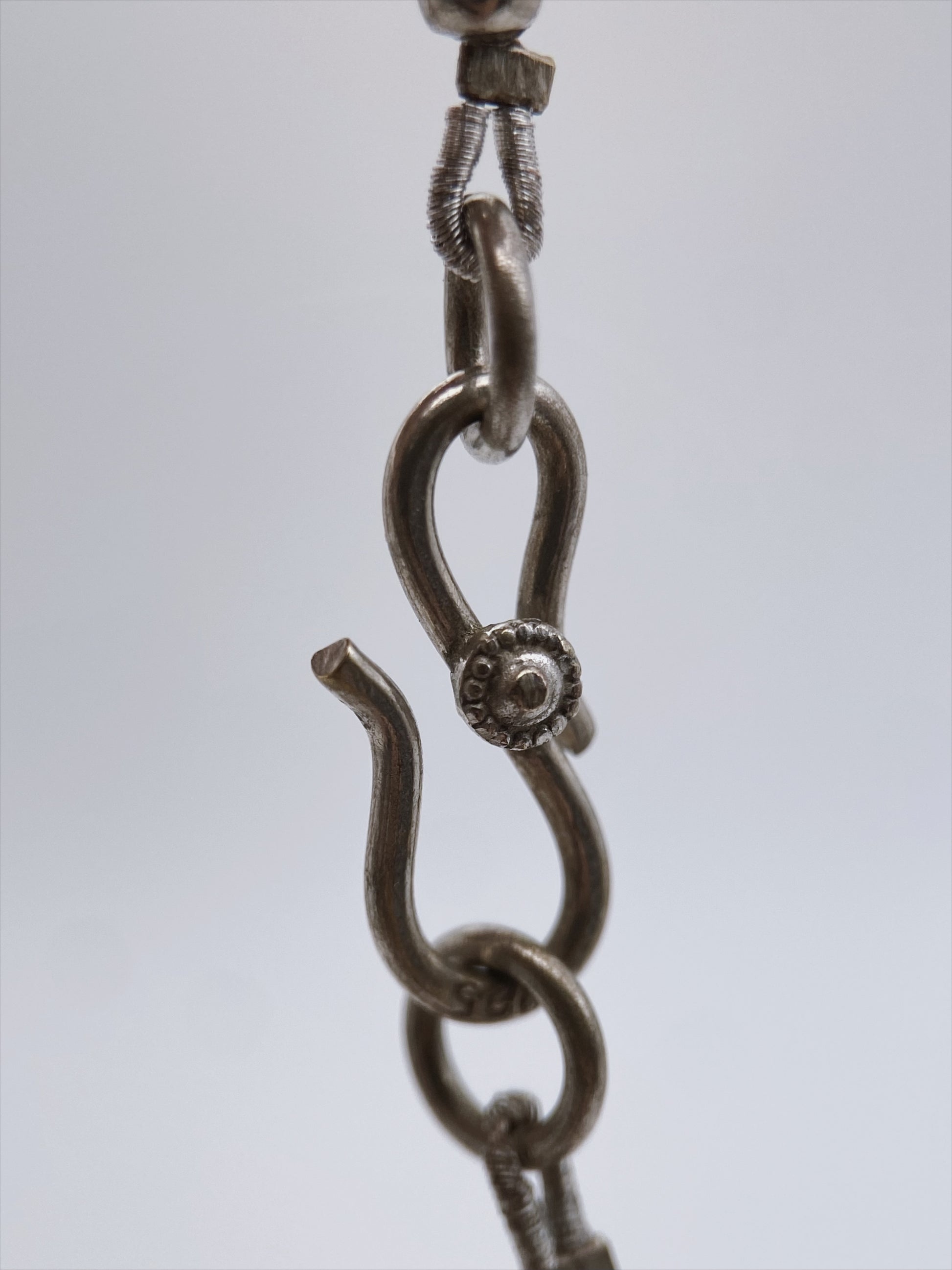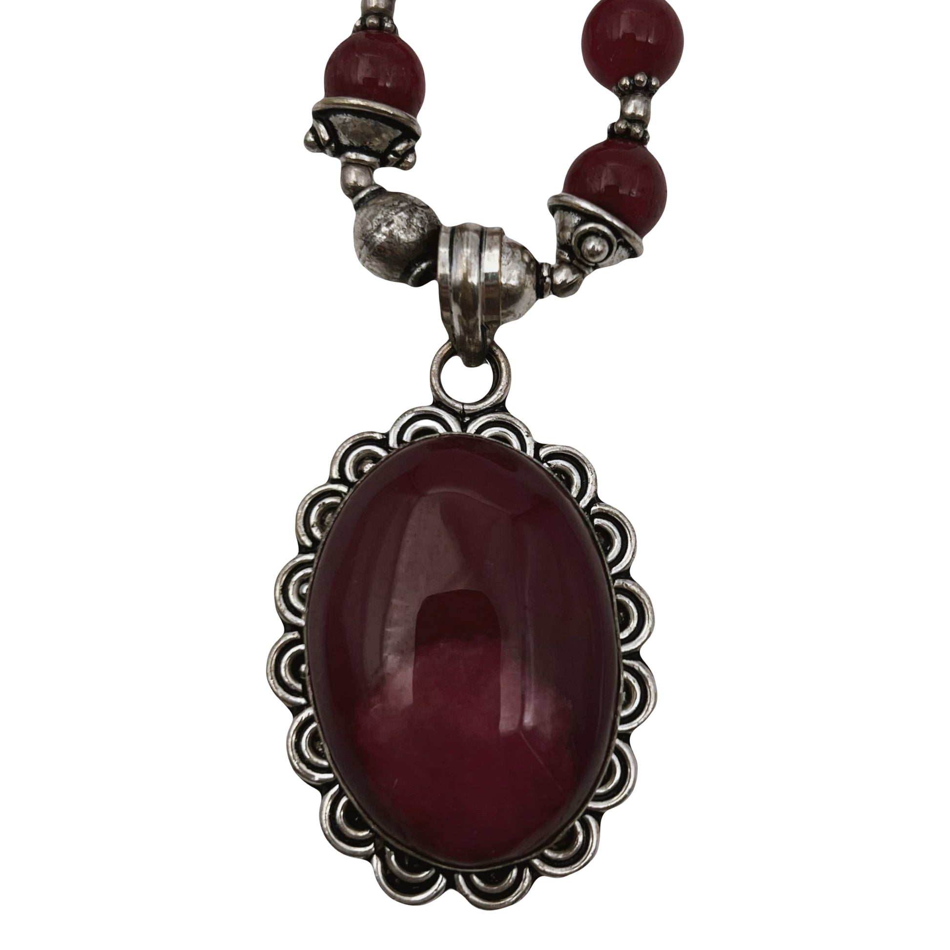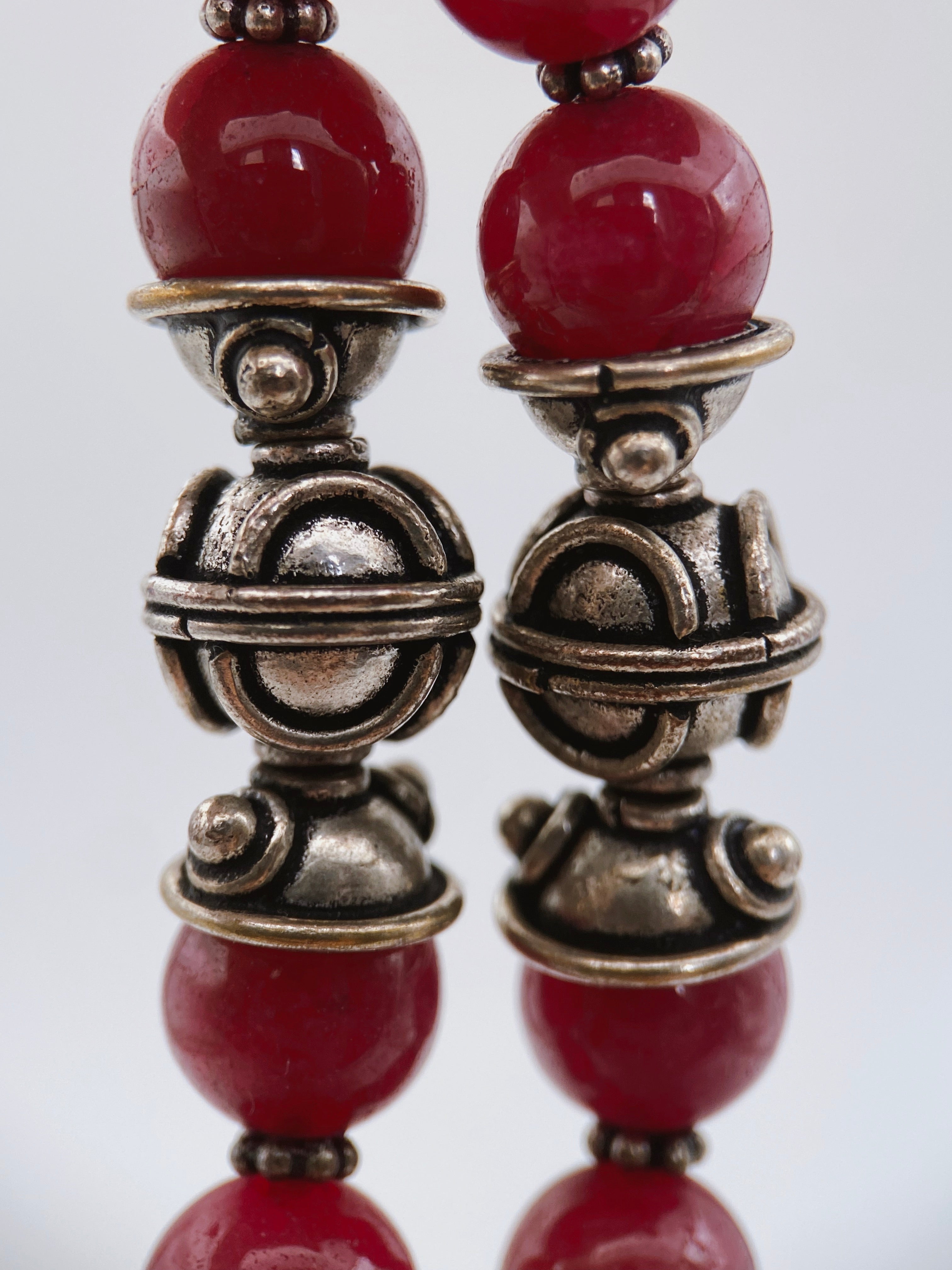 Šis masyvus etninio stiliaus vėrinys pagamintas iš 925 prabos sidabro ir ryškiai raudonų poliruotų natūralaus akmens karoliukų, tarp kurių įkomponuoti maži sidabro spalvos rutuliukai. Pagrindinis akcentas – didelis ovalus raudonas kabošonas, įstatytas į dekoratyvinį sidabro rėmelį su banguotu ornamentu, suteikiančiu papuošalui išraiškingumo ir autentiško rankų darbo įspūdį. Rankų darbo kabliuko formos užsegimas pažymėtas „925“, patvirtinančiu sidabro sudėtį. Dizainas primena Meksikos arba JAV pietvakarių regiono tradicinius sidabro papuošalus, o jo gamybos laikotarpis siekia maždaug 1990–2000 metus. Papuošalas yra geros būklės, su natūraliais oksidacijos ir nedideliais dėvėjimo požymiais, kurie pabrėžia jo charakterį ir unikalumą.