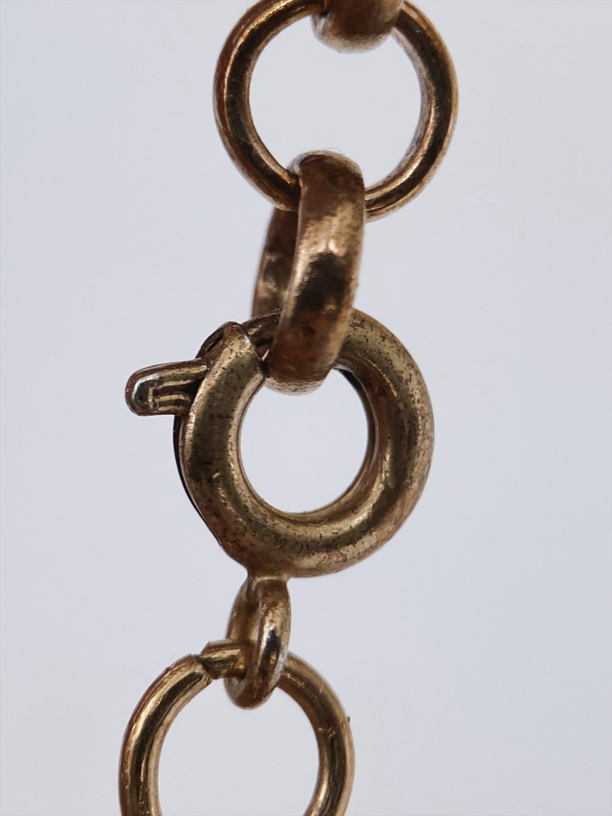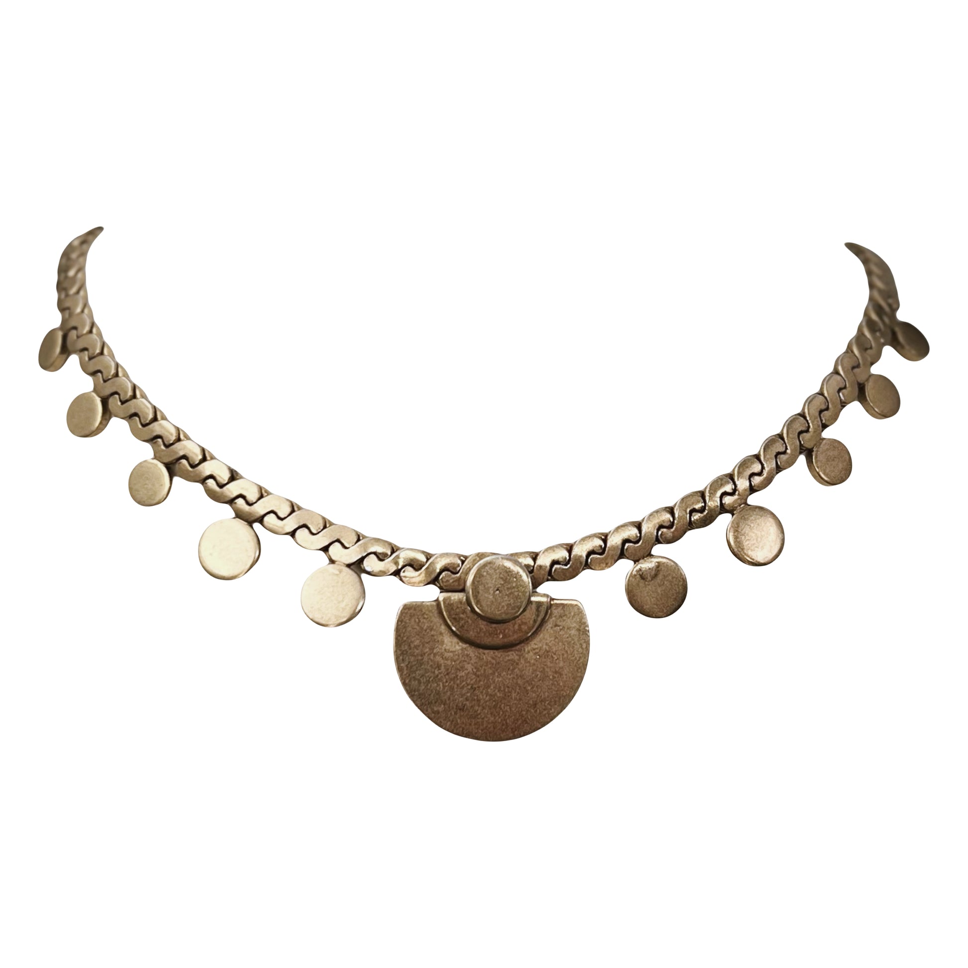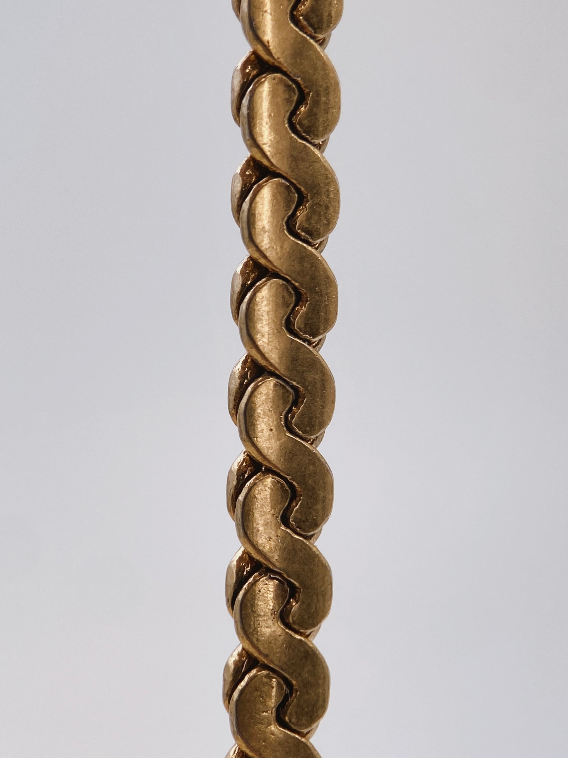 Šis papuošalas – vintažinis kaklo vėrinys, pagamintas iš aukso spalvos metalo, dekoruotas mažais apvaliais diskeliais bei centriniu pusmėnulio formos pakabuku. Grandinėlė pagaminta plokščios pintos „curb link“ tipo grandies technika, kuri suteikia masyvumo ir vientisumo įspūdį. Užsegimas – spyruoklinis žiedas (spring ring clasp), būdingas XX a. vidurio papuošalams. Stilius – modernistinis, primenantis 1960–1970 m. bižuteriją, kai buvo populiarios geometrinės formos ir minimalistiniai motyvai. Kolekcinėje rinkoje tokio tipo statement kaklo vėriniai be žymėjimo dažniausiai parduodami kaip dekoratyviniai retro papuošalai – jų vertė svyruoja apie 40–80 EUR.