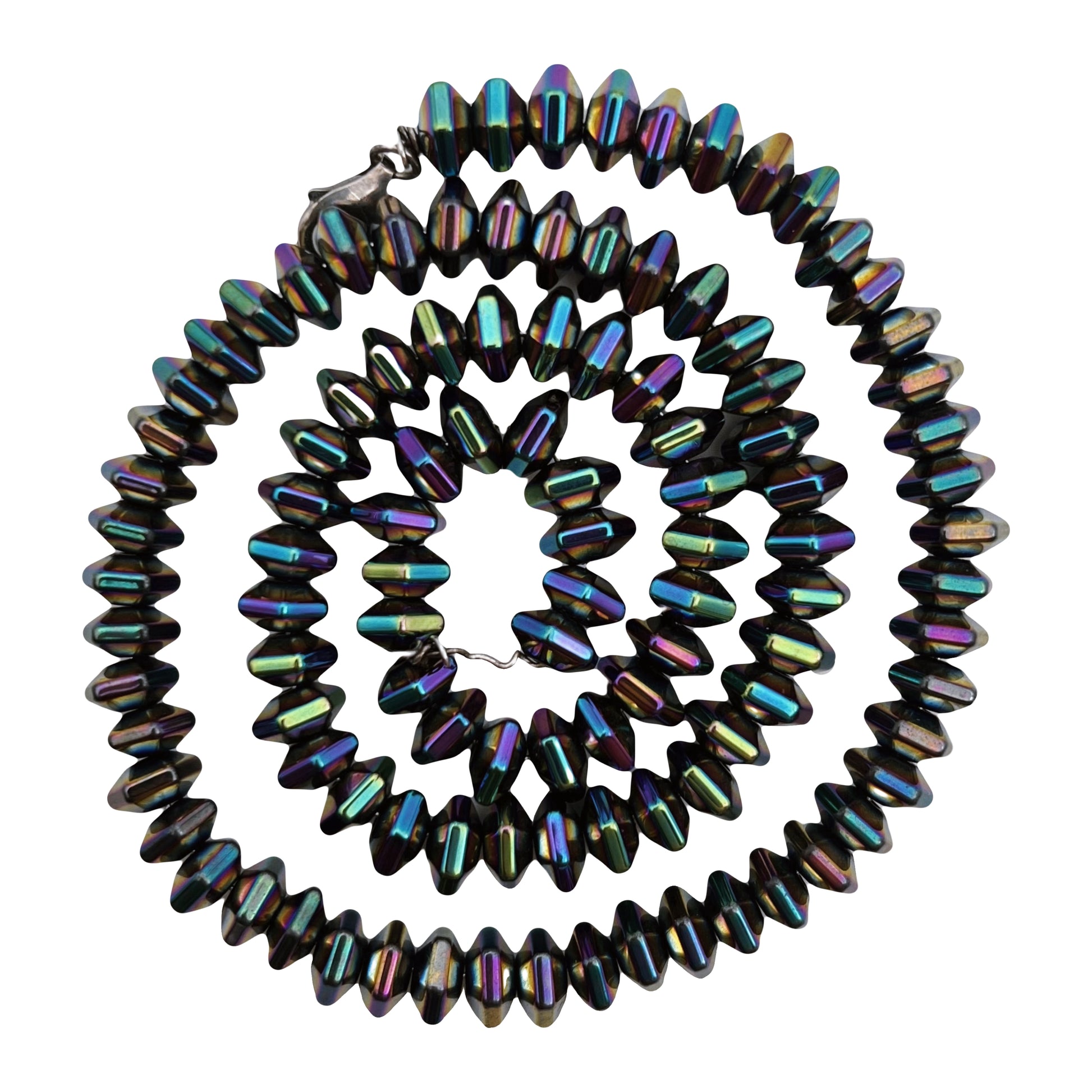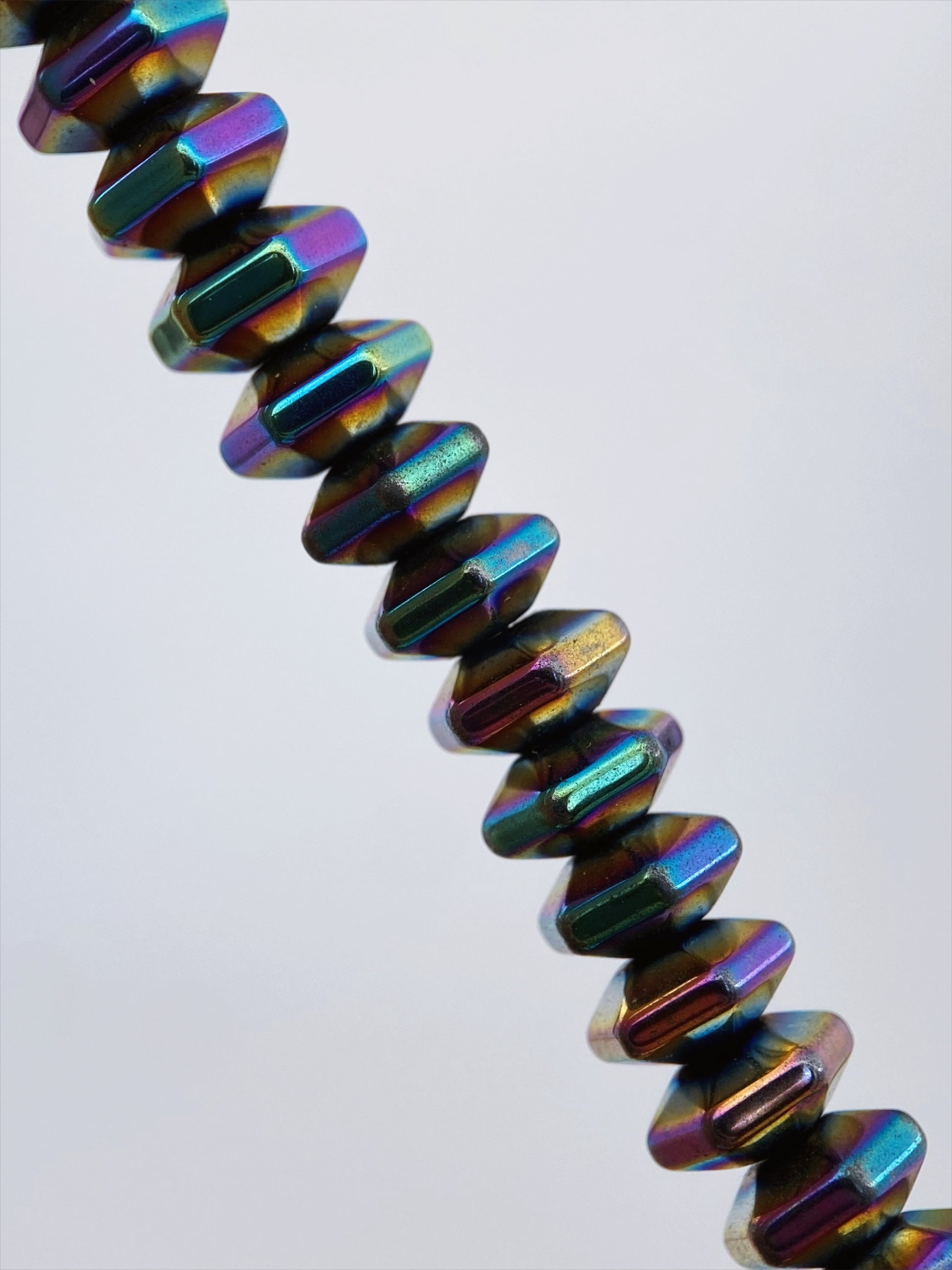 Šis elegantiškas vėrinys sudarytas iš blizgių, daugiaspalvių titano hematito karoliukų, pasižyminčių vaivorykštiniu (rainbow) atspalvių žaismu – nuo mėlynos iki aukso.