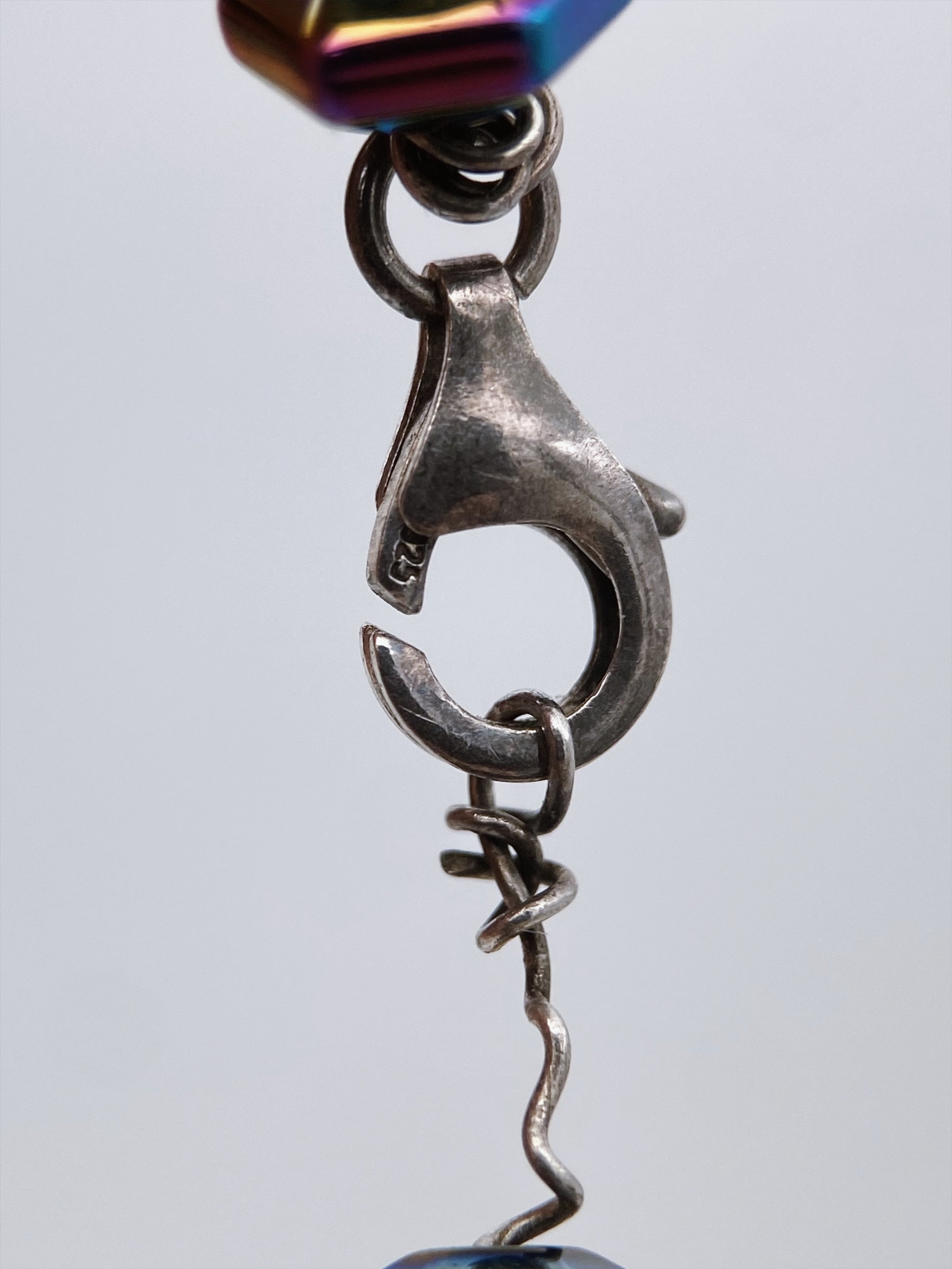 Sudėtis: titano hematitas, sidabras Būklė: labai gera Išmatavimai: 47 cm Spalva: mėlyna, juoda, sidabro Žymėjimas: “925” Šalis: JAV Laikotarpis: 1980-1990 metai Rinkos vertė: 40-60 EUR