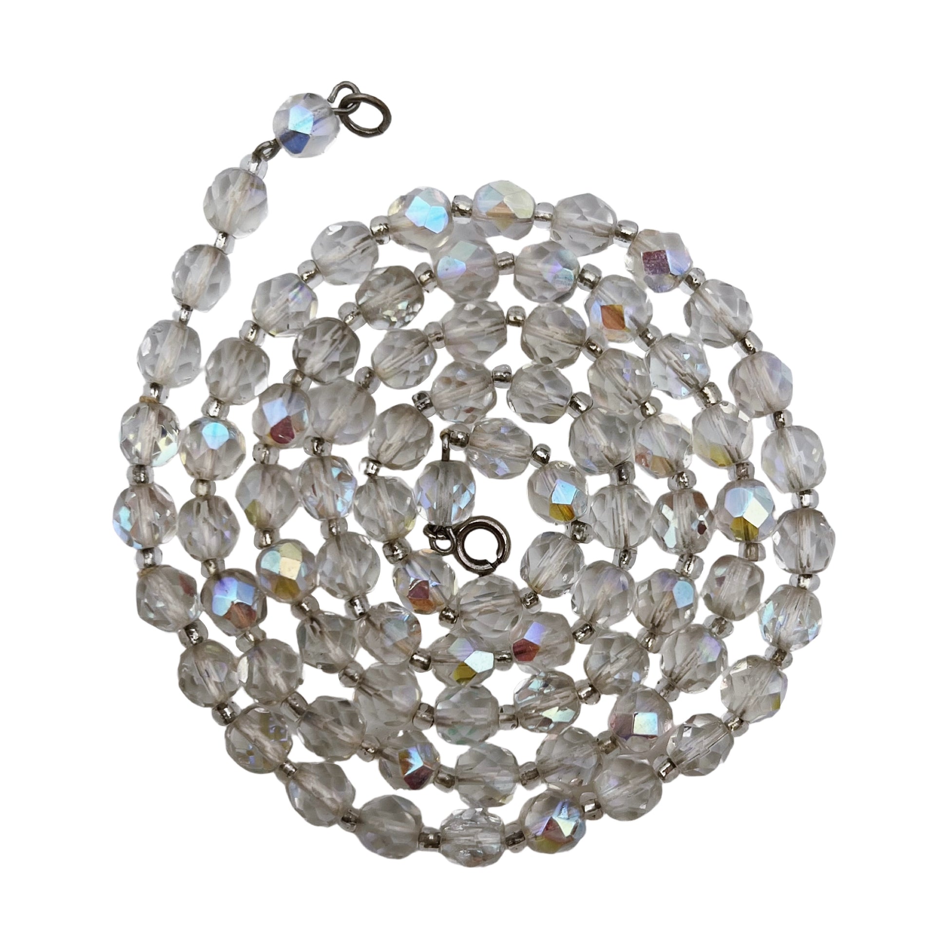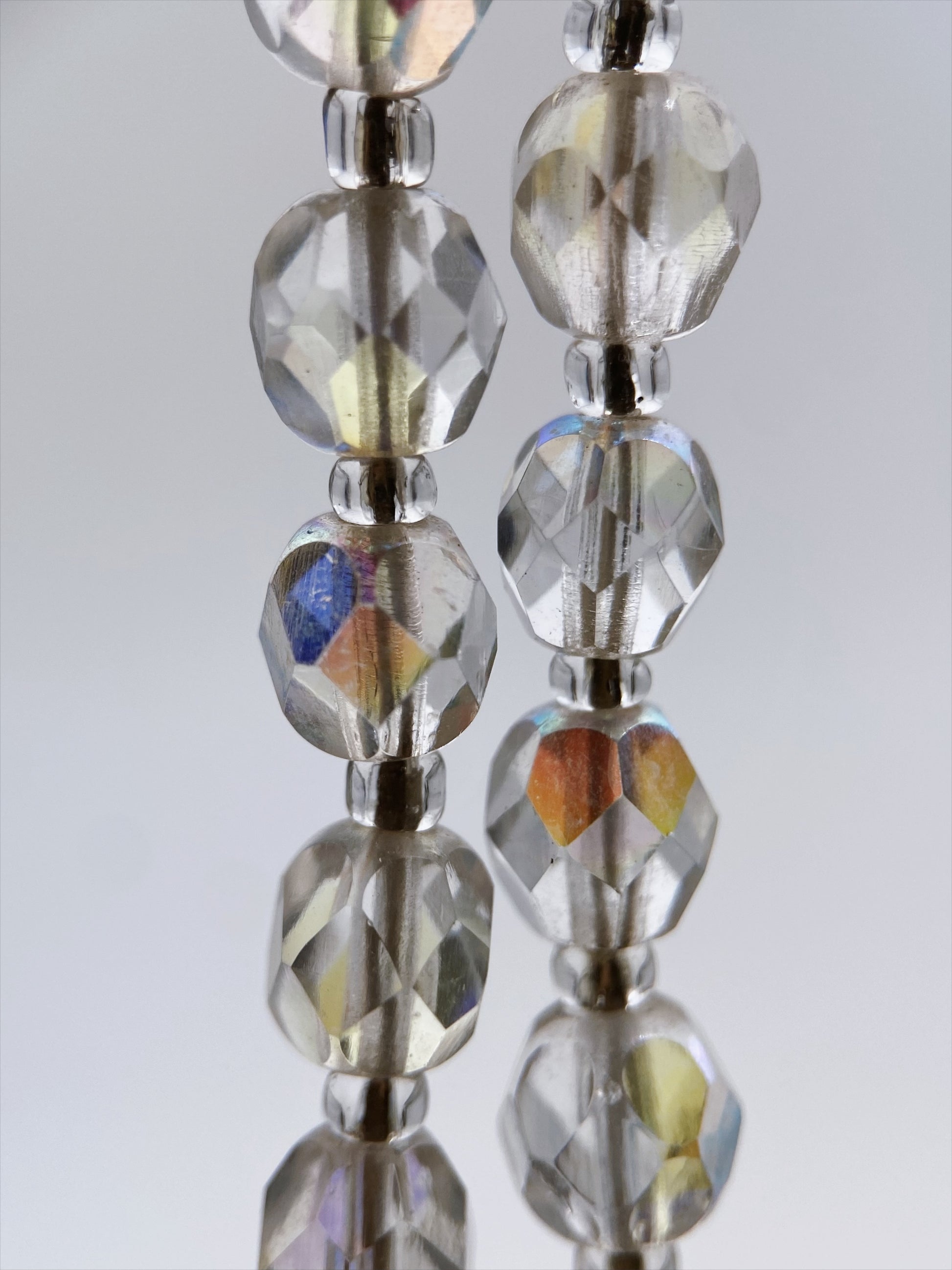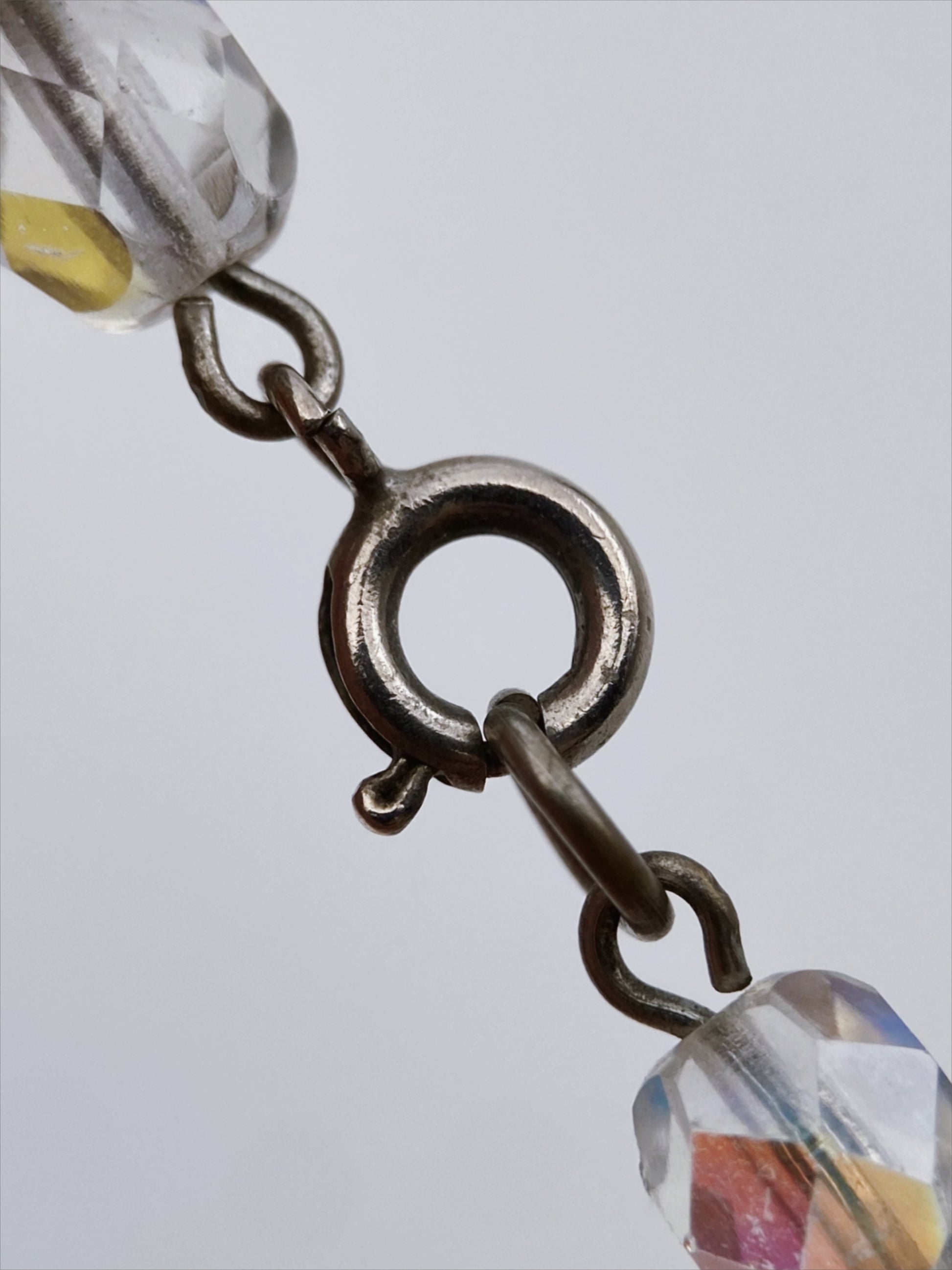 Subtilaus spindesio vėrinys iš briaunuotų krištolo karoliukų, dengtų Aurora Borealis (šiaurės pašvaistės) danga, kuri sukuria švelnų melsvai auksinį atspindį. Kiekvienas karoliukas sujungtas metaliniais nareliais, o vėrinys užsegamas klasikiniu spyruokliniu žiedeliu. Tai autentiškas XX a. vidurio papuošalas – elegantiškas, laikui nepavaldus aksesuaras, būdingas 1950–1960 m. mados stiliui.