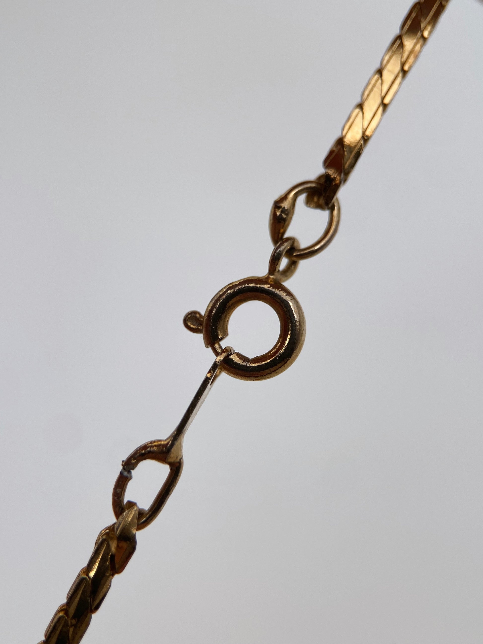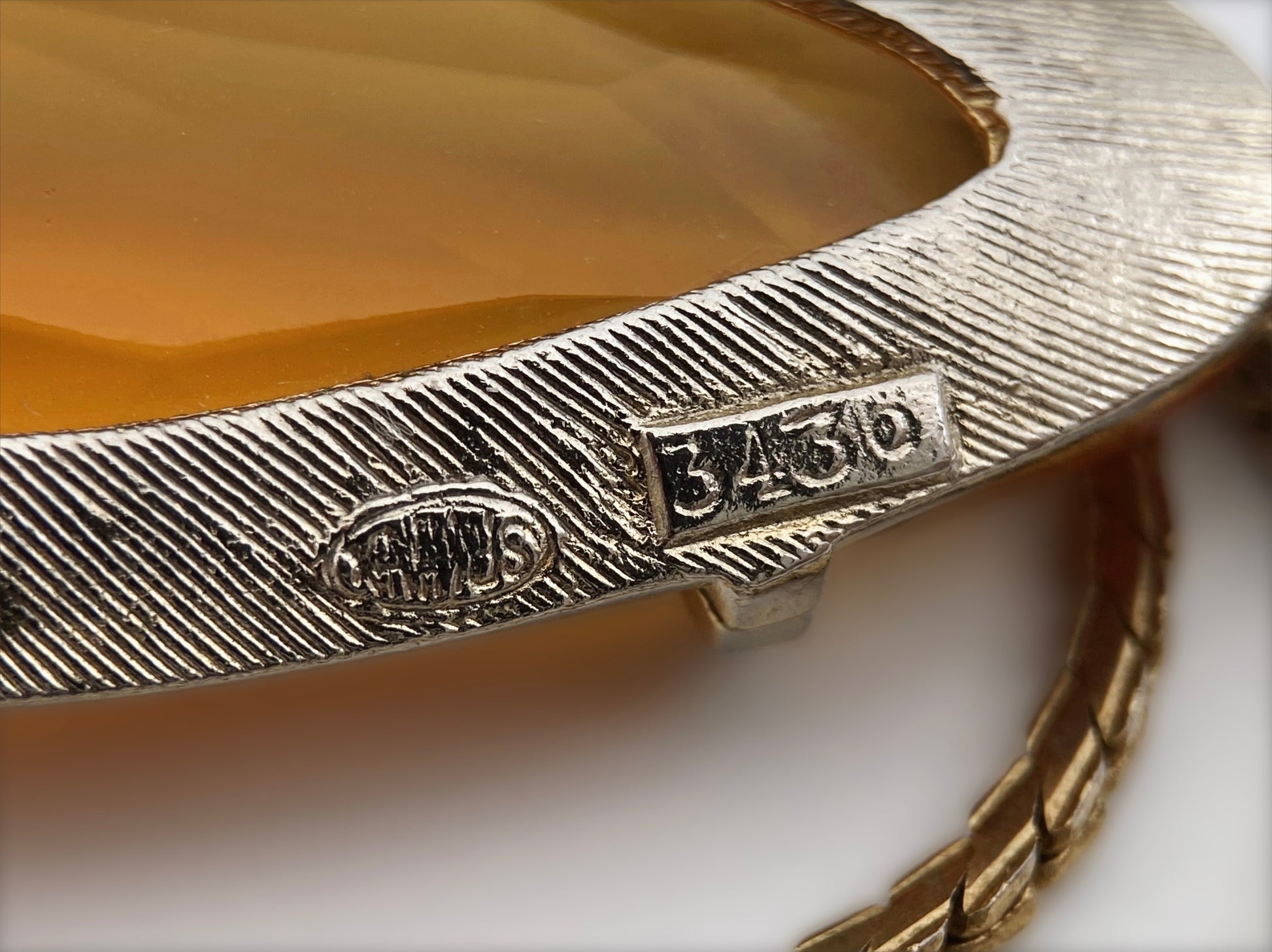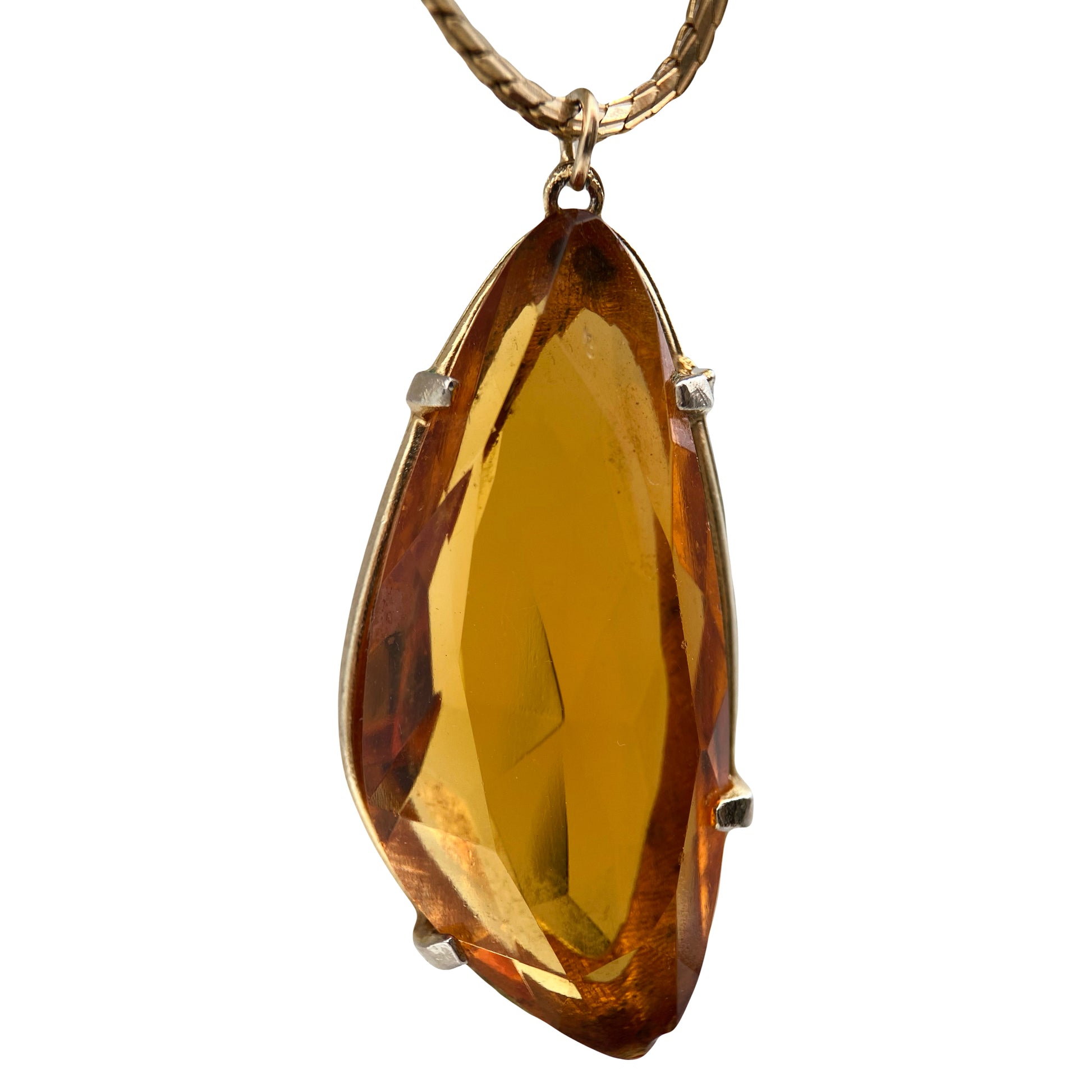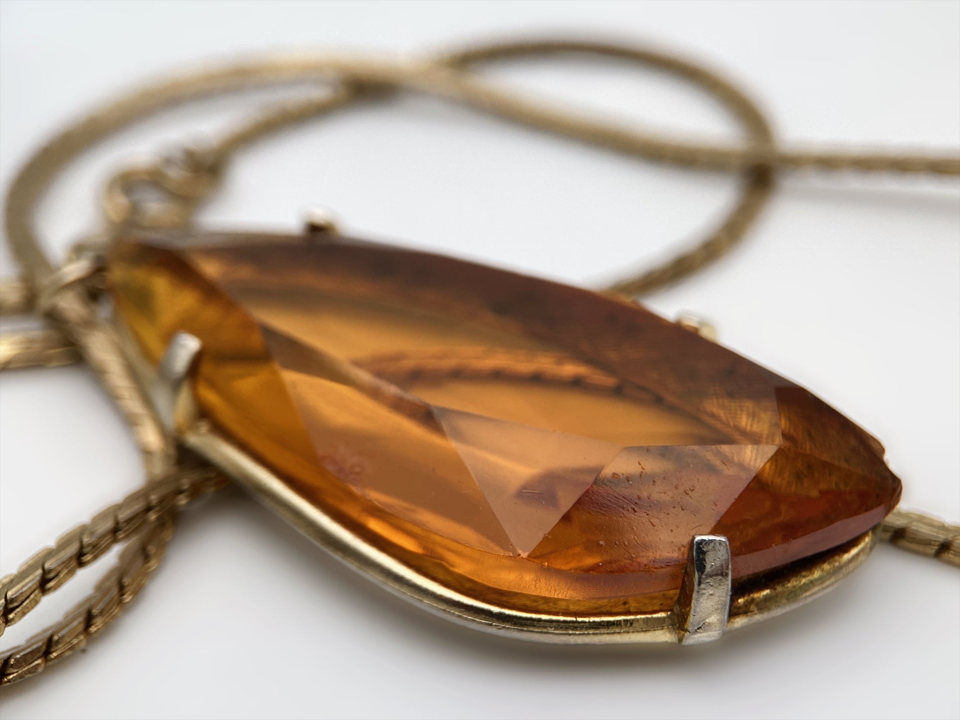 Grandinėlė ir SPHINX vintažinis britiškas pakabukas iš 1960–1970 m. laikotarpio. Papuošalas dekoruotas didelio briaunavimo gintaro atspalvio stiklo kristalu, įstatytu į aukso spalvos tekstūrinį rėmelį. Ant nugarėlės matyti ovali SPHINX žyma ir modelio numeris 3436, būdingas šio britų papuošalų gamintojo gaminiams. Šis pakabutis pasižymi tipišku „Sphinx“ stiliumi – aukštos kokybės metalas, subtilus detalumas ir elegantiškas, rafinuotas akmens įtvirtinimas, todėl jis vertinamas kolekcininkų visame pasaulyje.