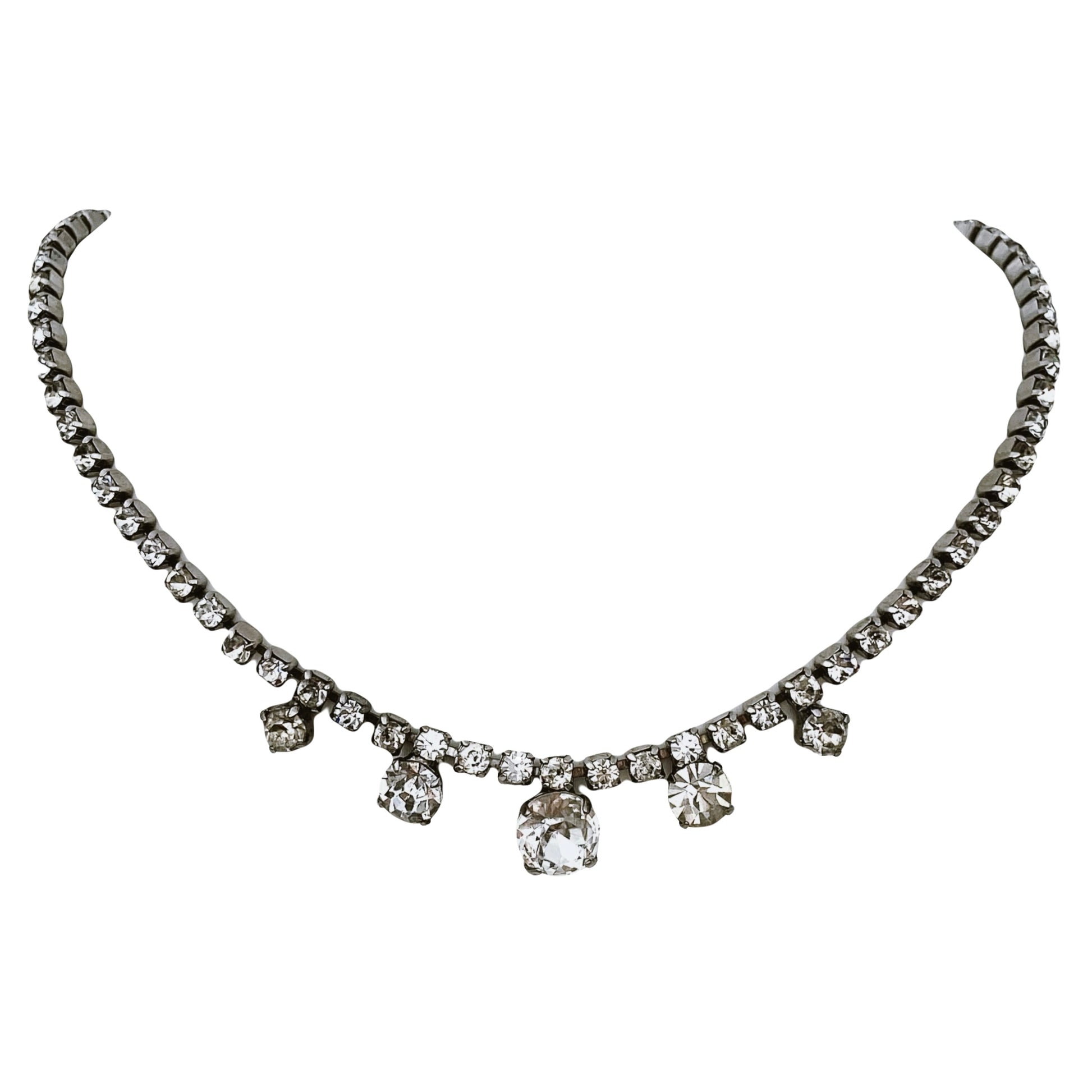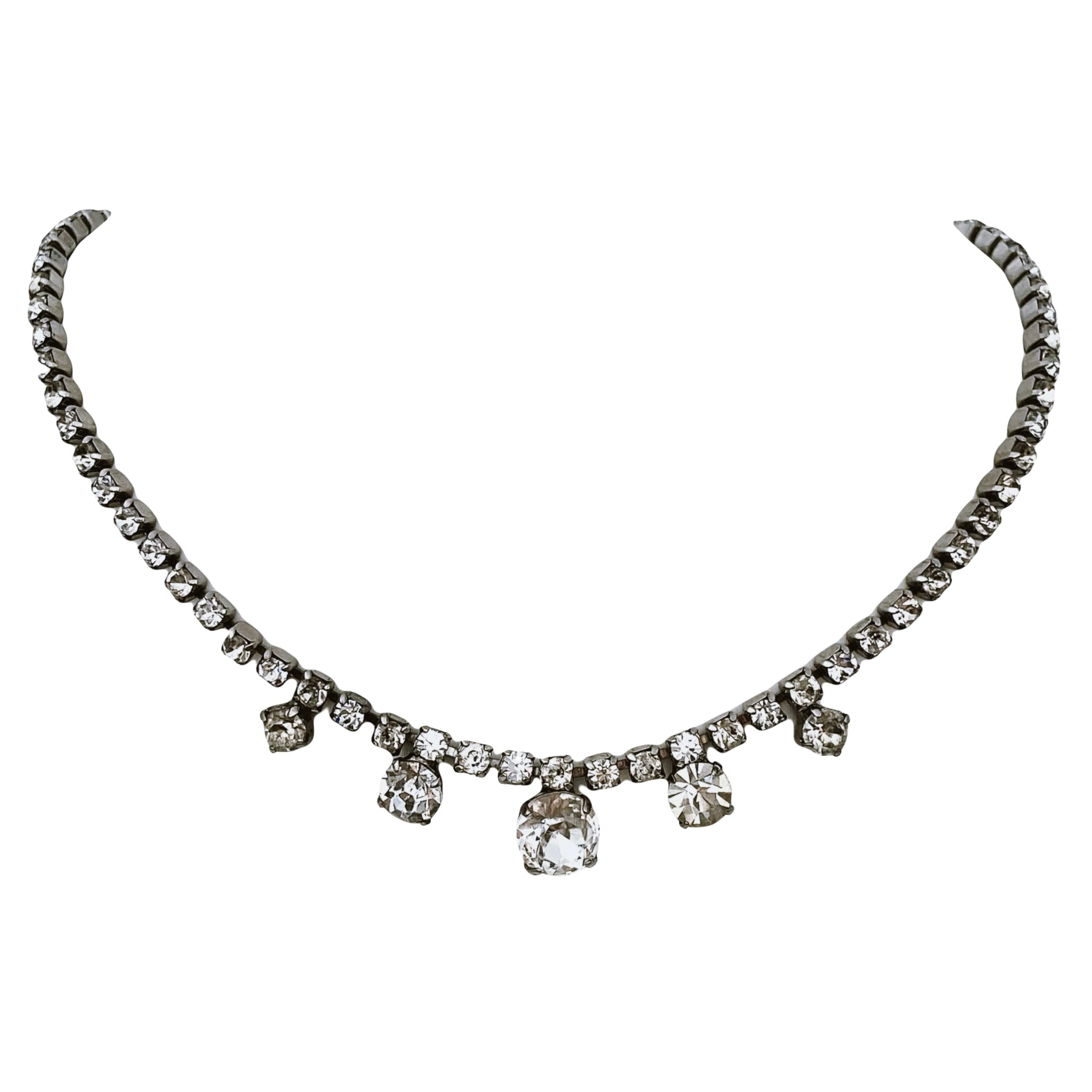 Šis vėrinys iš skaidrių kristalų su centrine puošyba bei sagtimi, kuri atsidaro iš šono (box clasp), būdingas 1950–1960 m. JAV papuošalų gamybai.