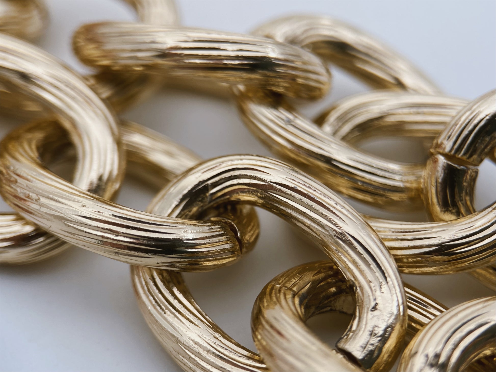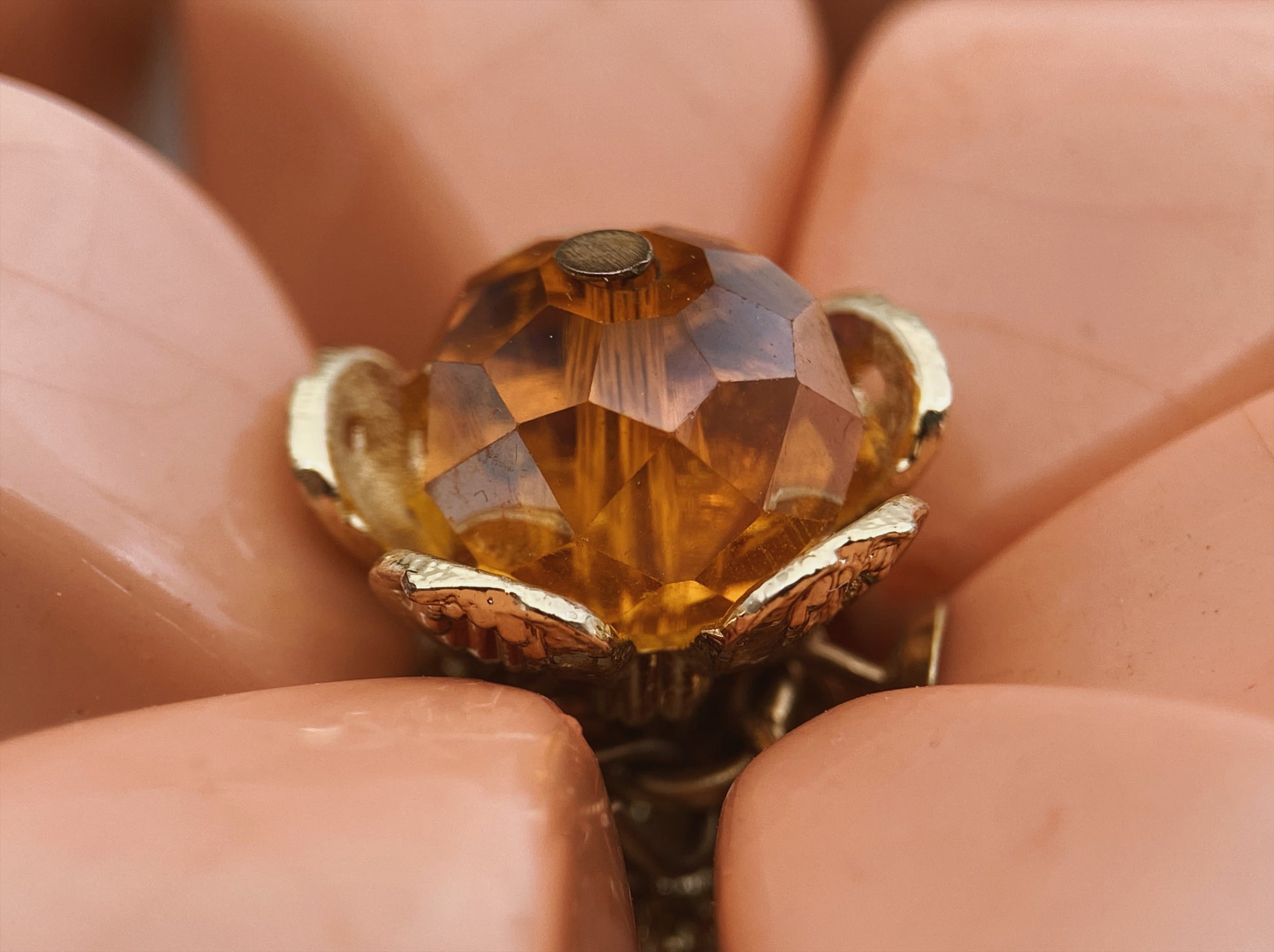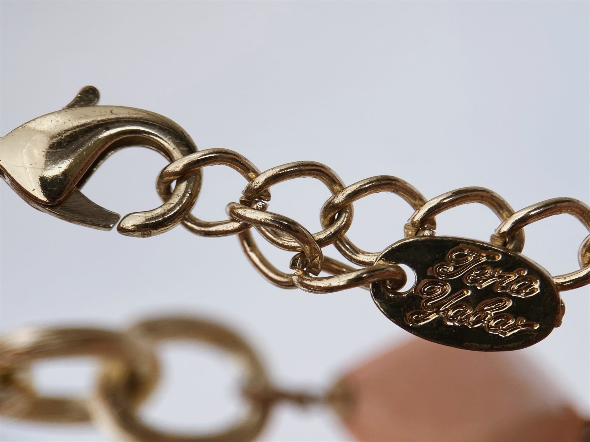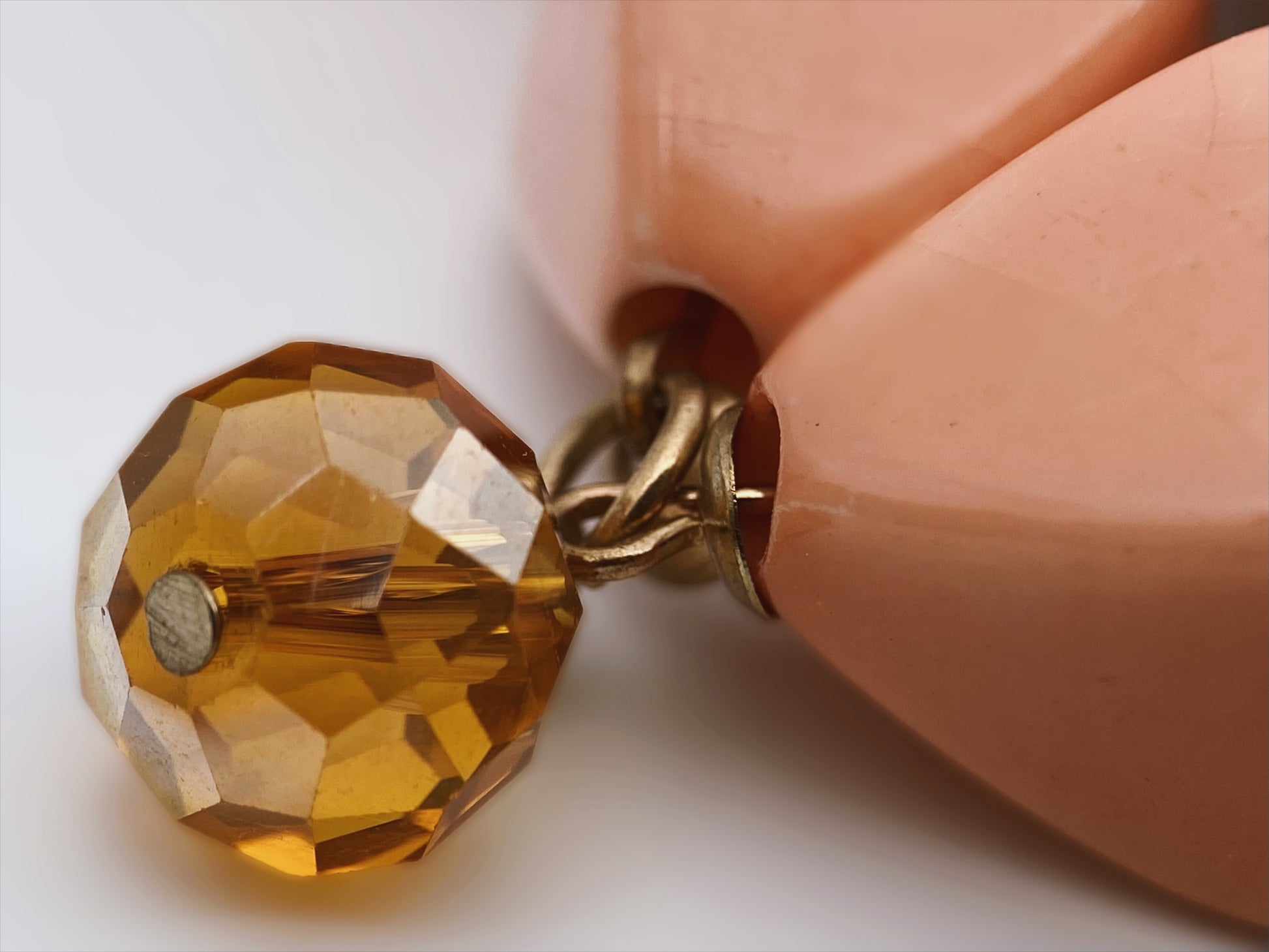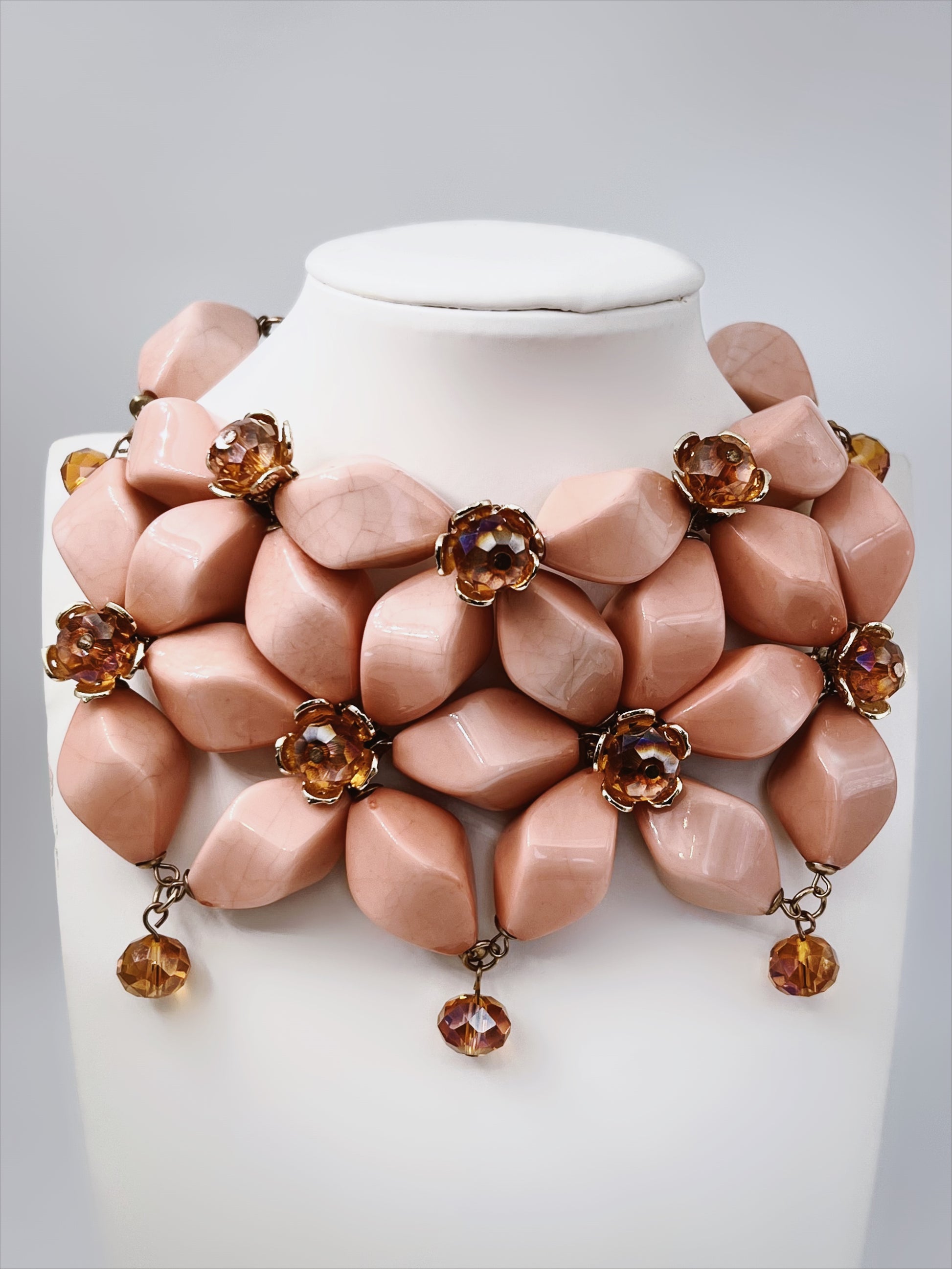 Šis įspūdingas vėrinys yra iš Teria Yabar – ispaniško prekinio ženklo, garsėjančio savo drąsiais, teatrališkais, spalvingais aksesuarais, ypač vėriniais. Daugiasluoksnis, stambus, iš masyvių rožinės spalvos geometrinių karoliukų (akrilas arba derva, primenanti rožinį opalitą ar marmurą). Puoštas dideliais facetiniais akmenimis metaliniuose žiedlapių formos laikikliuose – labai būdingas Teria Yabar motyvas. Karoliukų forma – netaisyklingai šlifuoti romboidai, suteikiantys papuošalui skulptūrišką apimtį.