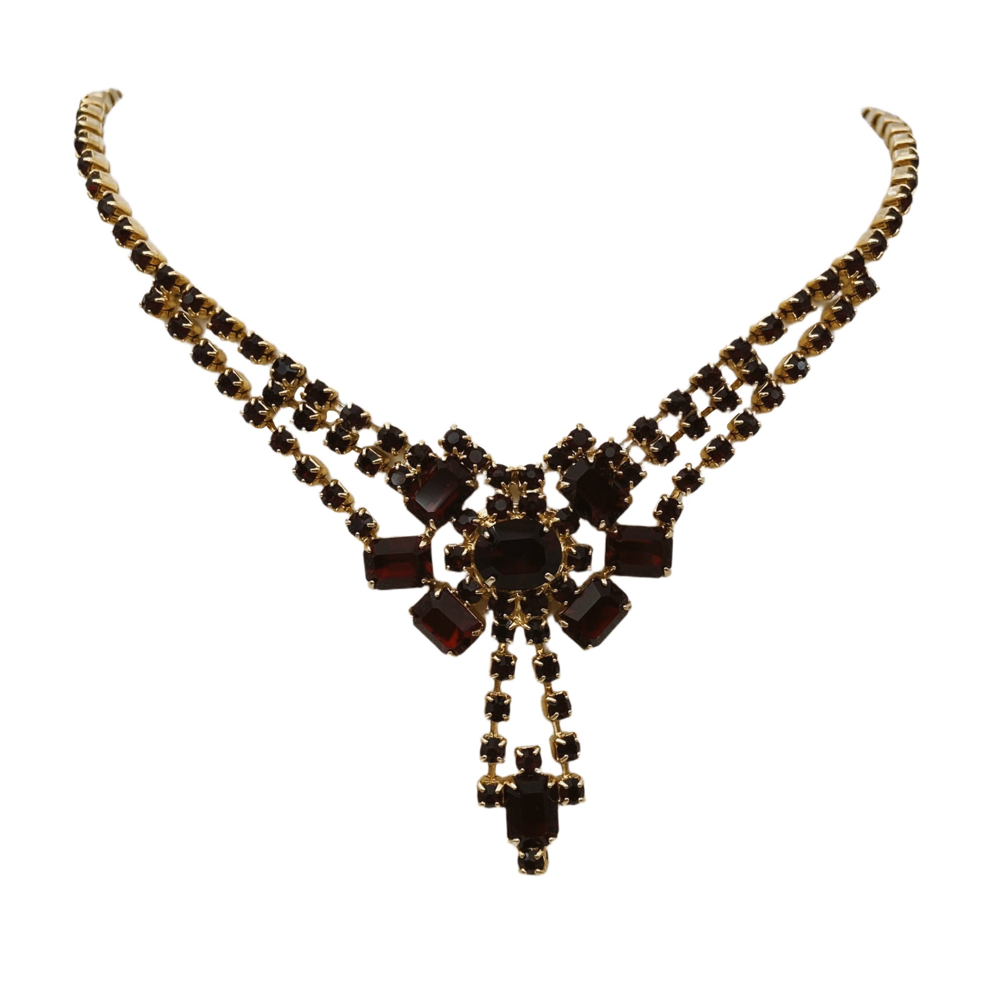 Įspūdingas XX a. vidurio vėrinys, sukurtas 1950–1960 m., kai papuošalai buvo tikras elegancijos simbolis. Auksuoto metalo grandinėlė puošta gilios raudonos spalvos stiklo kristalais, primenančiais granatus. Kompozicijos centras – masyvus ornamentuotas pakabuka