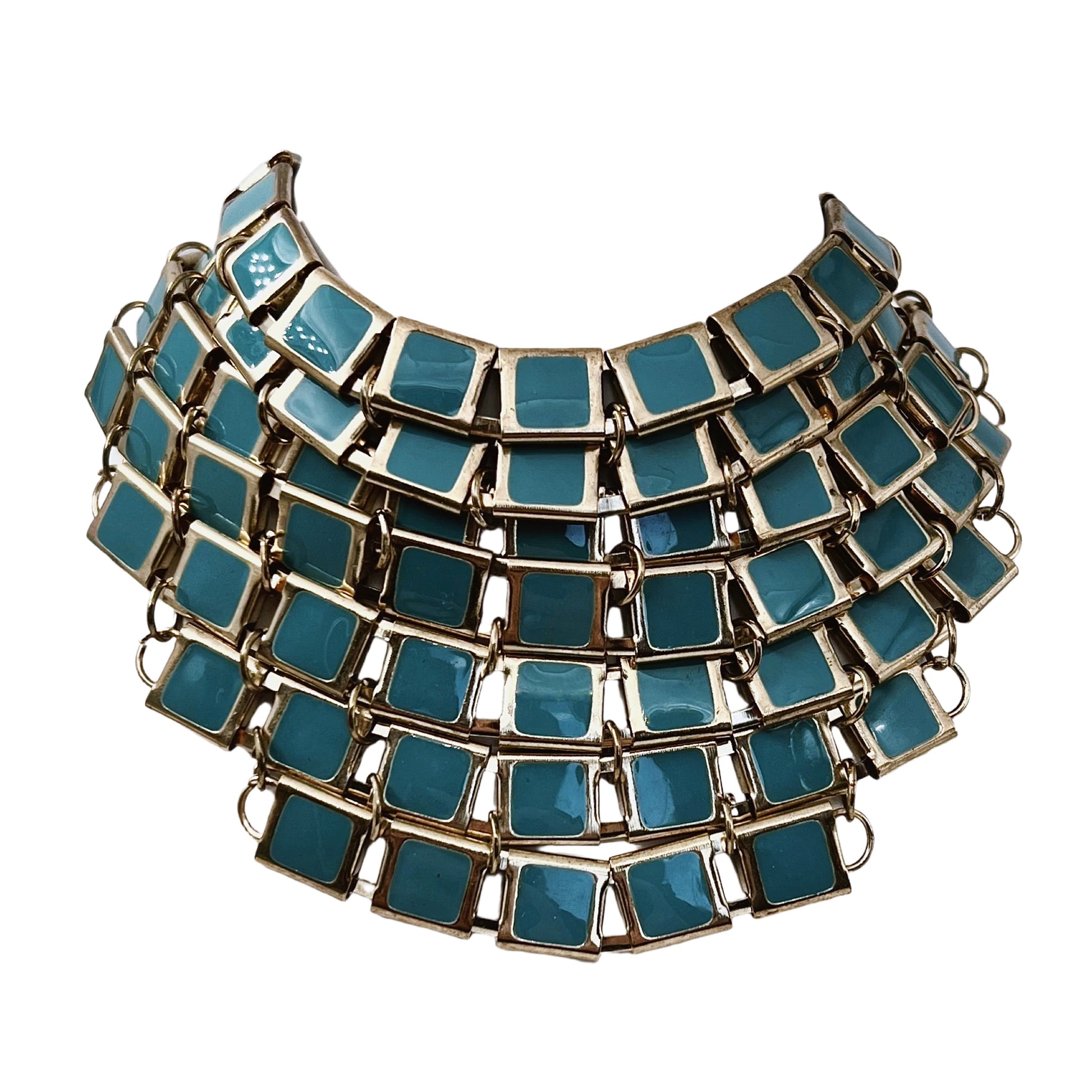 Šis masyvus, daugiasluoksnis vėrinys yra išskirtinio dizaino ir labai dekoratyvus. Forma: platus „collar“ (apykaklės) tipo vėrinys. Sudarytas iš daugybės kvadratinių segmentų su žalsvai mėlynais emaliuotais intarpais. Segmentai sujungti žiedeliais, todėl vėrinys yra lankstus, bet išlaiko struktūrišką formą. Stilius: modernistinis arba egiptietiškai įkvėptas (inspiruotas “collar necklace” stiliaus).