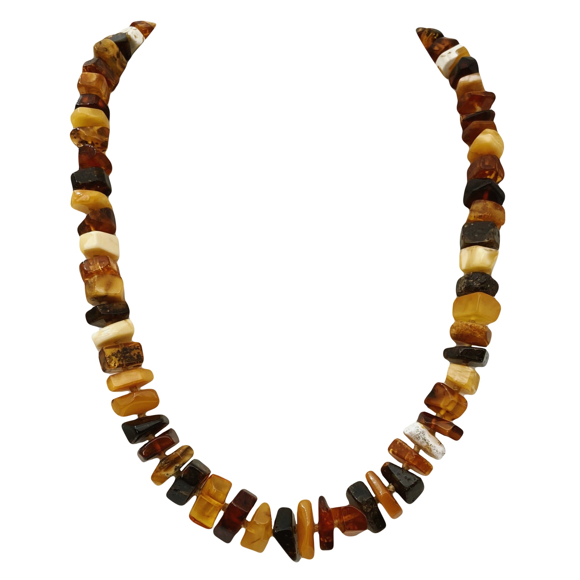 Šis kaklo papuošalas yra išskirtinis natūralaus Baltijos gintaro vėrinys, pirktas Prancūzijoje. Išsiskiria dideliais, netaisyklingais daugiakampiais gintaro karoliais, kurie demonstruoja plačią gintaro spalvų gamą: nuo medaus, konjako, sviestinio baltumo iki tamsiai vyšninės. Plati gintaro spalvų paletė – itin vertinama kolekcininkų. Kiekvienas karoliukas skirtingas, sukuriant natūralumo ir išskirtinumo įspūdį. Dažnai šie papuošalai yra rankų darbo dizaino galerijų kūriniai, o ne masinė gamyba.