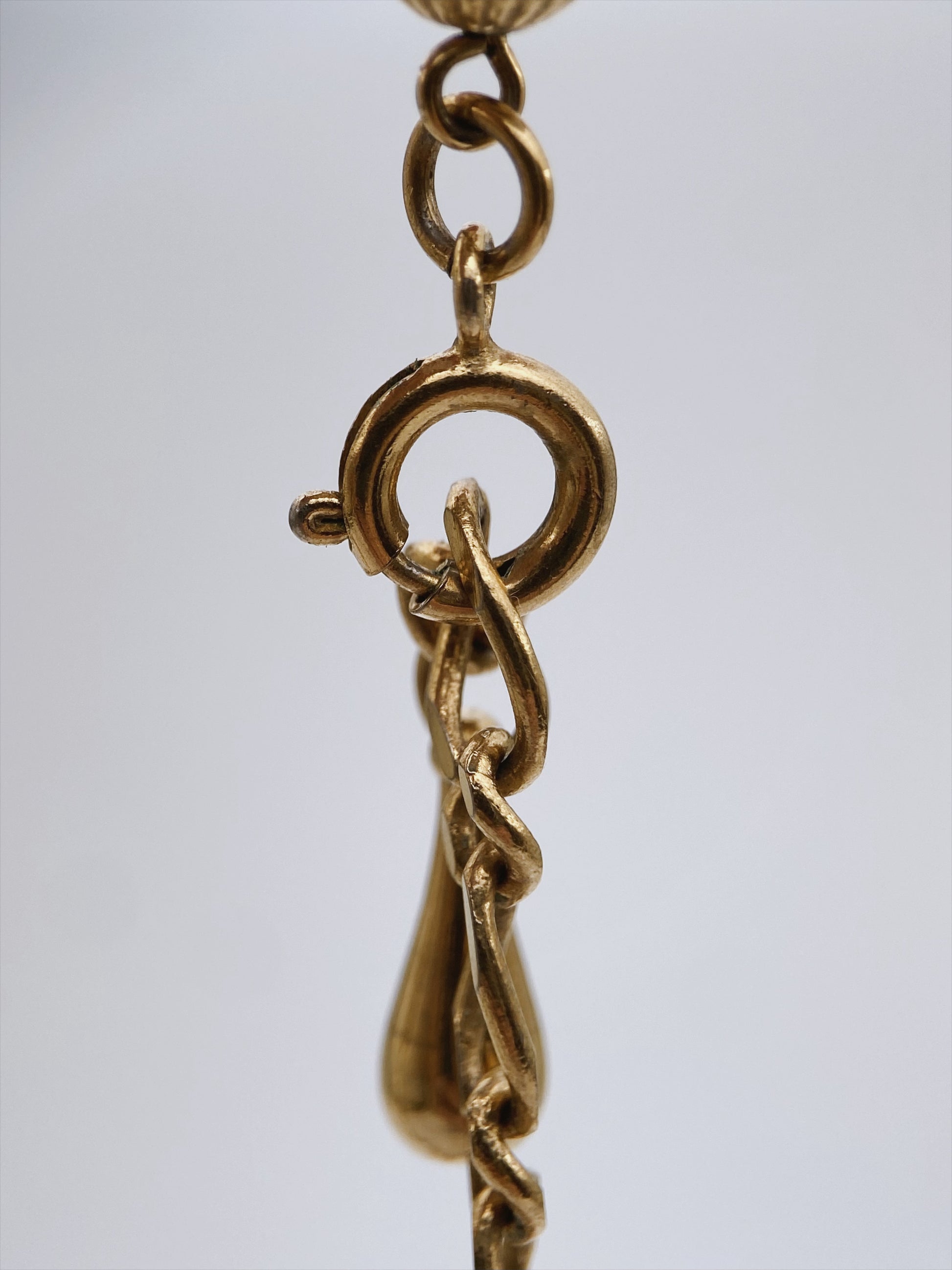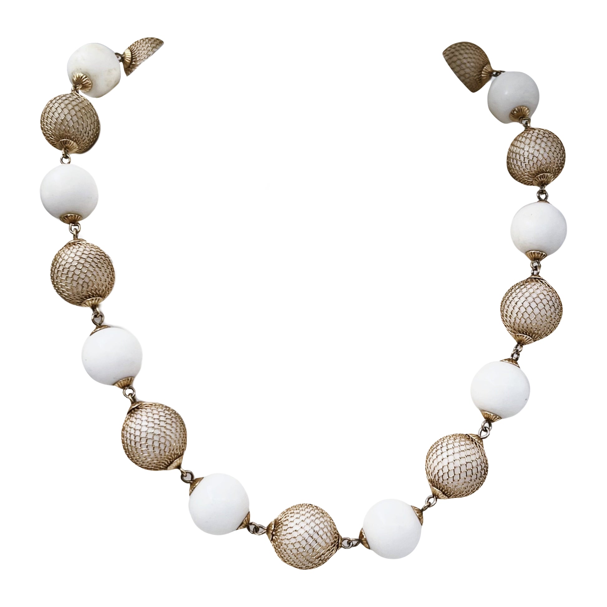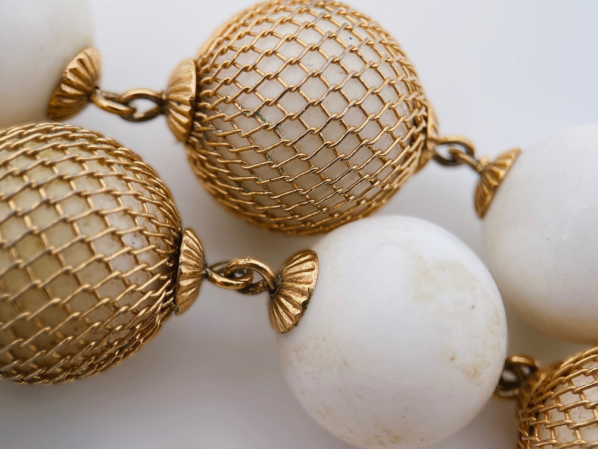 Šis vėrinys yra “Trifari” kūrinys – atpažįstamas pagal būdingą elegantišką konstrukciją ir kokybišką medžiagų derinį. Dideli baltos spalvos karoliukai iš lucito, auksinio tono filigraniniai karoliukai – su metaliniu tinkliuku, būdinga 1950–1960 m. “Trifari” dizainui. Karoliukai išdėstyti simetriškai, kiekvienas su dekoratyviniu „cap“ tipo užbaigimu, sujungti su mažu metalo elementu – tipiška rafinuotai „Trifari“ apdailai. Toks dizainas buvo labai populiarus Trifari „Alfred Philippe” eros metu (ypač vėlyvuoju laikotarpiu, apie 1955–1965 m.).