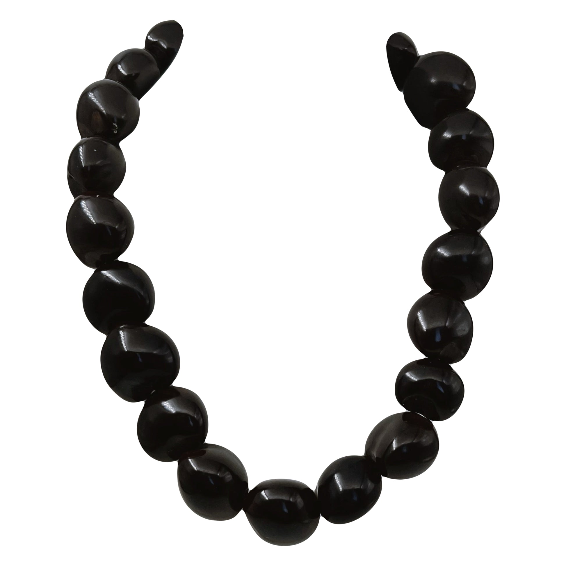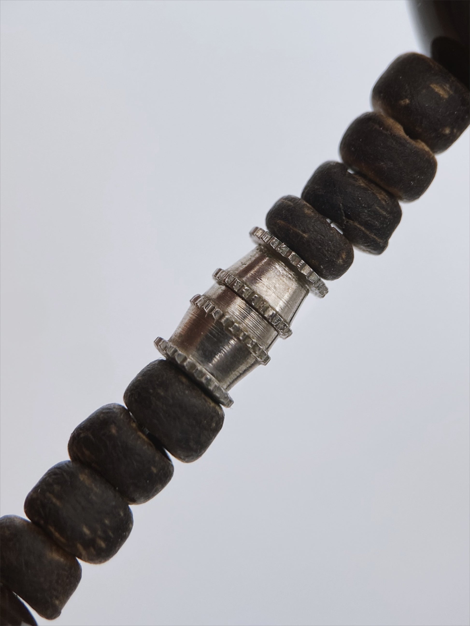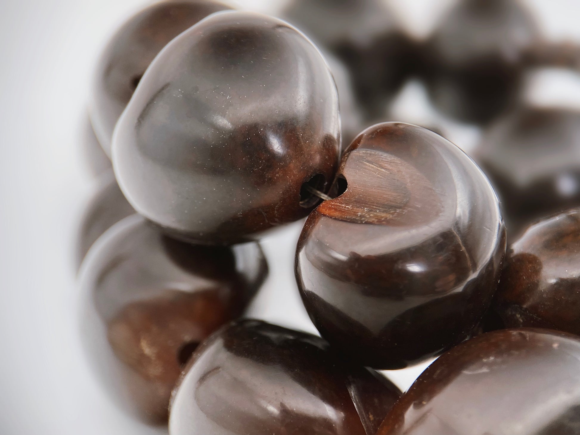 Šis vėrinys pagamintas iš tagua – vadinamojo „daržovinio dramblio kaulo“ (angl. vegetable ivory), kuris išgaunamas iš Pietų Amerikos palmių riešutų (ypač Phytelephas genties). Tai viena iš ekologiškiausių ir patvariausių organinių medžiagų, naudojama papuošalams, sagoms ir rankdarbiams nuo XIX a. pab. Karoliai turi švelniai lenktą, netobulą formą, būdingą natūraliems šlifuotiems riešutams. Paviršiuje matomas pusiau blizgus, riebokas atspindys. Išdidintame plane matosi gyslų struktūra, dažna tagua riešuto bruožas.