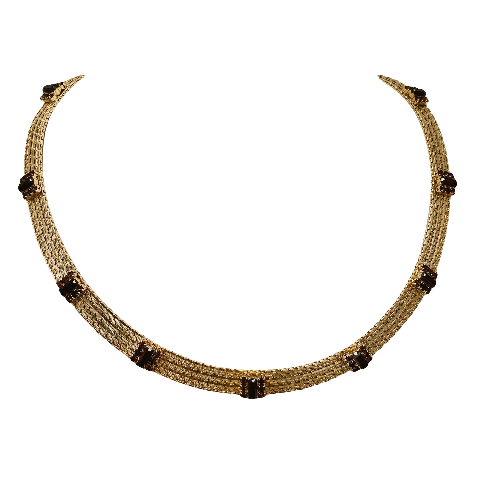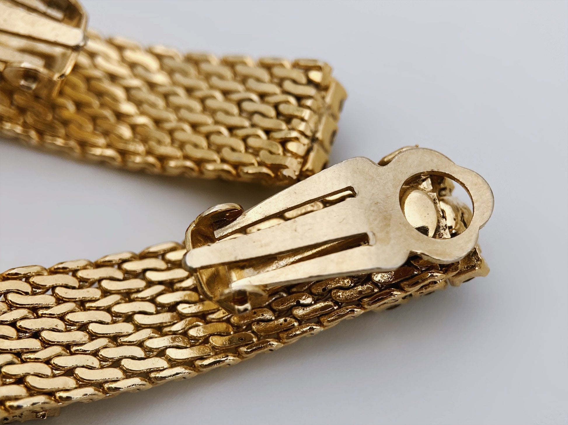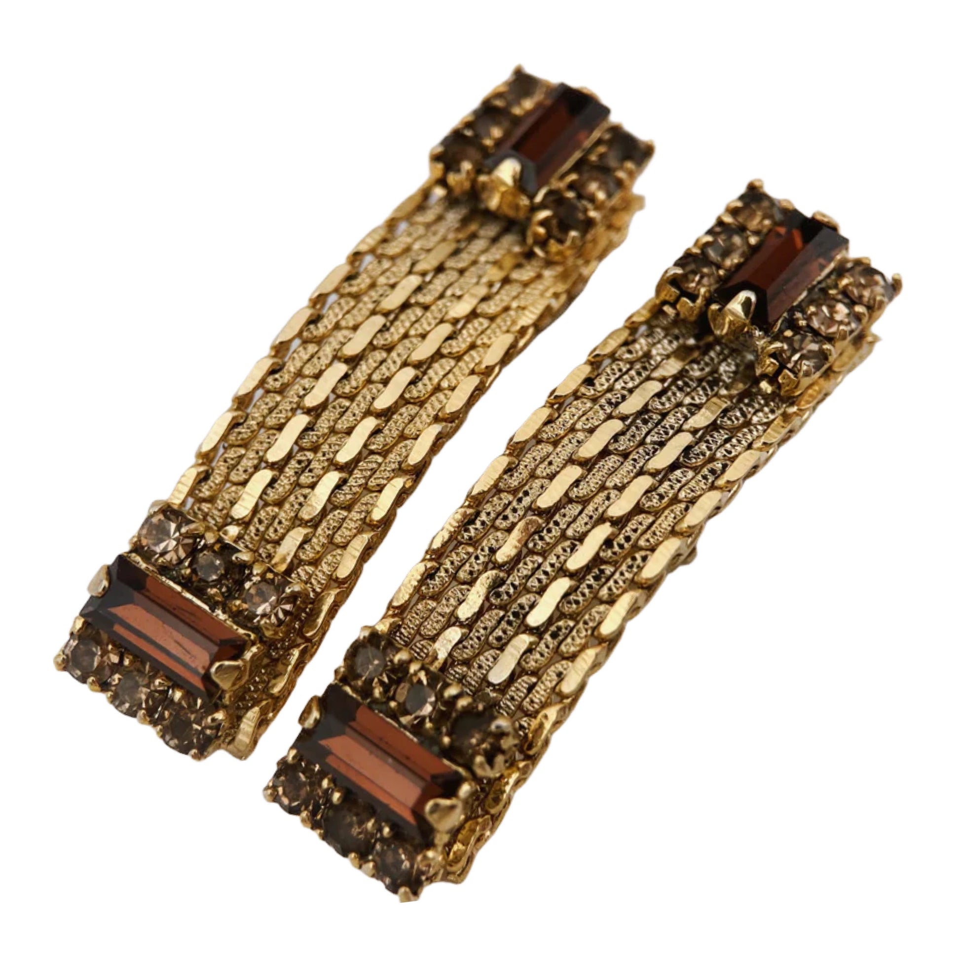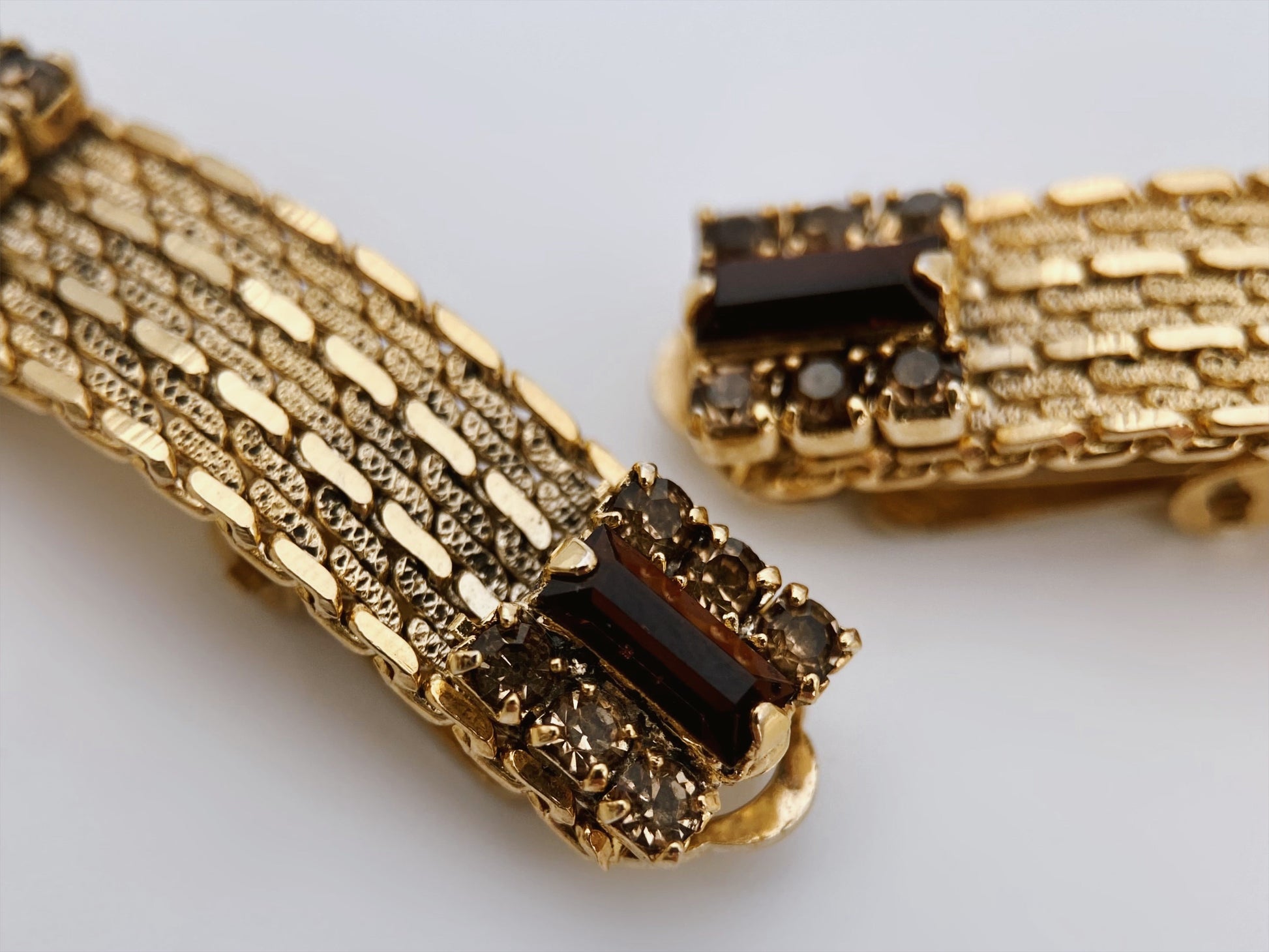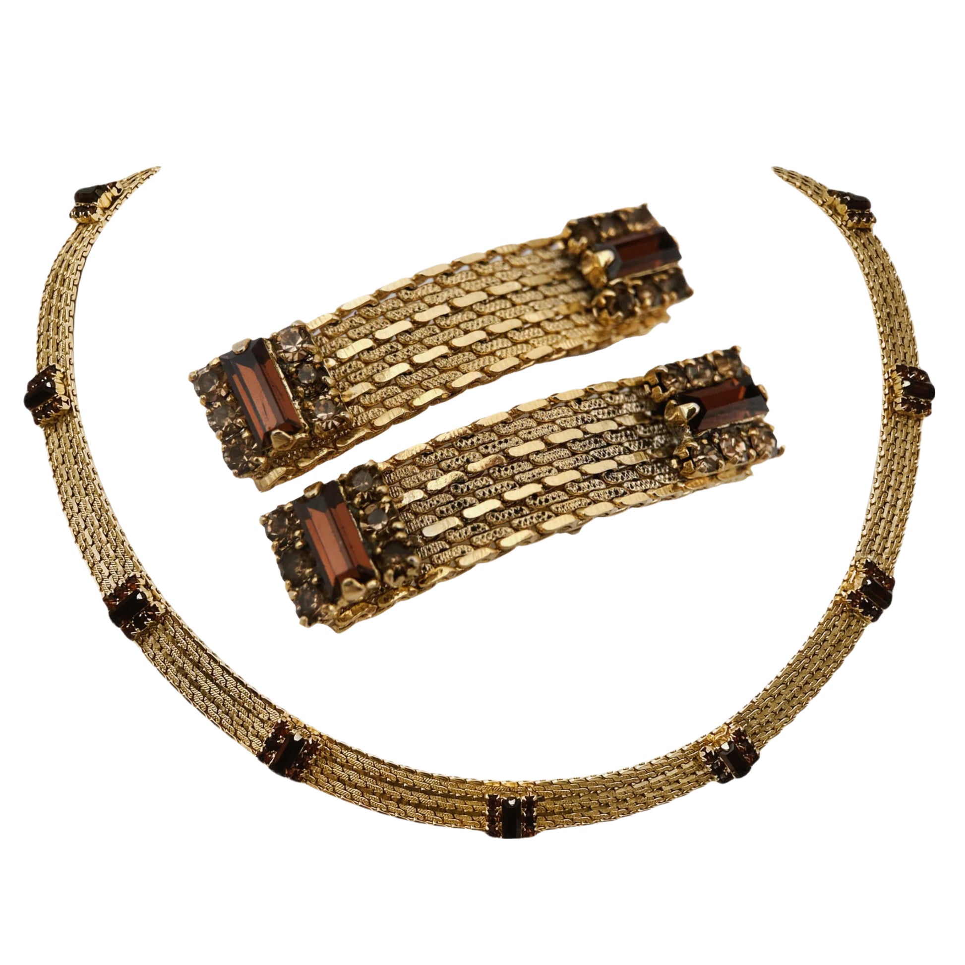 Elegantiškas ir puikiai išsilaikęs XX a. vidurio vintažinis papuošalų komplektas, sudarytas iš trumpo vėrinio (chokerio) ir klipsinių auskarų. Papuošalai pagaminti iš paauksuoto metalo, išsiskiriančio tekstūriniu grandinėlės pynimo paviršiumi („woven mesh link“) ir geometriniais akcentais. Vėrinys ir klipsai dekoruoti tamsiai rudos spalvos stačiakampiais „baguette cut“ kristalais, apsuptais mažesniais briaunuotais akmenukais. Akmenys primena „smoked topaz“ atspalvį – klasikinį šiltos elegancijos toną, itin populiarų 6-ajame dešimtmetyje. Tai gali būti Coro arba Napier gamintojų komplektas, sprendžiant pagal stilių ir užsegimų tipą, kuris yra identiškas to laikotarpio modeliams. Toks pynimo ir klipsų derinys buvo naudojamas tik aukštos kokybės gamintojų – Coro, Napier ir Trifari – todėl šis komplektas yra puikus XX a. vidurio amerikietiškos bižuterijos pavyzdys, derinantis inžinerinį tikslumą ir Art Deco įkvėptą geometriją. Nepažymėti papuošalai buvo skirti eksportui, ypač į Europą.