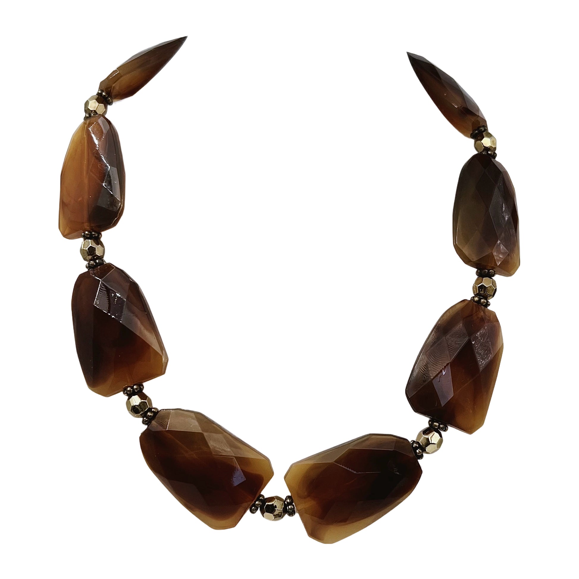 Šis vėrinys, nors ir nepažymėtas, pasižymi aiškiomis stilistinėmis savybėmis. Dideli, netaisyklingos formos, fasetuoti dūminio gintaro (arba agato) atspalvio karoliukai. Tikėtina, kad tai lucitas (aukštos kokybės akrilas) arba derva, imituojanti natūralų akmenį. Permatomumas ir spalvų perėjimas – būdingas rankiniu būdu tonuotoms sintetinėms medžiagoms. Tarpiniai elementai: auksaspalviai metalizuoti karoliukai, kurie sukuria kontrastą su rudais elementais. Spalva: sodri ruda su perėjimu į medaus, karamelės atspalvius. Aiškus “statement” (dominuojantis, išskirtinis) pobūdis – vėrinys masyvus, akį traukiantis.