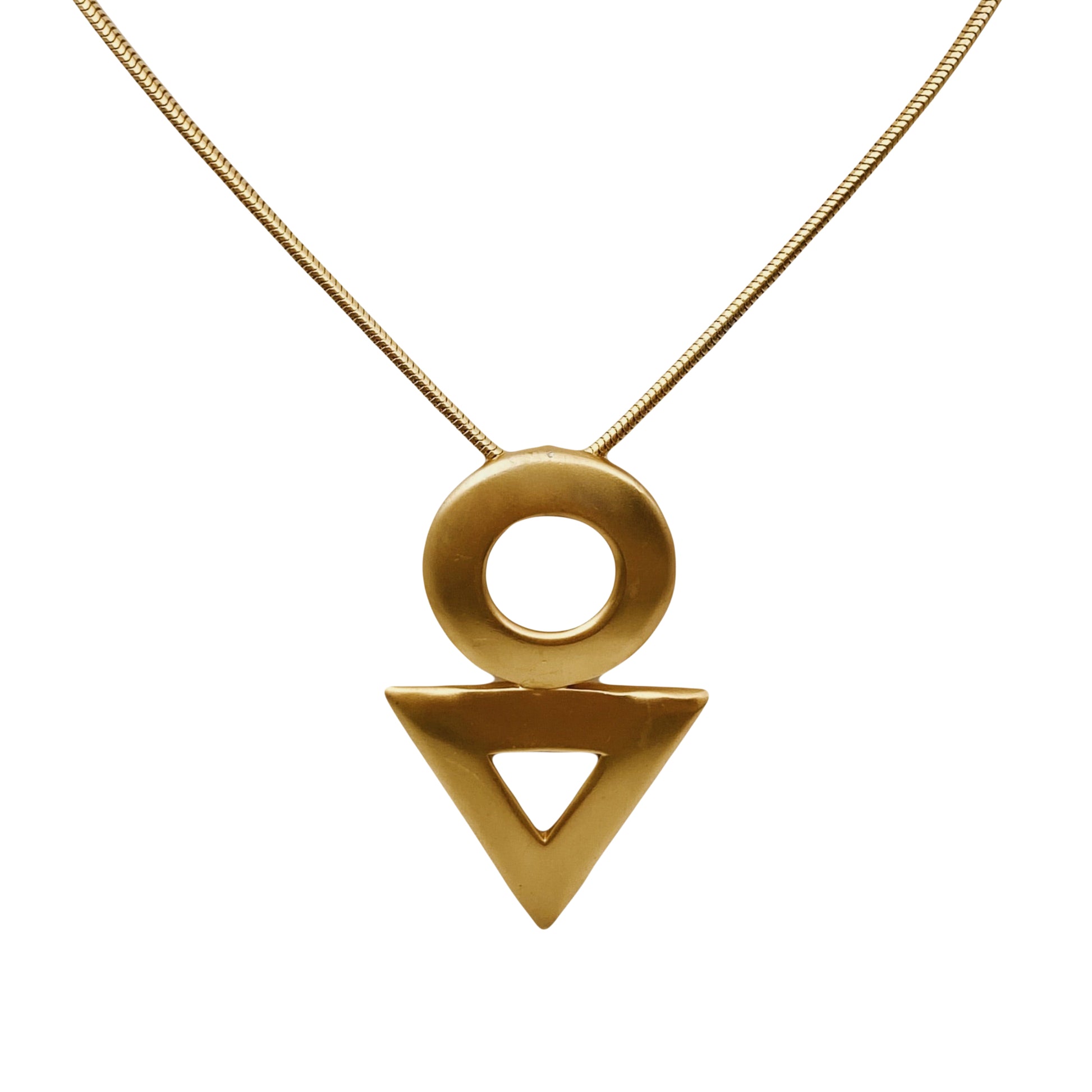 Tai „Anne Klein“ vėrinys su geometriniu pakabuku – apskritimo ir trikampio motyvais. Stilius – modernistinis, minimalistinis, būdingas 1980–1990 m. laikotarpiui, kai „Anne Klein“ kūrė drąsius, bet švarių formų aksesuarus.