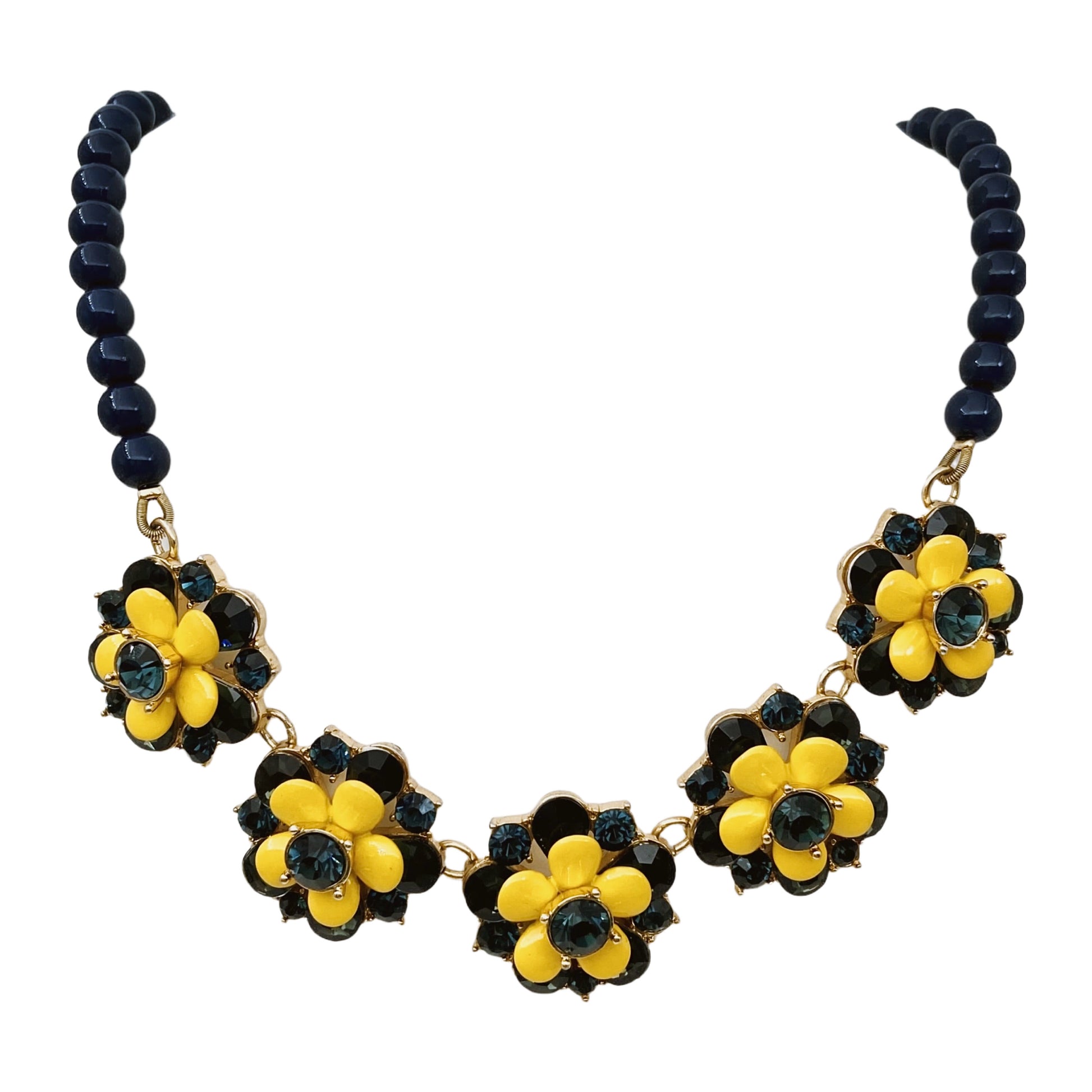 Stilingas TALBOTS vėrinys su ryškiu gėlių motyvu. Vėrinio centre – penki dideli gėlių formos elementai, dekoruoti geltonais emaliuotais žiedlapiais ir tamsiai mėlynais (safyriniais) stiklo kristalais. Kiekvienas gėlės centras papuoštas iškiliu briaunotu akmeniu, o kraštai – mažesniais kristalais. Vėrinio galinėje dalyje – tamsiai mėlyni karoliukai, užsegimas auksinės spalvos grandinėle su karabinu ir firminė TALBOTS žyma su įspaustu logotipu ir įstatytu mažyčiu kristalu.