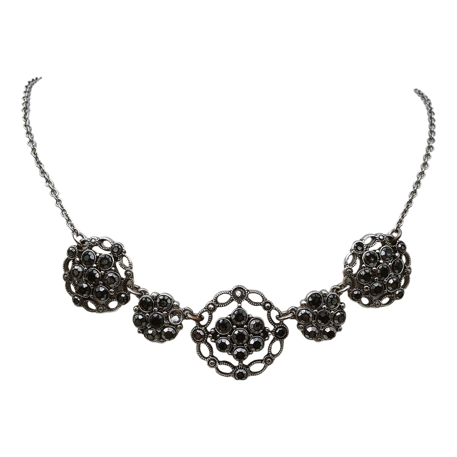 Tai JAV kilmės vėrinys, datuojamas 1950–1960 m., dekoruotas juodais stiklo akmenimis, imituojančiais hematitą arba viktorijos stilių. Kompozicija sudaryta iš simetriškai išdėstytų apvalių segmentų, dekoruotų daugybe fasetuotų juodų akmenukų (galimai hematito, „black glass“ arba „cut steel“). Ažūriniai ornamentai aplink centrinius elementus – tai būdinga filigrano įkvėptai arba vėlyvojo viktorijos laikotarpio replikai. “Spring ring” užsegimas – dažnas JAV vintažinės bižuterijos sprendimas nuo 1930-ųjų iki 1970-ųjų.