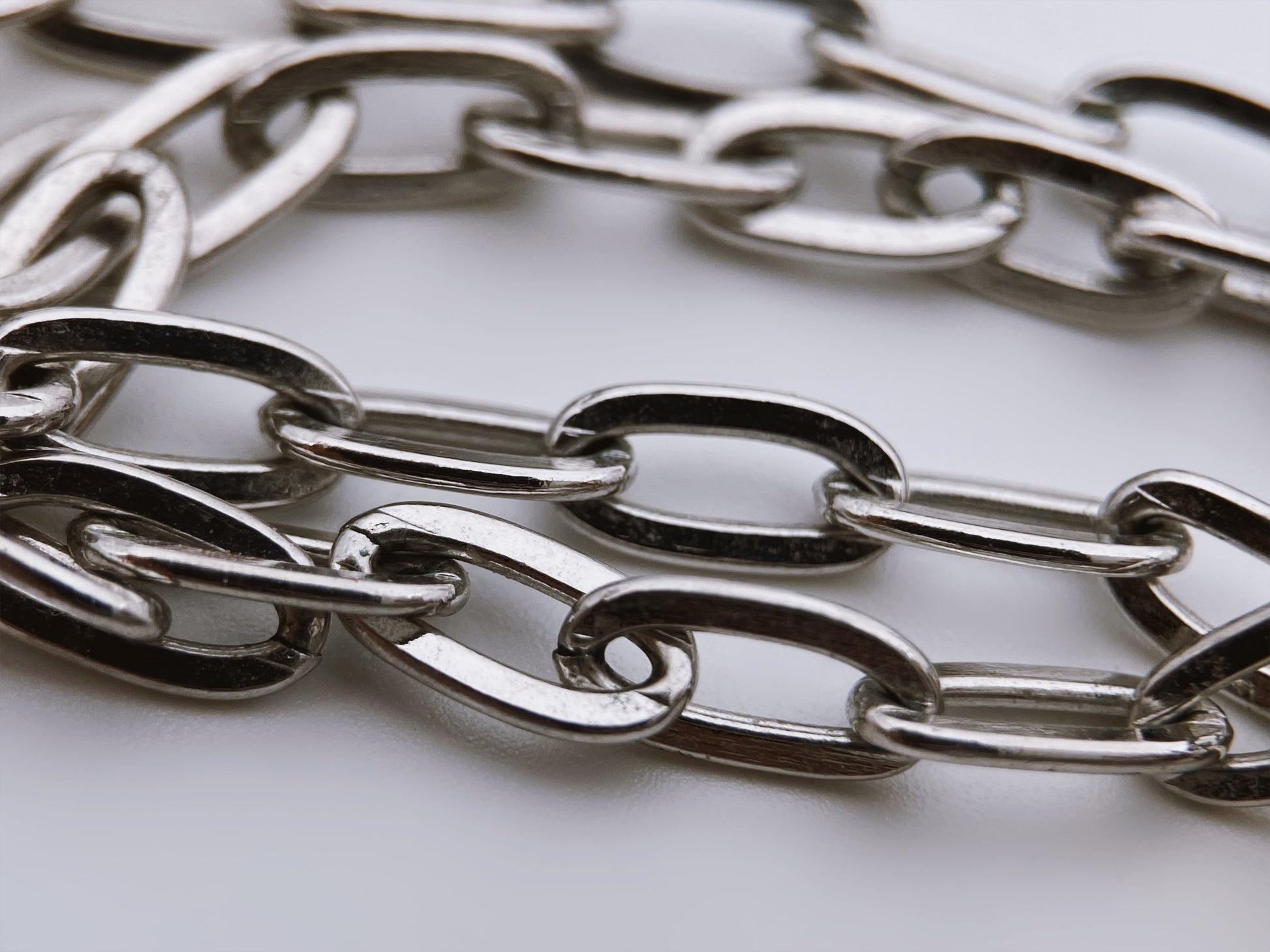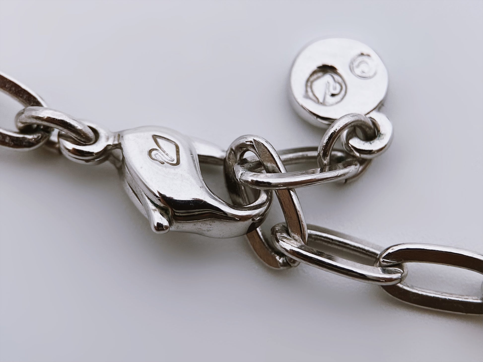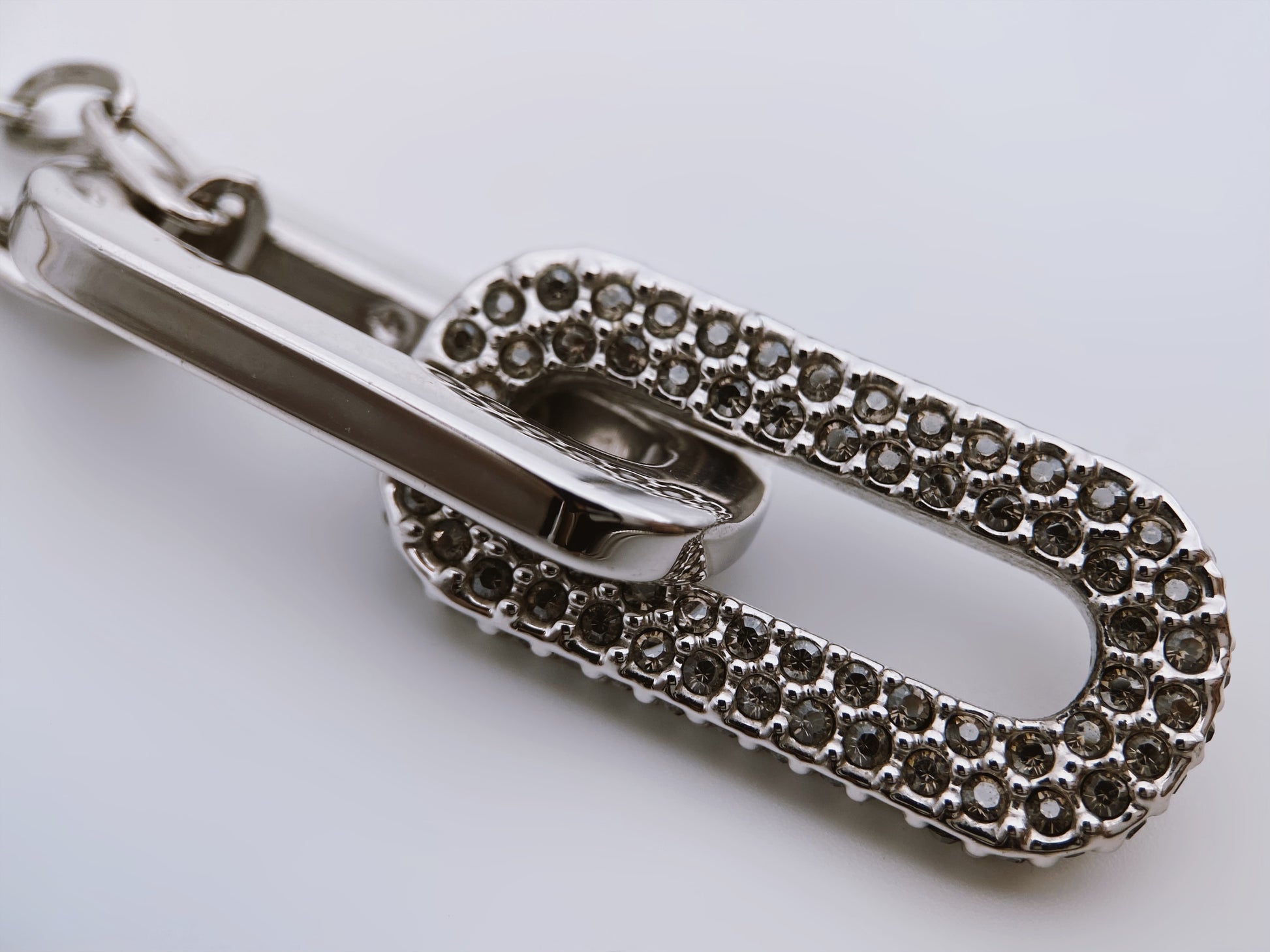 Sidabro spalvos metalas (dažniausiai rodžiu dengtas lydinys). Pakabukas: Dvigubas „paperclip“ narelis – vienas inkrustuotas skaidriais Swarovski kristalais. Plokščių ovalių narelių (paperclip tipo) grandinėlė. Stilius: Šiuolaikinis minimalistinis (fashion jewelry linija).