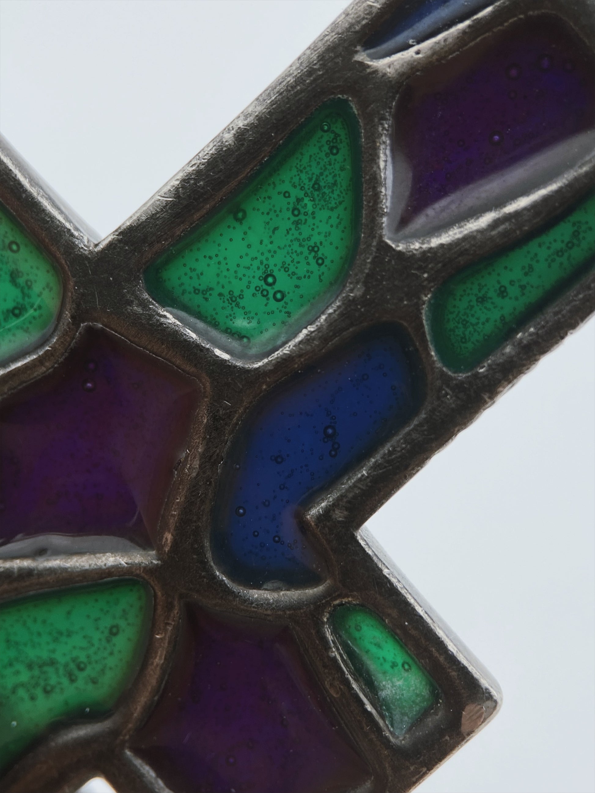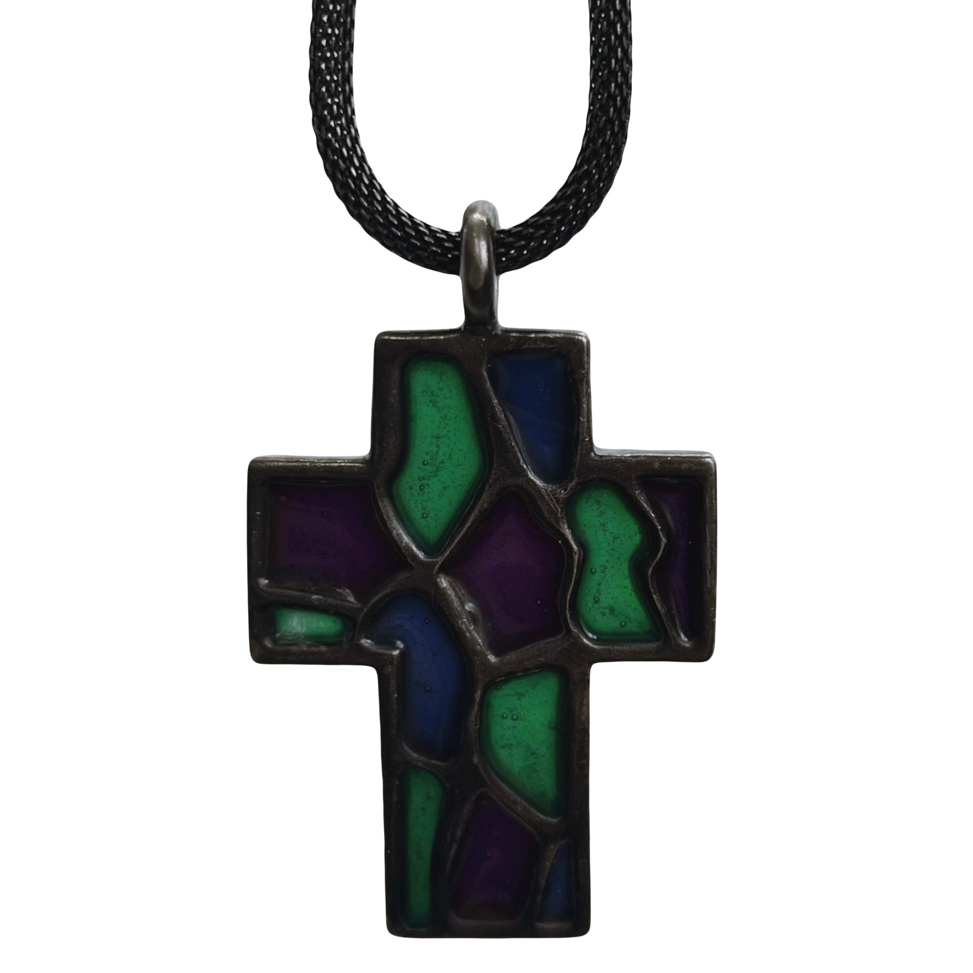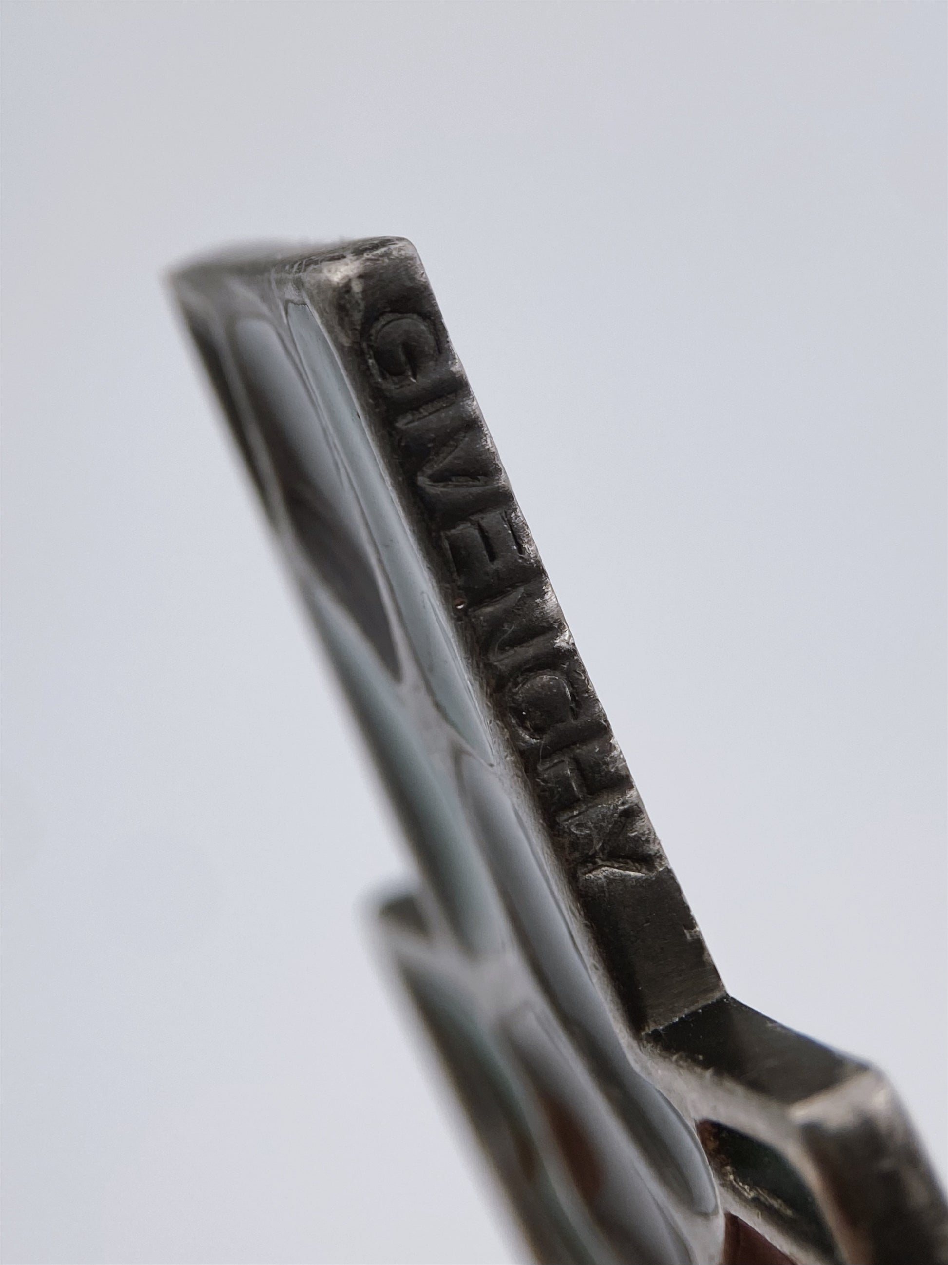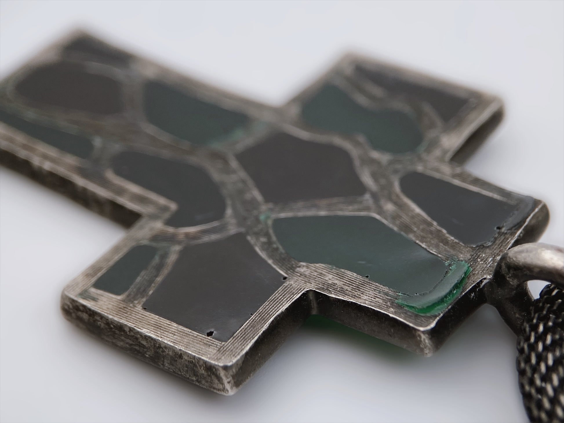 Išskirtinis “Givenchy“ bižuterijos vėrinys, datuojamas 1980–1990 m. laikotarpiu. Kryžiaus formos pakabukas dekoruotas vitražą primenančiu emaliu – žalios, mėlynos ir violetinės spalvos fragmentais, įlietais į tamsinto metalo rėmą. Ant pakabuko nugarėlės graviruotas „Givenchy“ vardas, o grandinėlės užsegimą puošia apvalus medalionas su klasikiniu dvigubo G logotipu.