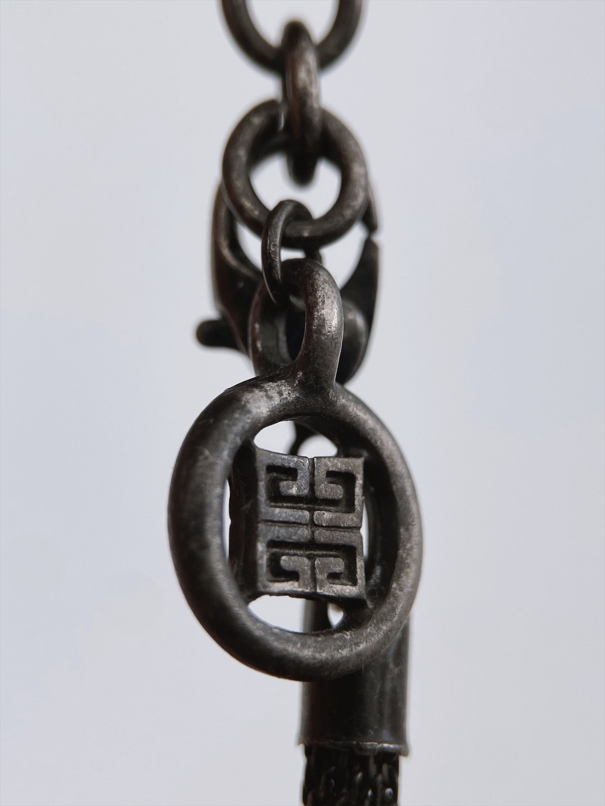 Sudėtis: emalis, metalo lydinys (žalvario arba cinko), padengtas tamsinto sidabro spalvos danga Būklė: labai gera Išmatavimai (grandinėlė): 50 cm Išmatavimai (pakabukas): 5,5 x 3,5 cm Spalva: pilka, žalia, mėlyna, violetinė Žymėjimas: “Givenchy” (ant pakabuko), GG logotipas (užsegimas) Šalis: Prancūzija Laikotarpis: 1980-1990 metai Rinkos vertė: 180-250 EUR