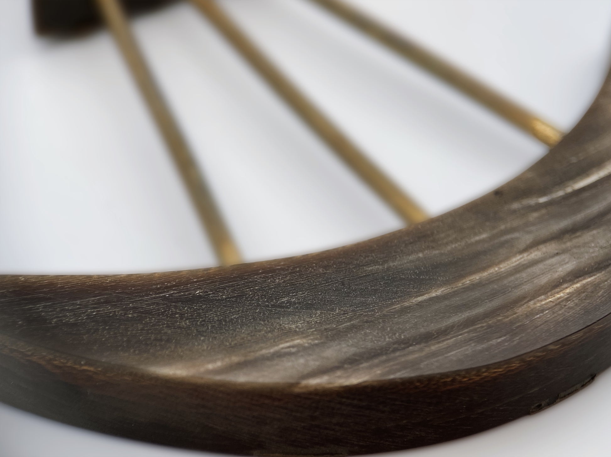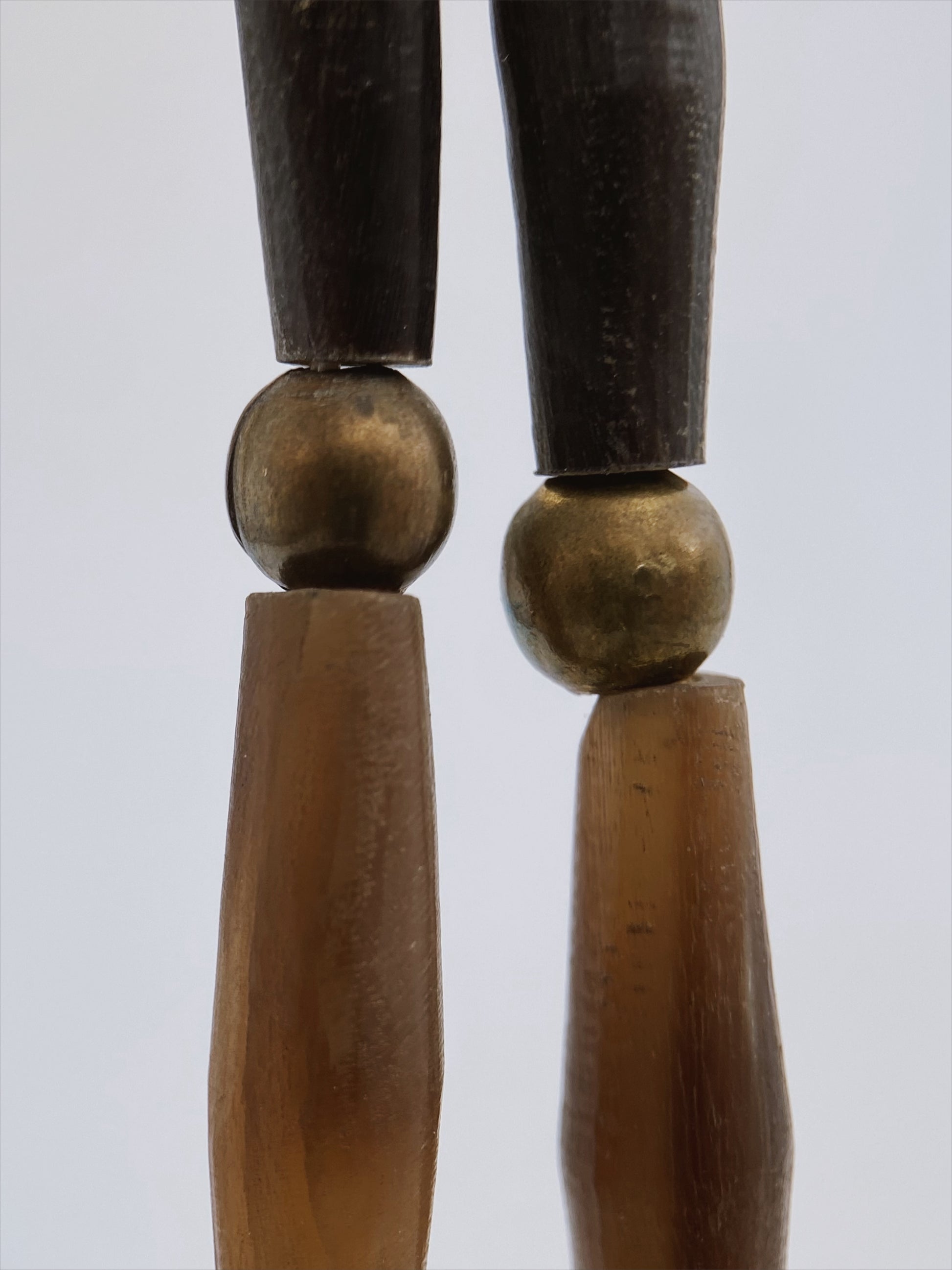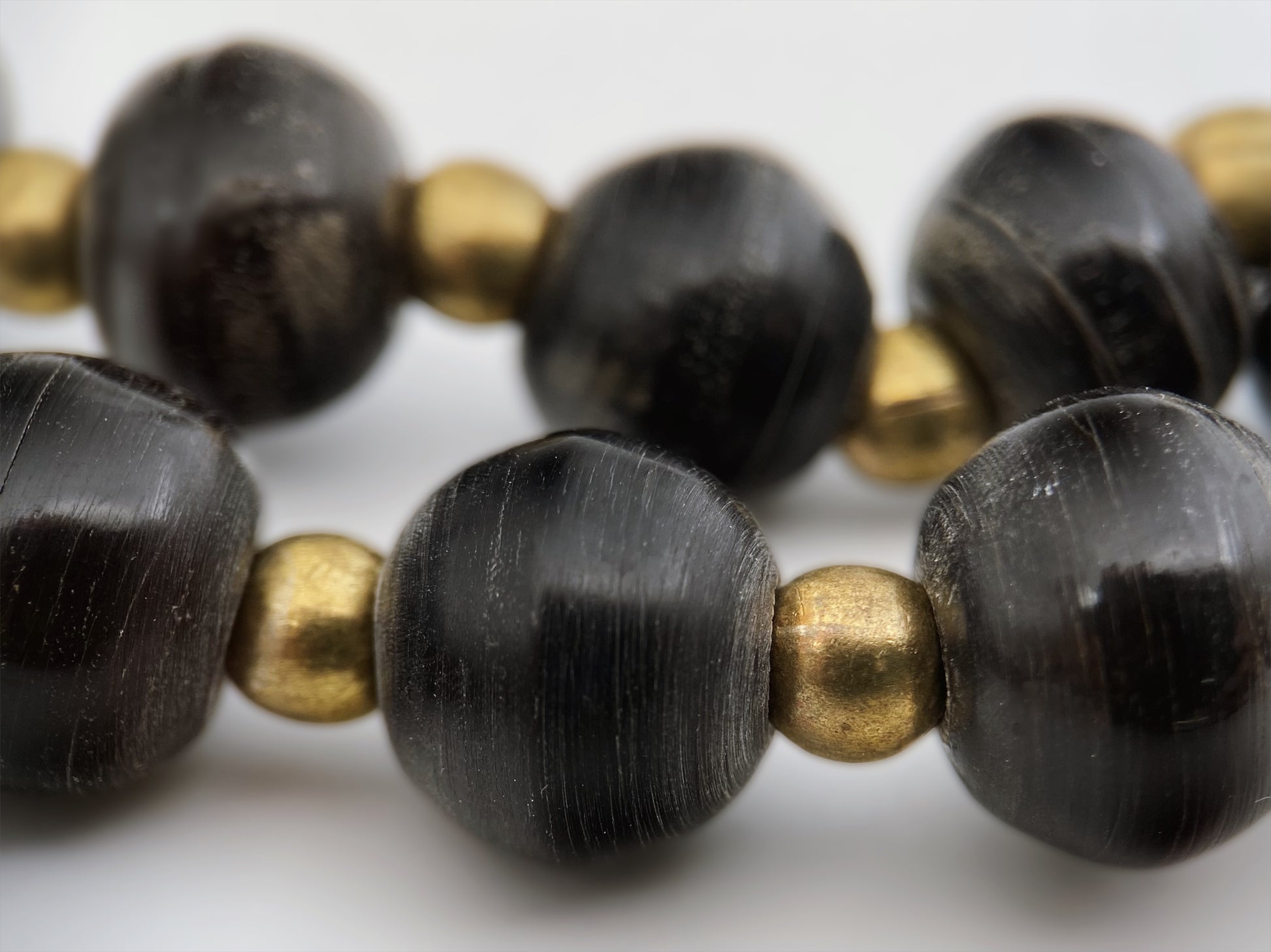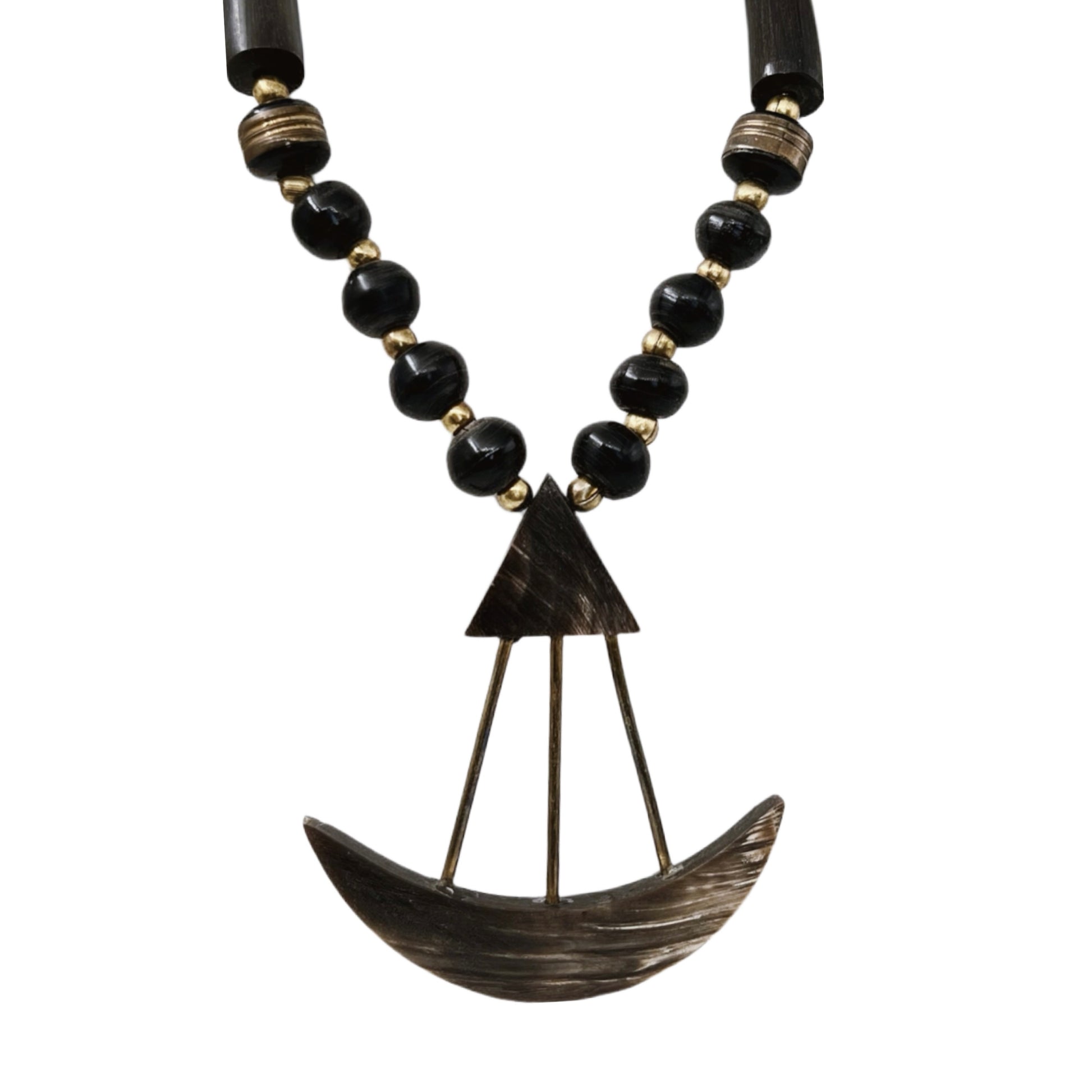 Šis vėrinys turi vintažinio ir rankų darbo etninio dizaino požymių, o pagrindinis jo akcentas – stilizuotas pakabukas, greičiausiai pagamintas iš natūralaus rago. Pagrindinis pakabukas (mėnulio formos ir trikampis virš jo) – natūralus ragas, su būdingu dryžuotu paviršiumi. Juodi karoliukai – iš rago, derinami su žalvarinėmis tarp detalėmis. Stilius: etniškai įkvėptas (stilizuotas afrikietiškas arba tribališkai modernistinis), minimalistinis, archajiškas-meno objektas – panašus į 1970–1980 m. bohemiškos mados kryptis. Šis vėrinys gali būti importuotas kaip etninis kūrinys (pvz., iš Afrikos ar Indijos), parduotas JAV rinkai kaip egzotinis rankų darbo papuošalas arba vietinis amerikiečių modernistinis kūrinys, įkvėptas “tribal” estetikos – tai būdinga menininkų bendruomenėms Kalifornijoje ar Niujorke.
