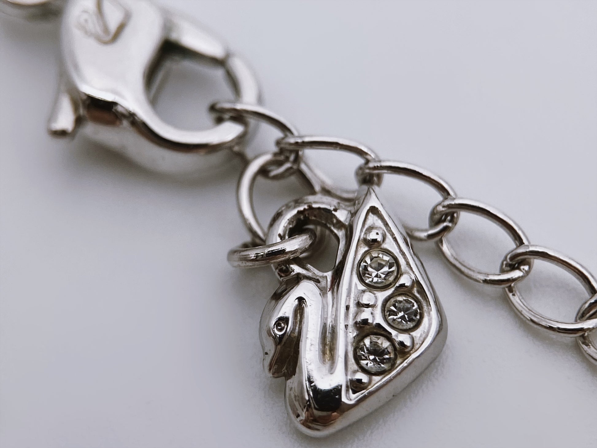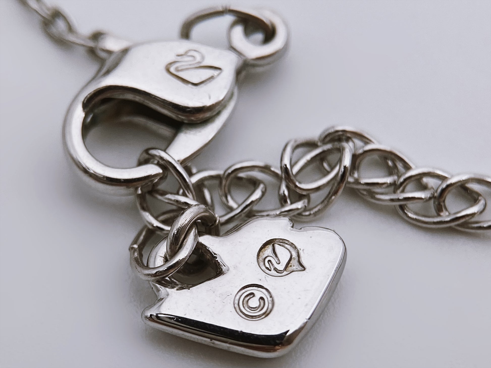 Šis vėrinys – tai originalus Swarovski papuošalas, kaip aiškiai matyti iš gulbės formos žymėjimo – tai Swarovski logotipas, naudojamas nuo 1988 m. Logotipas yra ir ant užsegimo, ir ant pakabuko. Pakabukas: dvigubos širdelės formos – vidinė ir išorinė, puoštos skaidriais ir rožiniais Swarovski kristalais, centre – didesnis kriaušės formos akmuo.
