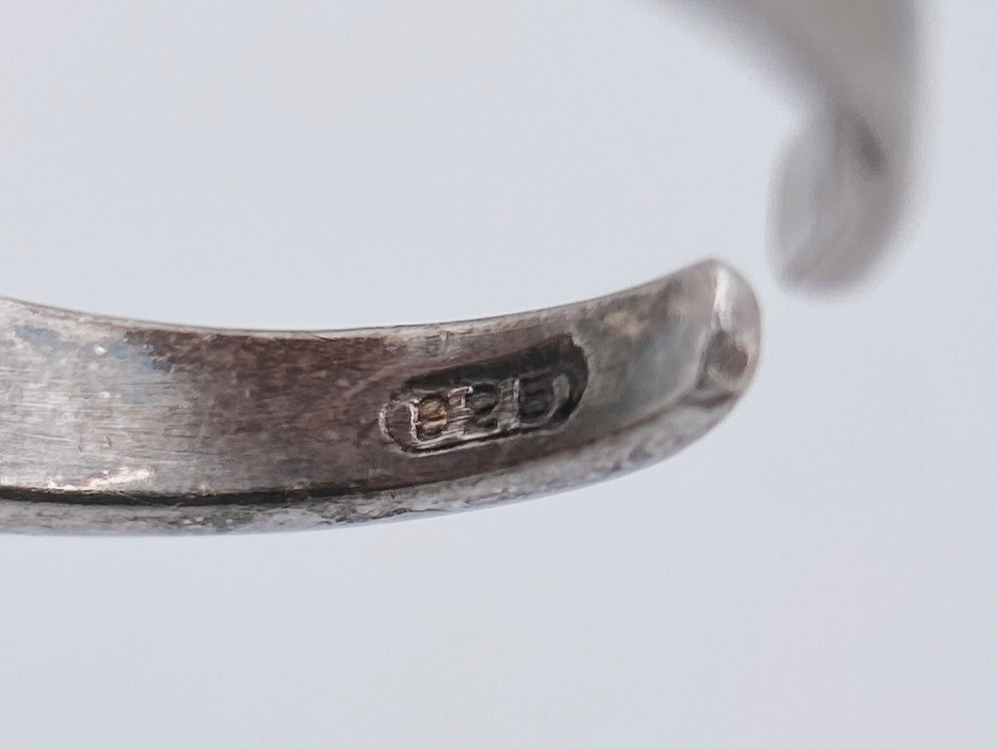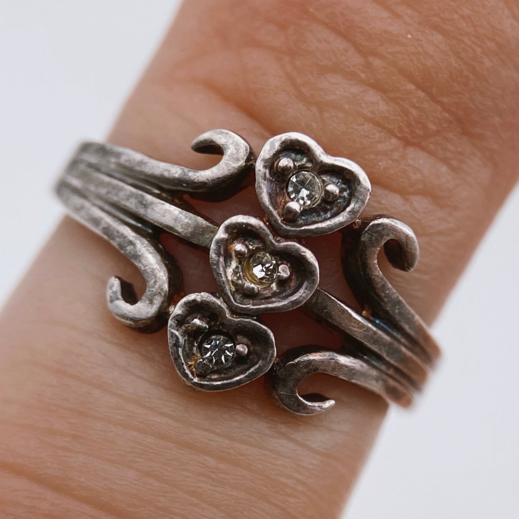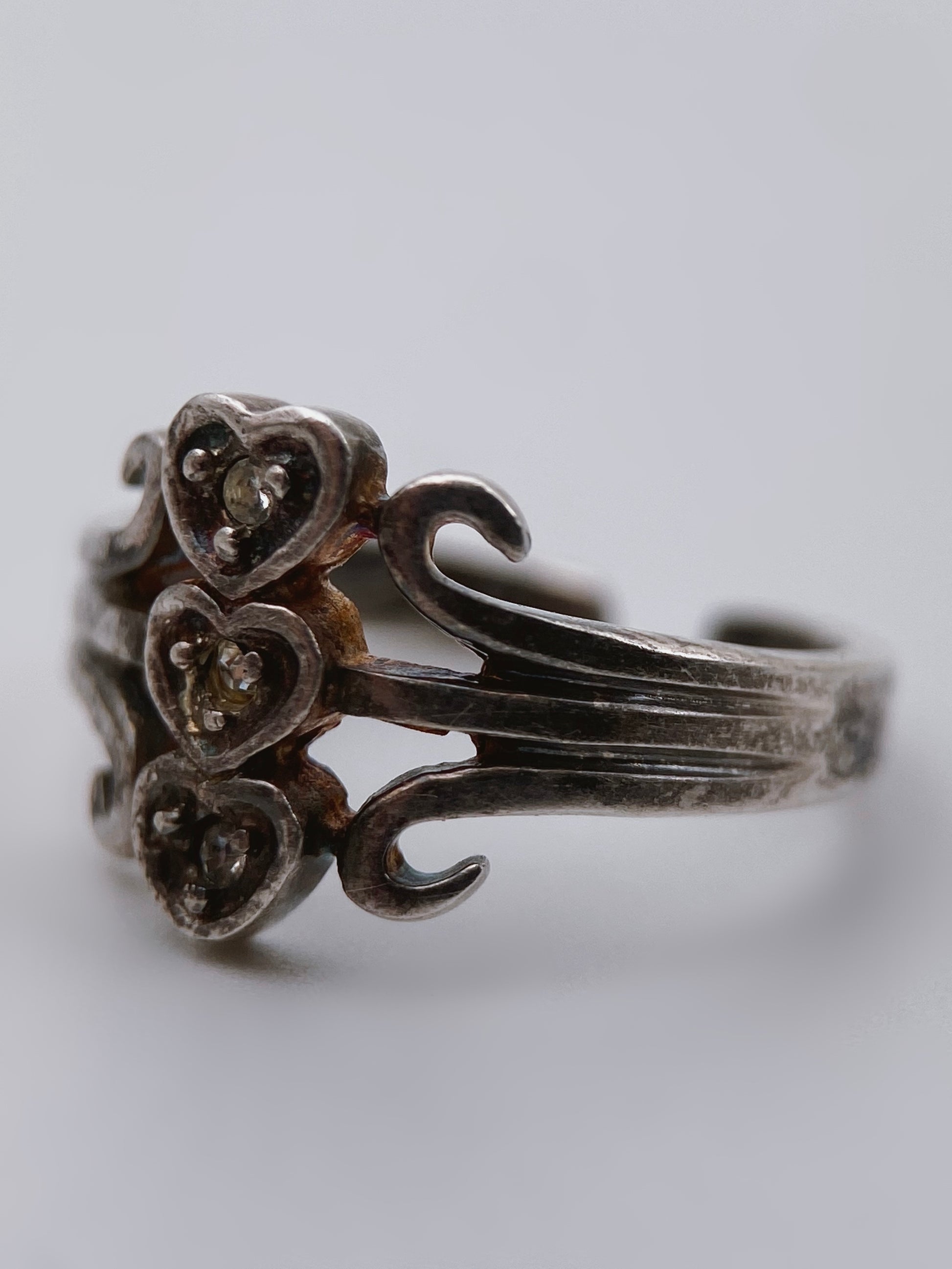 AVON 925 žiedas iš sidabro, dekoruotas trimis širdelėmis, kurių viduje įstatyti skaidrūs briaunuoti kristalai (greičiausiai stiklas arba cirkonis). Žiedas turi oksiduotą, sendintą paviršių, kuris išryškina ornamentus ir suteikia jam romantišką, vintažinį įvaizdį.