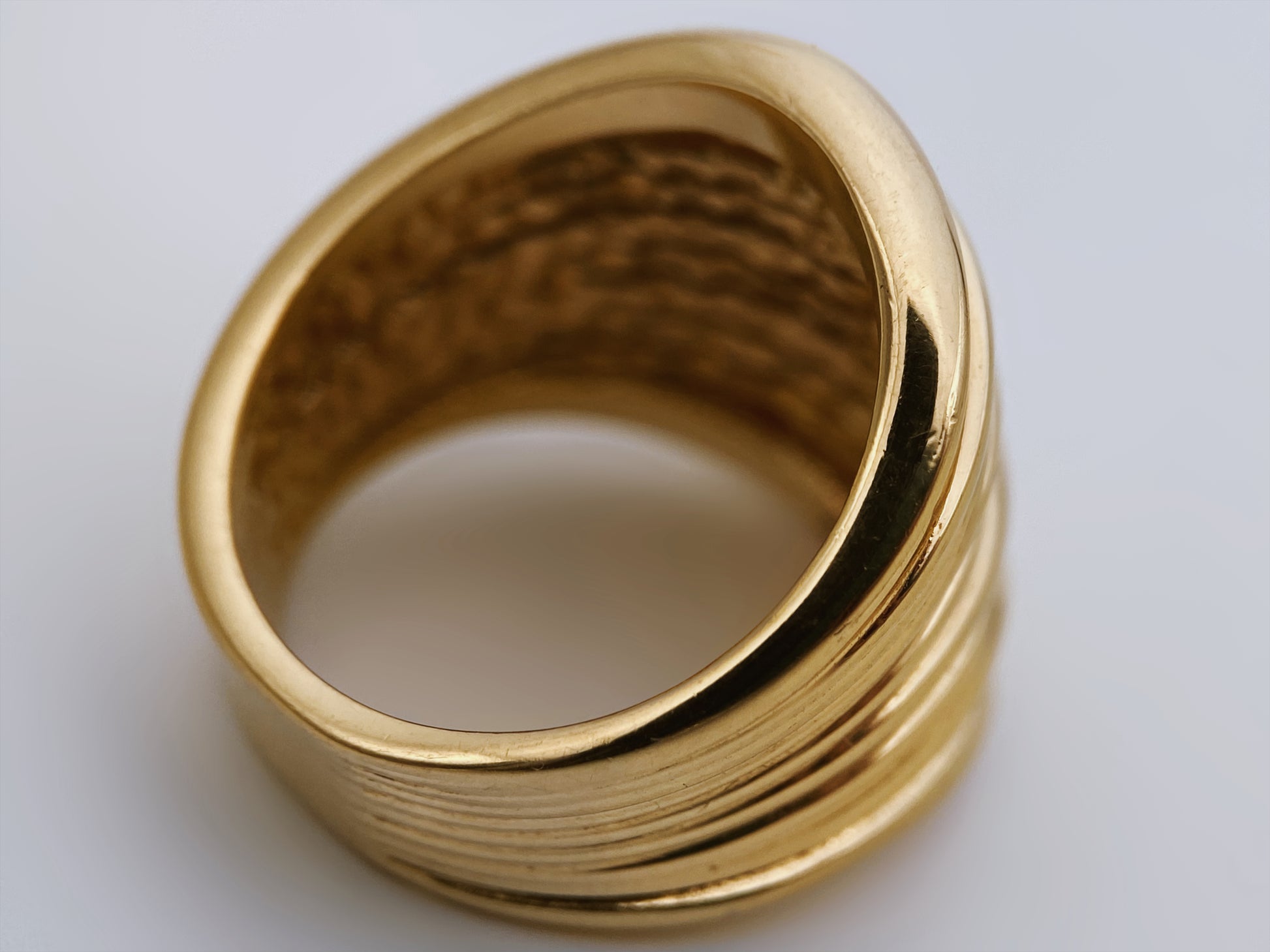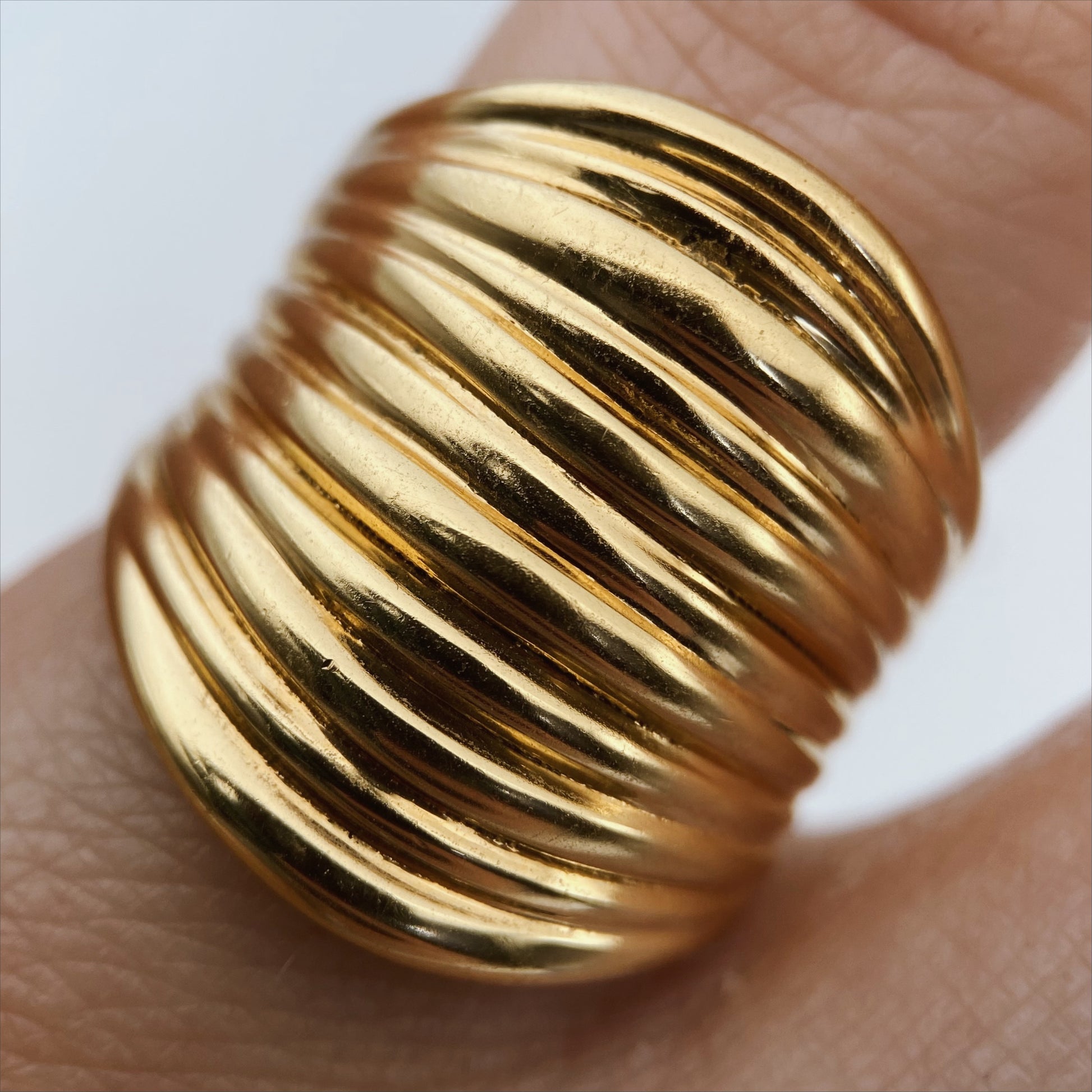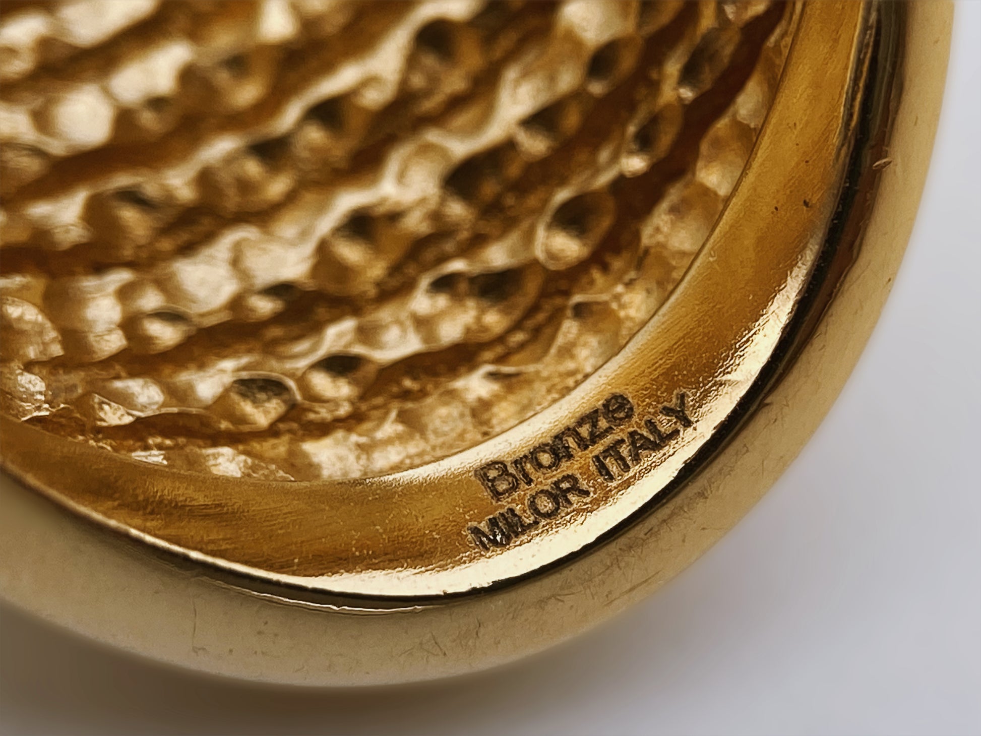 MILOR – garsus Italijos juvelyrikos prekinis ženklas, įkurtas Milane 1955 m., žinomas dėl aukštos kokybės sidabro, bronzos ir paauksuotos bižuterijos. Šis žiedas yra pagamintas iš bronzos, padengtos auksu (dažniausiai 18K arba 24K dengimas). Kupolo (bombe) stiliaus žiedas, su vertikaliomis bangelėmis (fluted / ribbed design). Vidus: tekstūruotas paviršius – MILOR dažnai naudoja šį būdą, kad papuošalas būtų lengvas bet tvirtas.