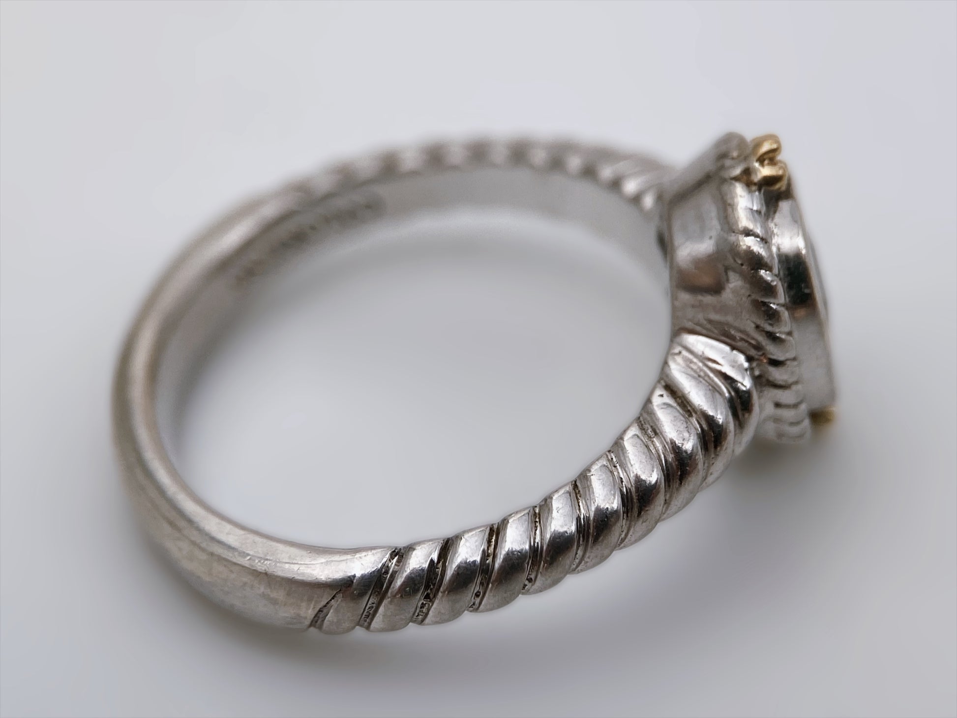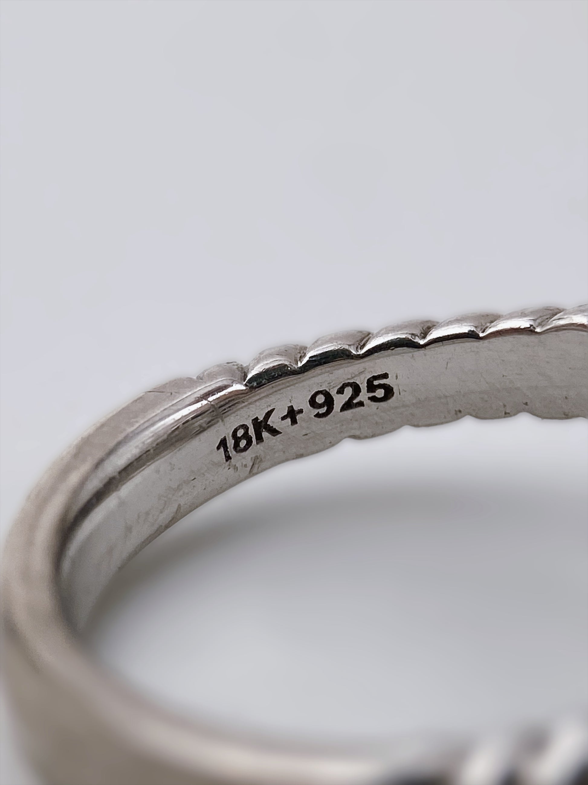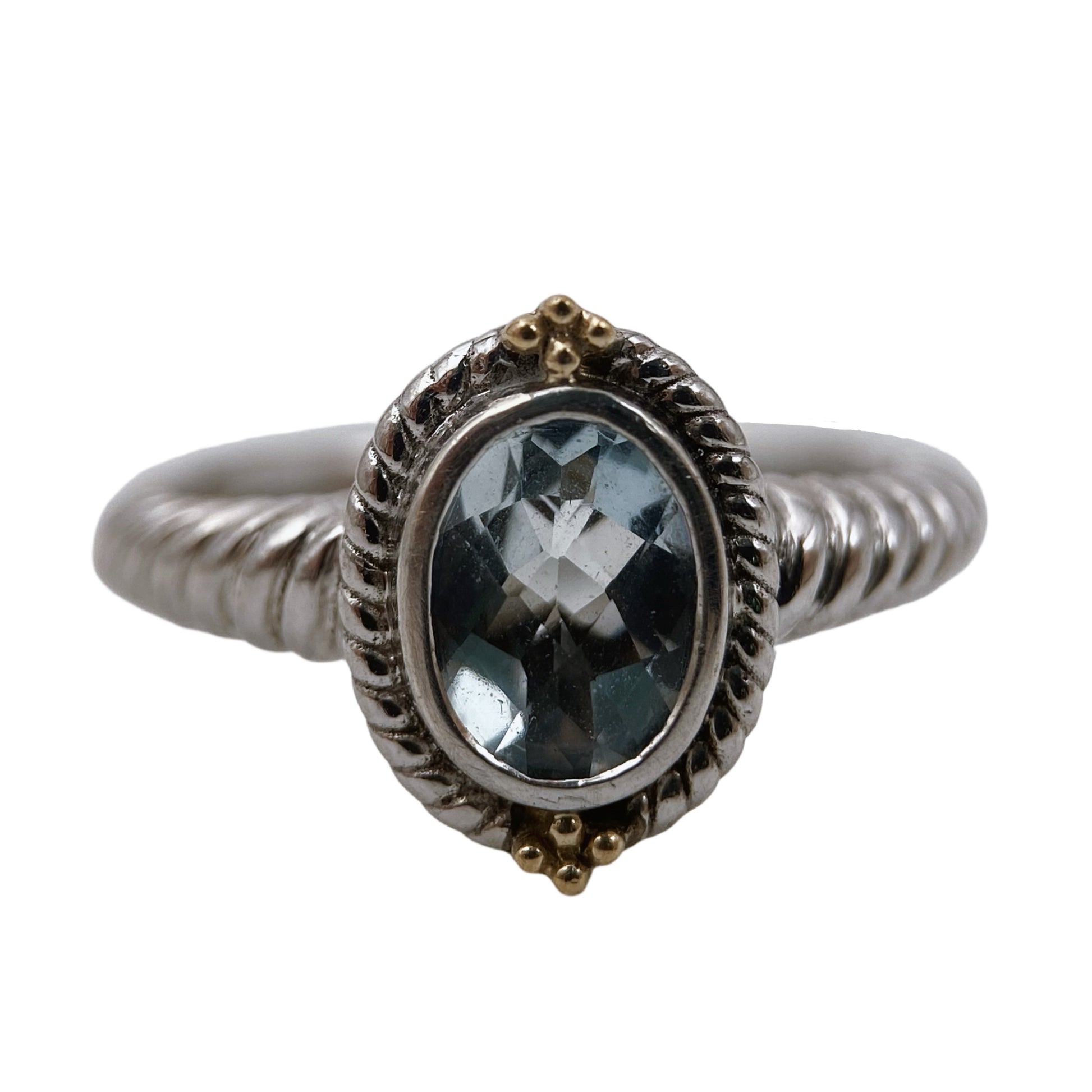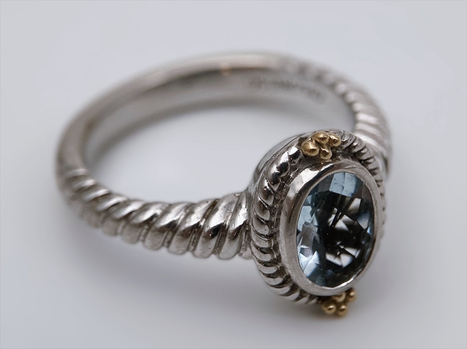 Sudėtis: sidabras, auksas, topazas arba akvamarinas Būklė: labai gera Vidinės dalies skersmuo: 17,5 mm Dydis: 7 (JAV) Svoris: 4,5 g Spalva: sidabro, aukso, mėlyna Žymėjimas: "18K 925, Colore | SG” Šalis: JAV Laikotarpis: 2000-2010 metai Rinkos vertė: 250-350 EUR
